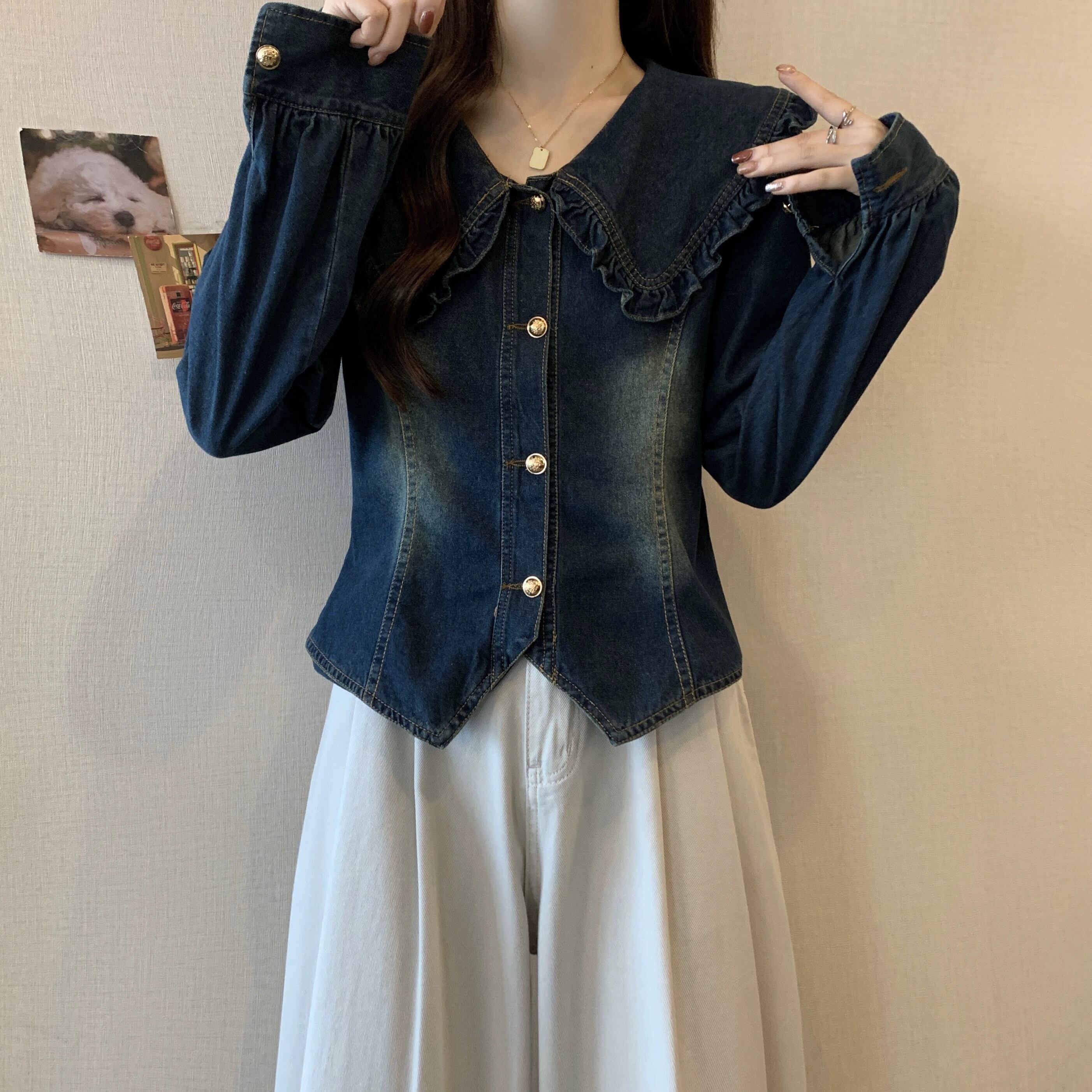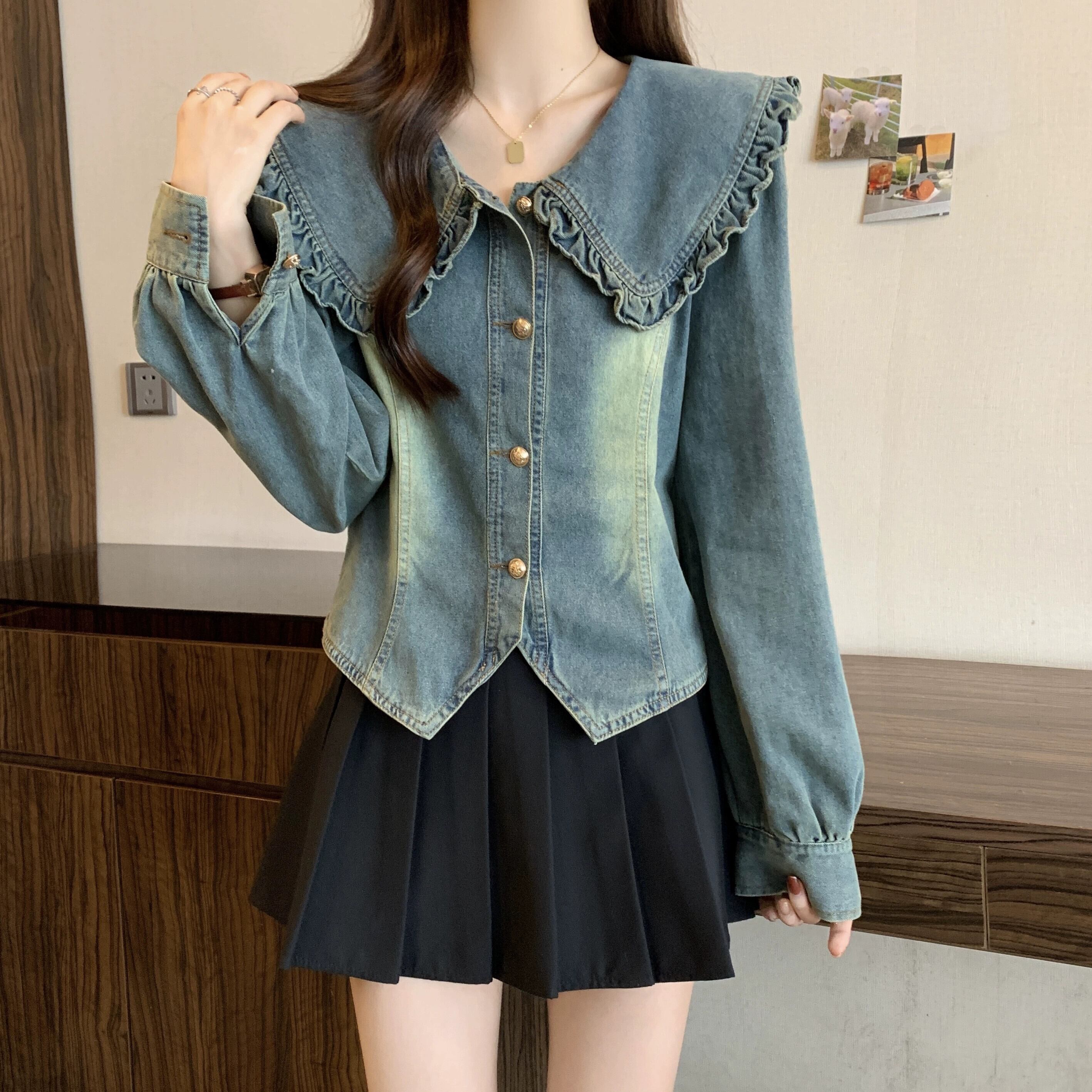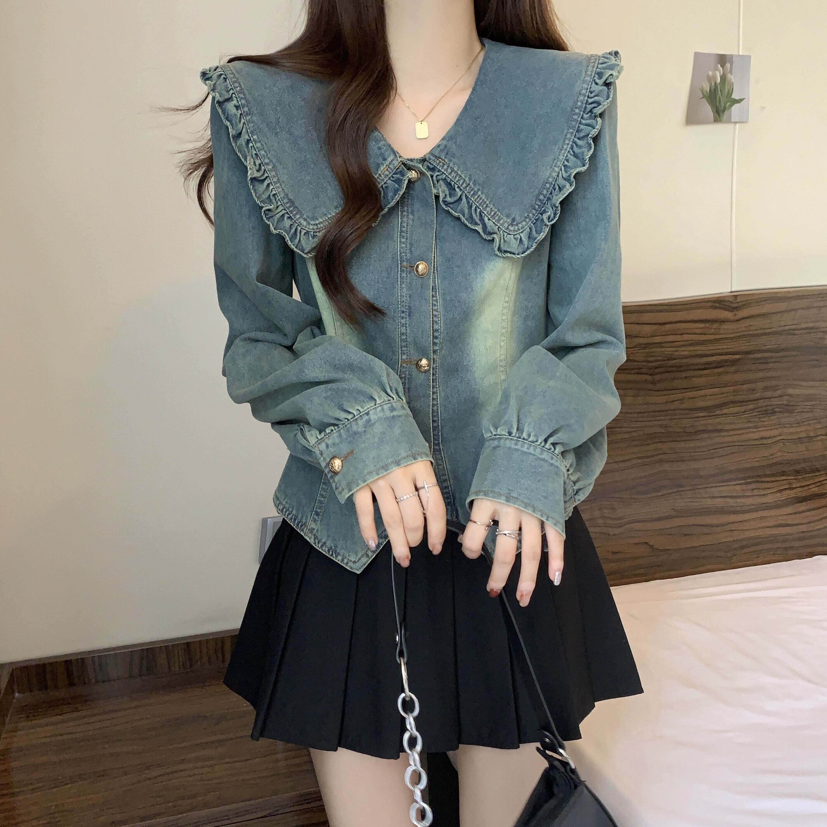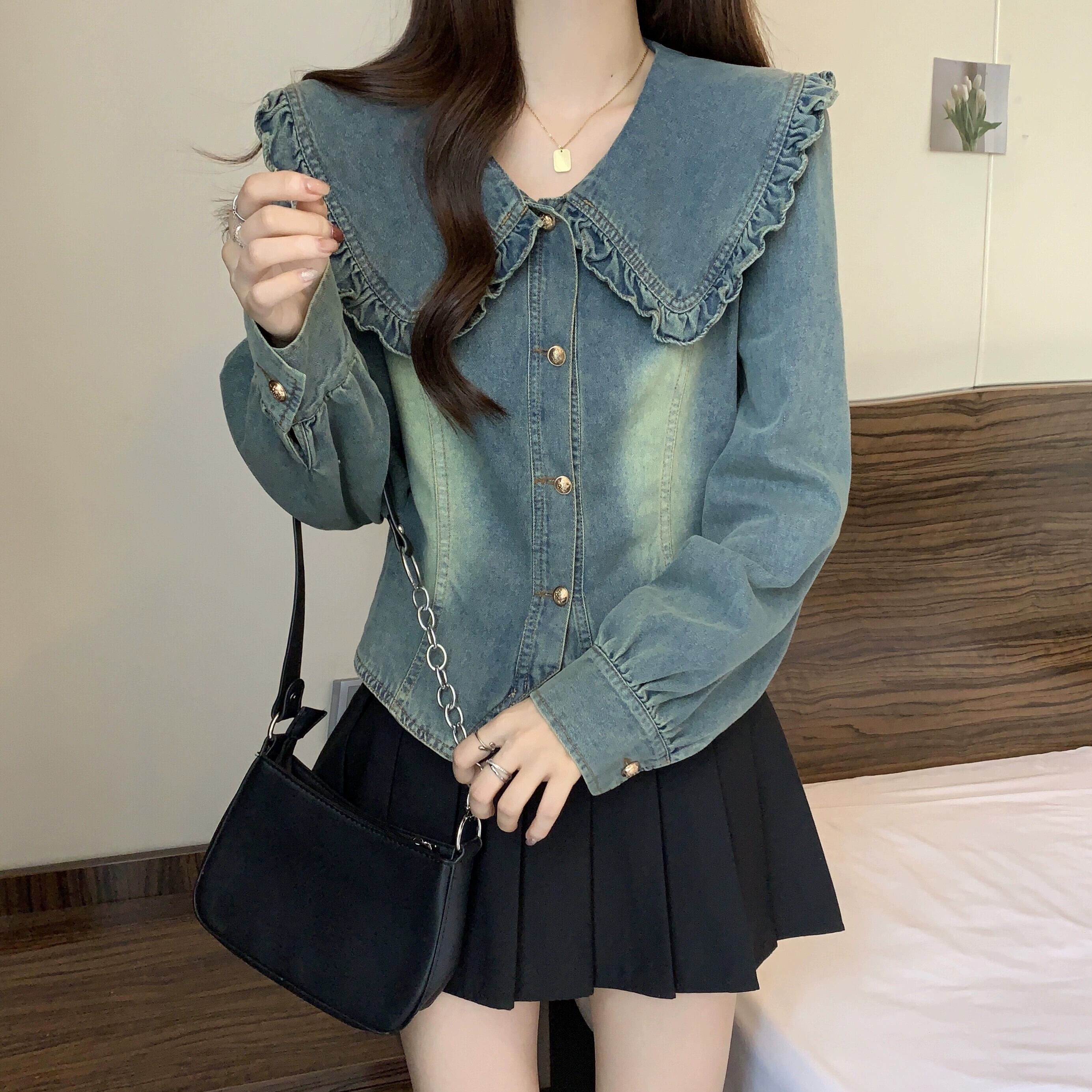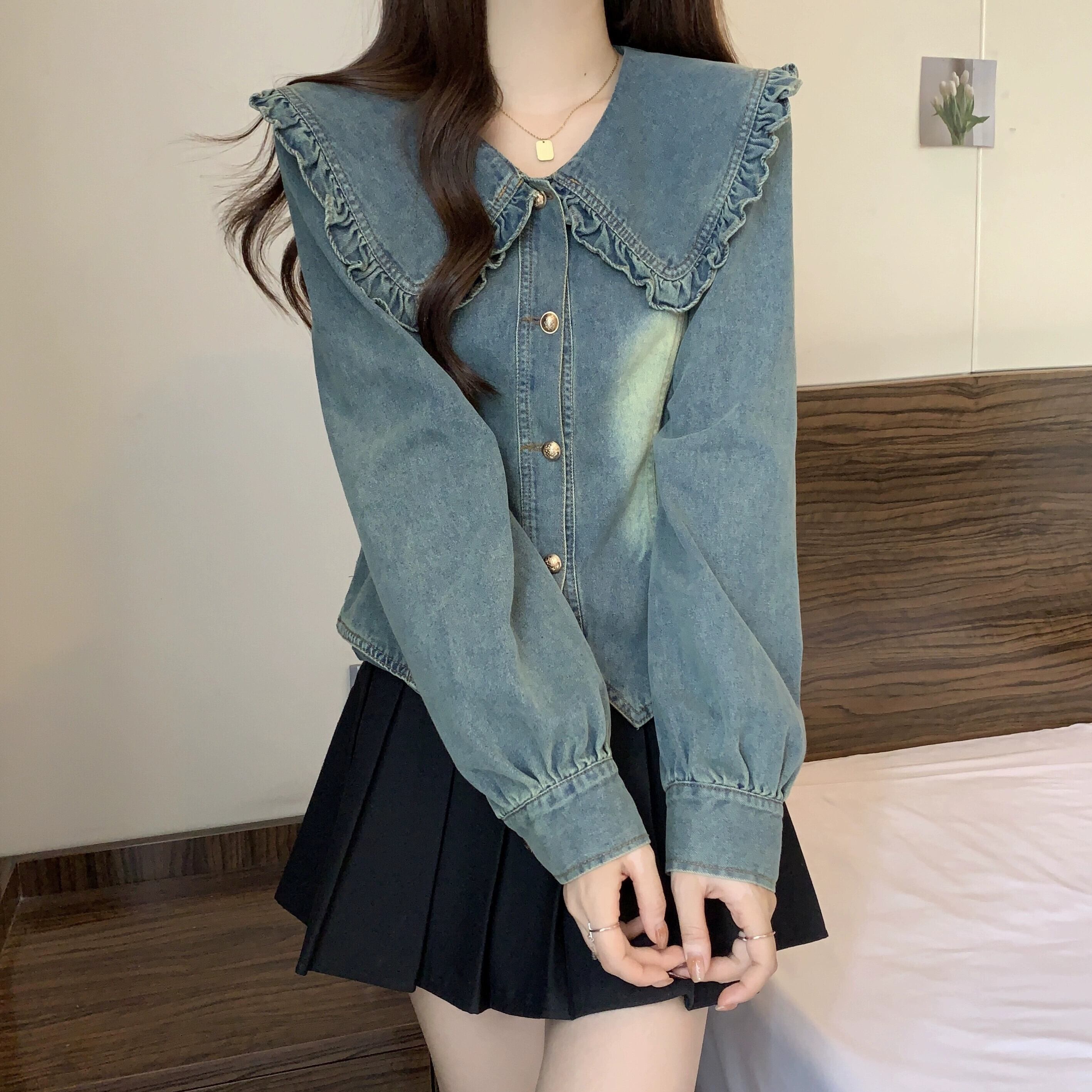プラスサイズの婦人服 2023 ファットシスター秋の新スタイルの人形の襟レトロなダメージデニムシャツ真菌エッジスリムトップ 大きめサイズ オータム 秋物 8884193276589498