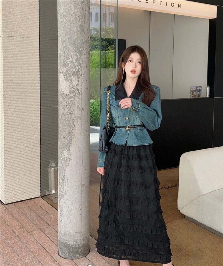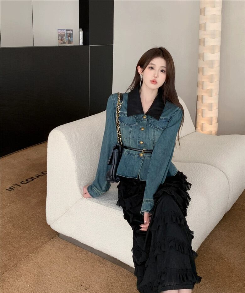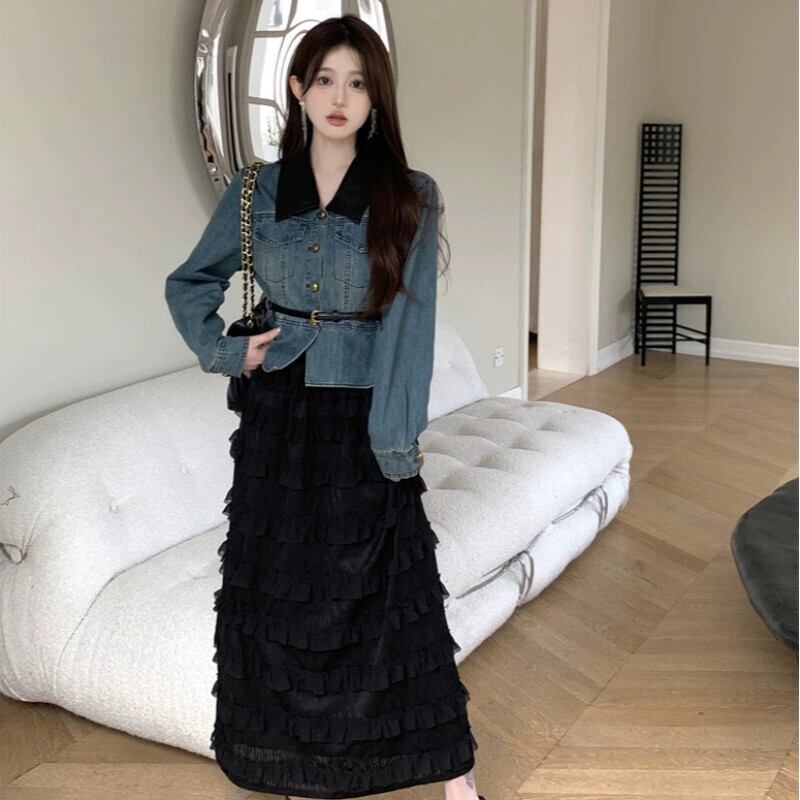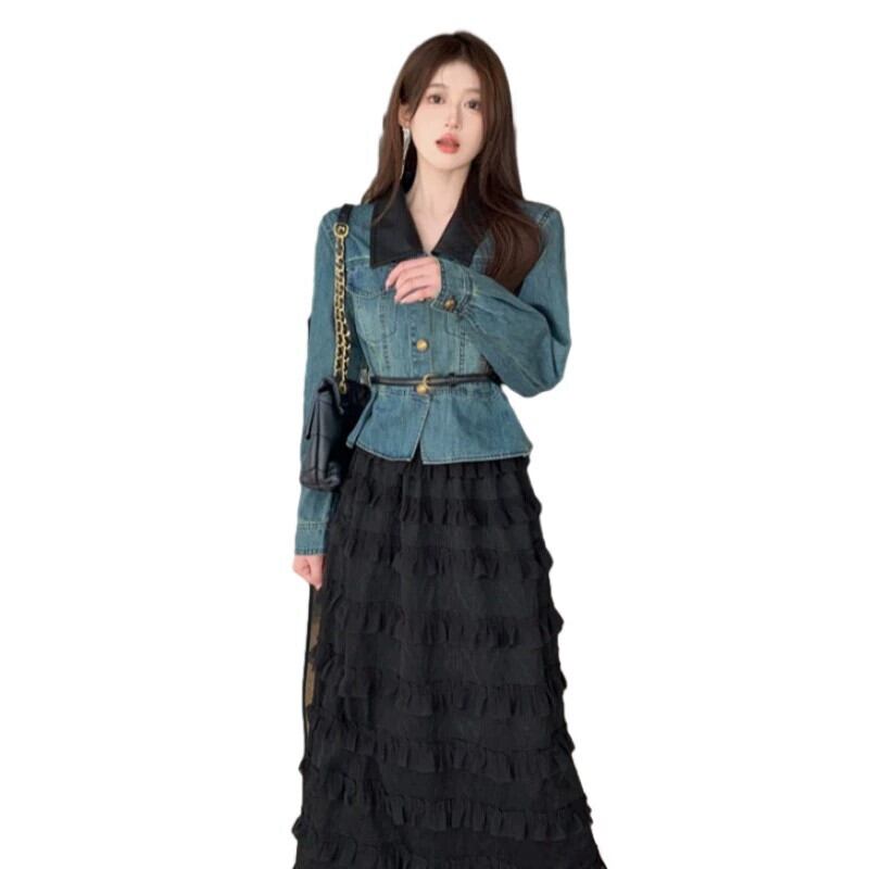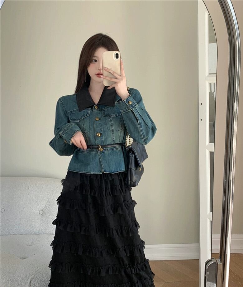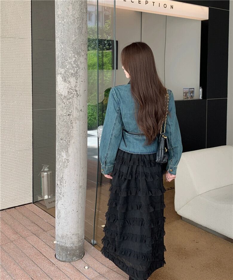 色:シングルブラックケーキスカート,シングルデニムシャツ