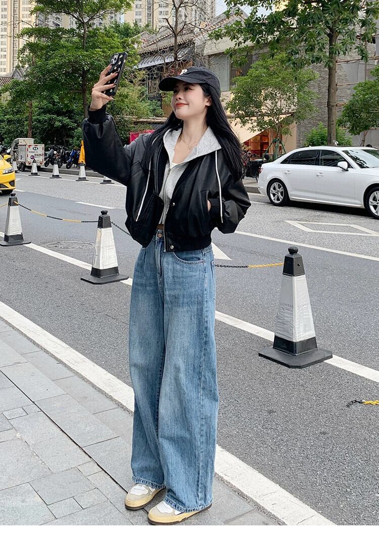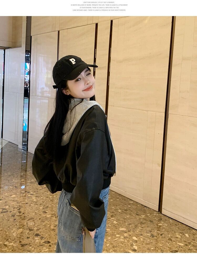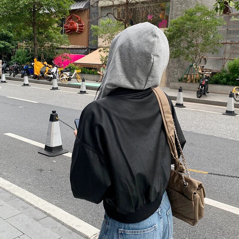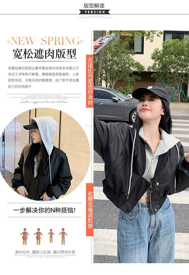プラスサイズの婦人服 2023 流行の秋の新ファットシスターファッションフード付きスモールレザージャケット偽ツーピースショートレザージャケットコート 大きめサイズ オータム 秋物 8884147522973449