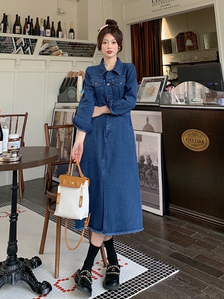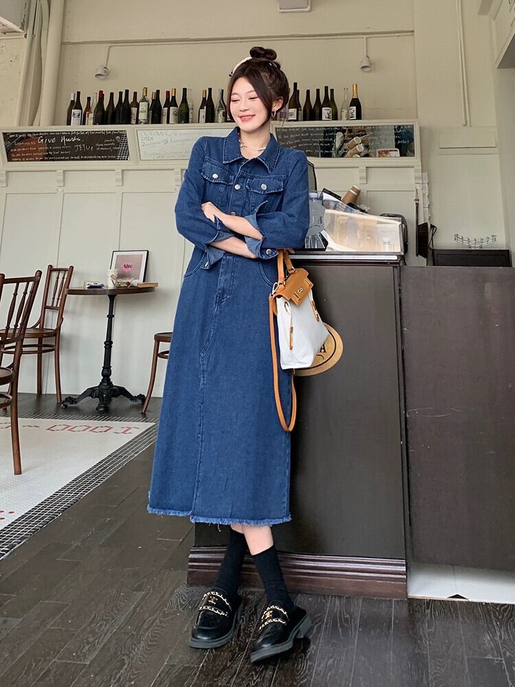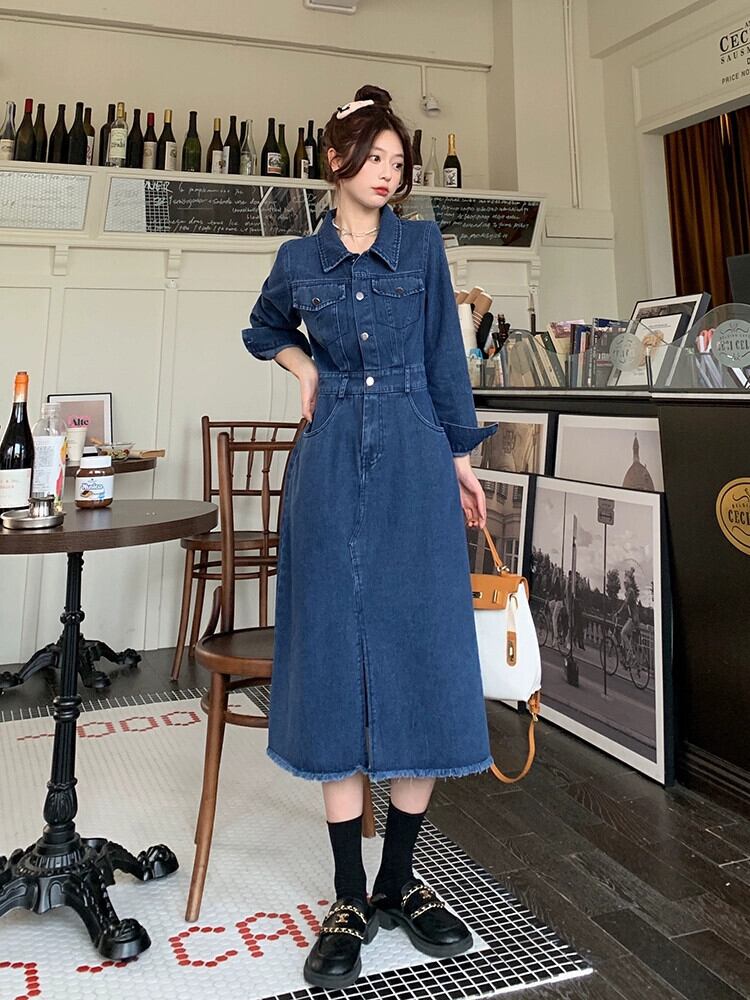 プラスサイズの婦人服 2023 脂肪姉妹秋の新ファッションレトロ長袖スリムロングスカートスリットデニムドレス 大きめサイズ オータム 秋物 8884135948391134