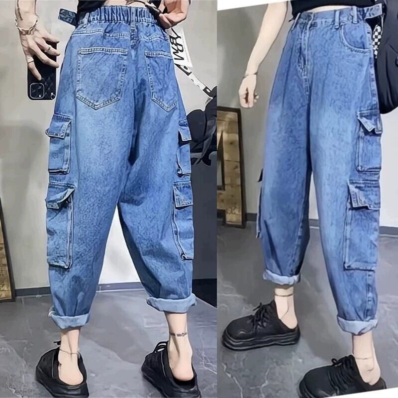 プラスサイズの婦人服 2023 ファットシスター秋服新しいハーレムデニムマルチポケットオーバーオールハイウエストルーズキャロットパンツ ハイウェスト 大きめサイズ オータム 秋物 ポケット多め 8884154778954784