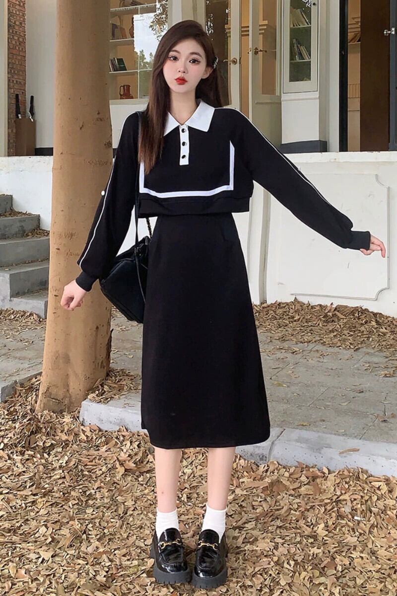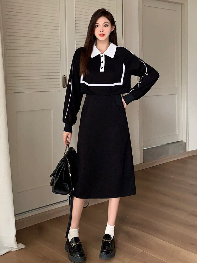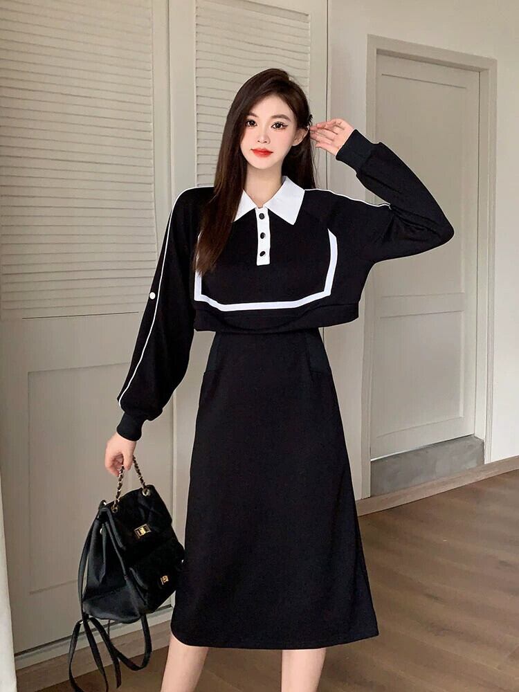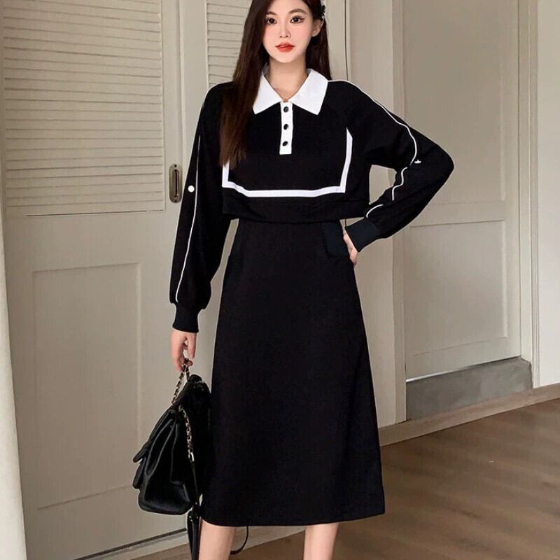 プラスサイズの婦人服 2023 トレンディな秋の新スタイル脂肪気質ファッションミッドレングススカート痩身偽ツーピース長袖ドレス ロング 大きめサイズ オータム 秋物 8884199570137101