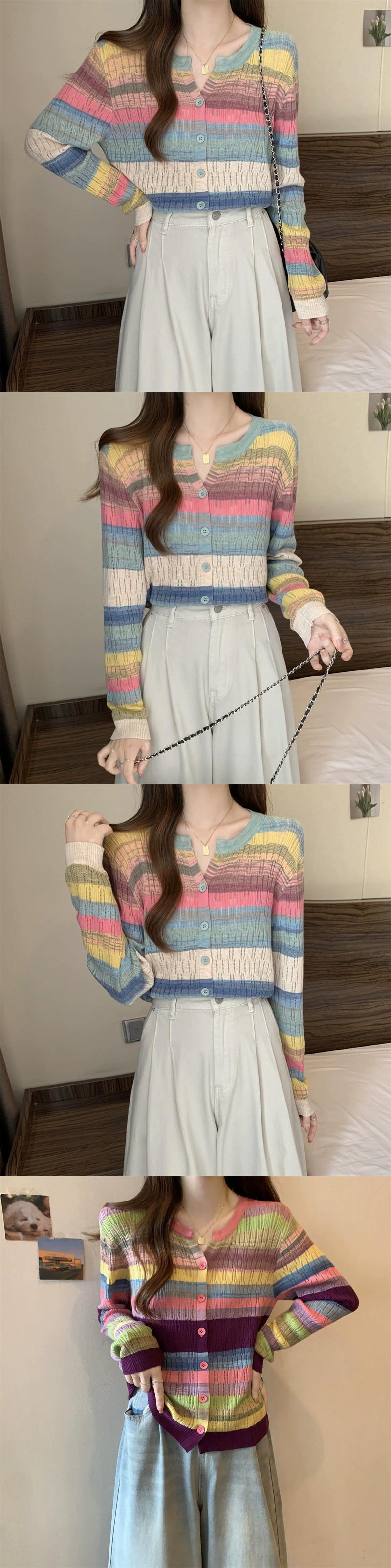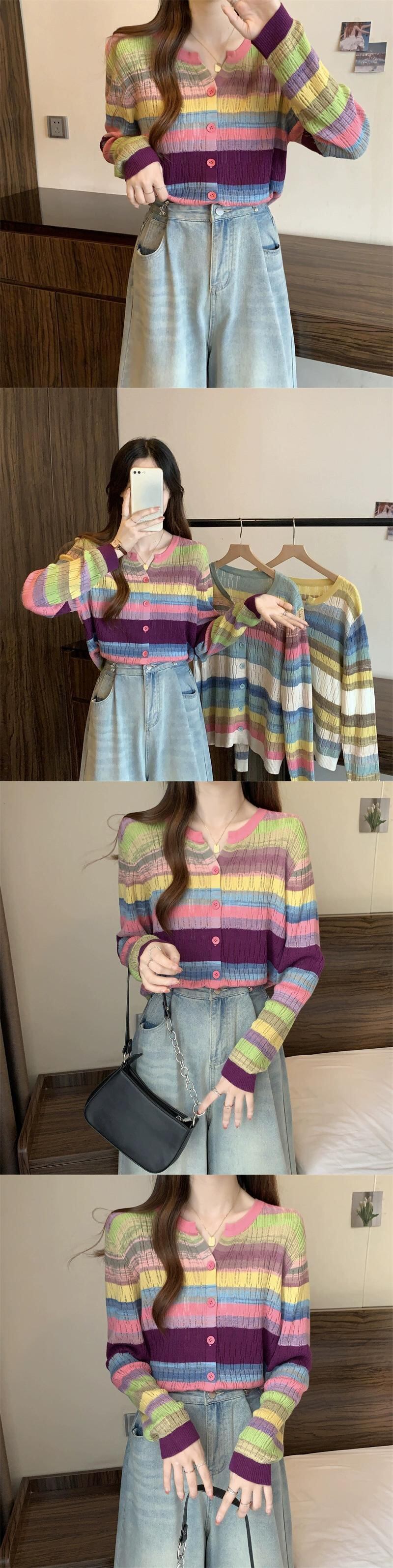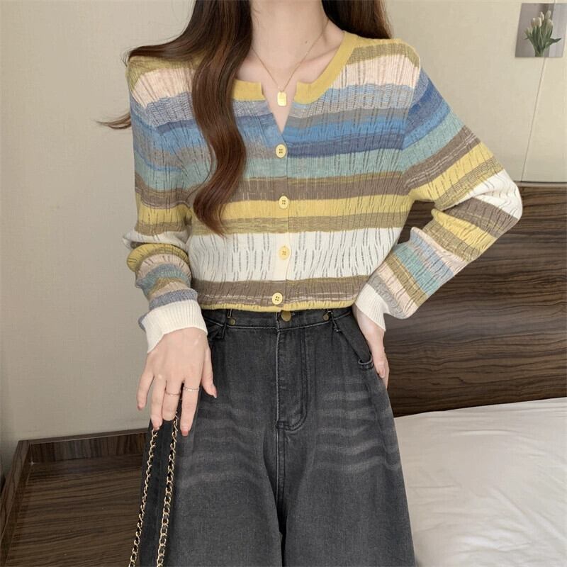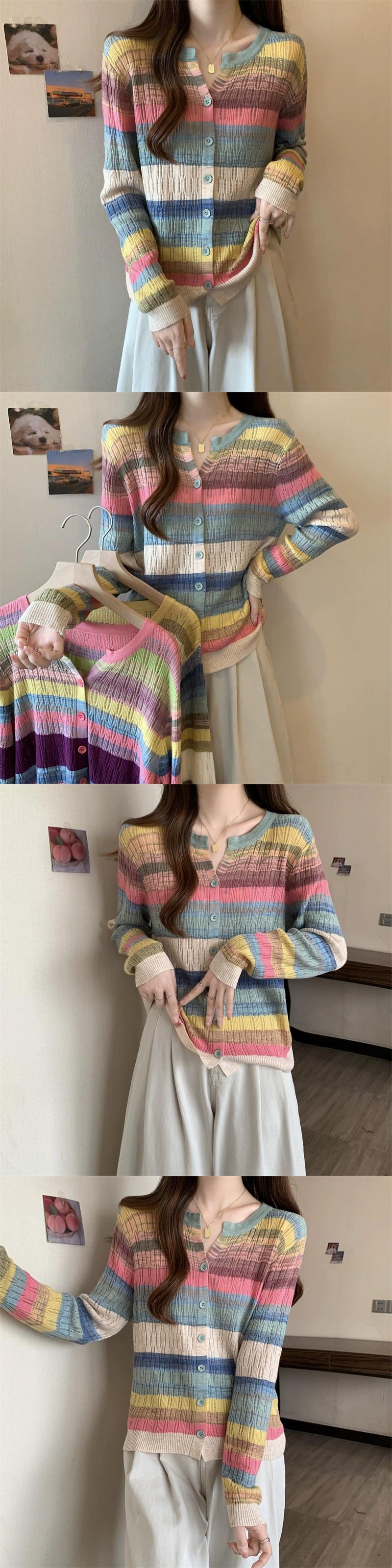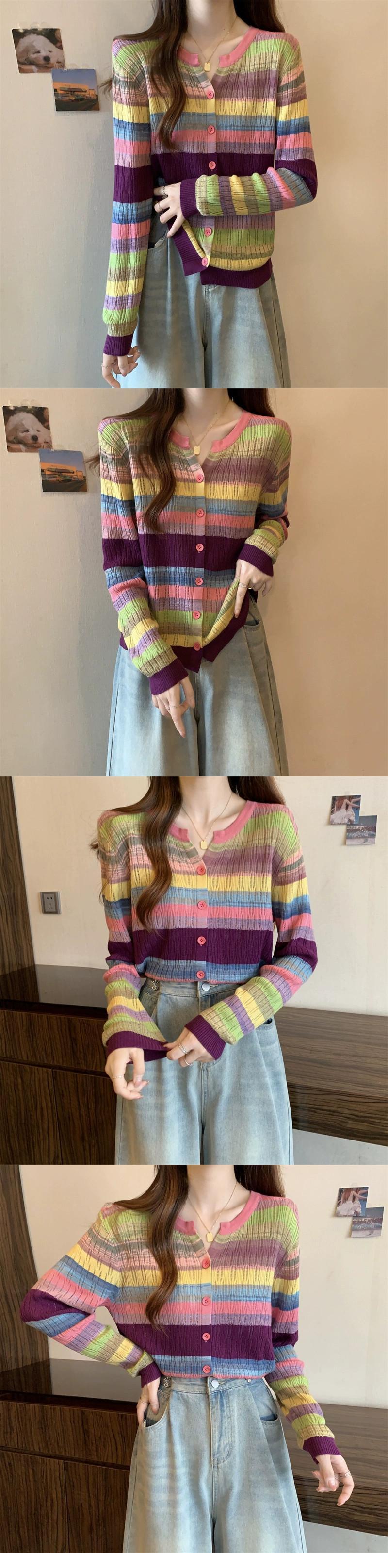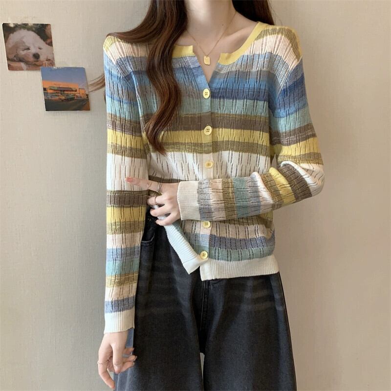 プラスサイズの女性の 2023 秋の新デザインニッチ中空ラウンドネックレインボースプライシングカラーストライプ T シャツトレンディ 大きめサイズ オータム 秋物 Oネック Tシャツ 8884148525893190