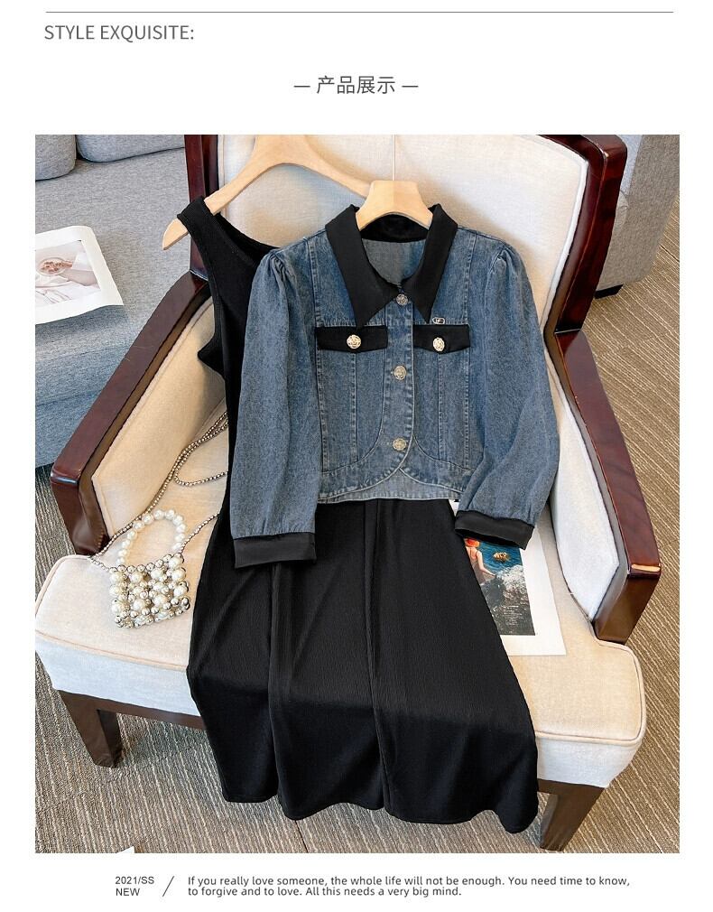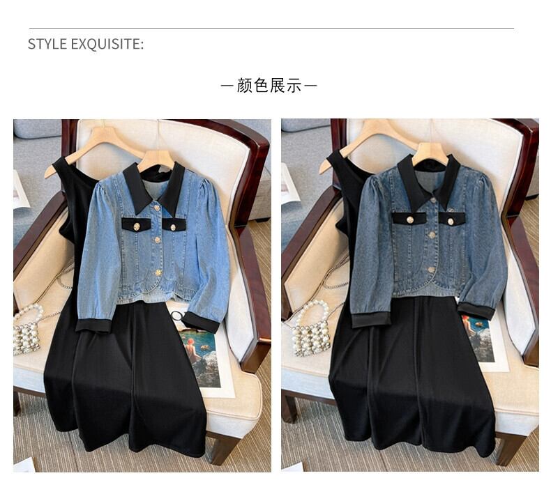 プラスサイズの婦人服 2023 流行の秋の新脂肪姉妹痩身年齢スーツデニムジャケットサスペンダースカートツーピーススーツ 大きめサイズ オータム 秋物 8884140384263799