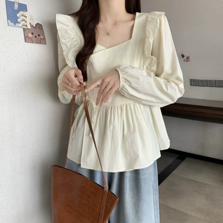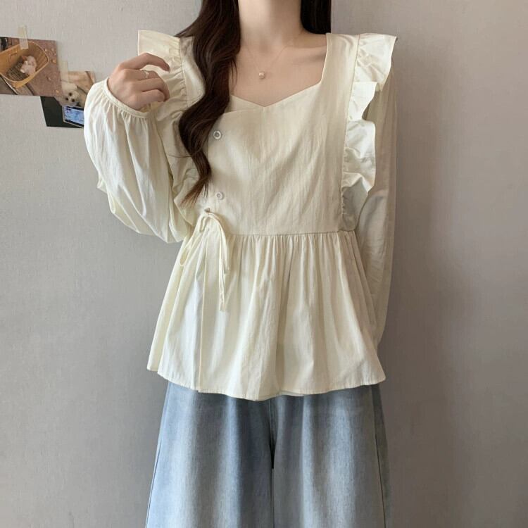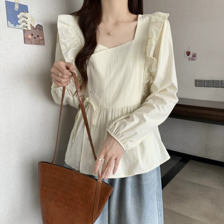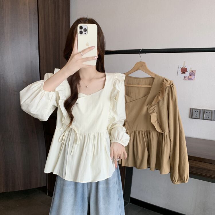 プラスサイズの婦人服 2023 ファットシスター秋の新スタイルフレンチスクエアカラーフリル年齢低減ベビードール長袖シャツトップ ロング 大きめサイズ オータム 秋物 スクウェア 8884135521671568
