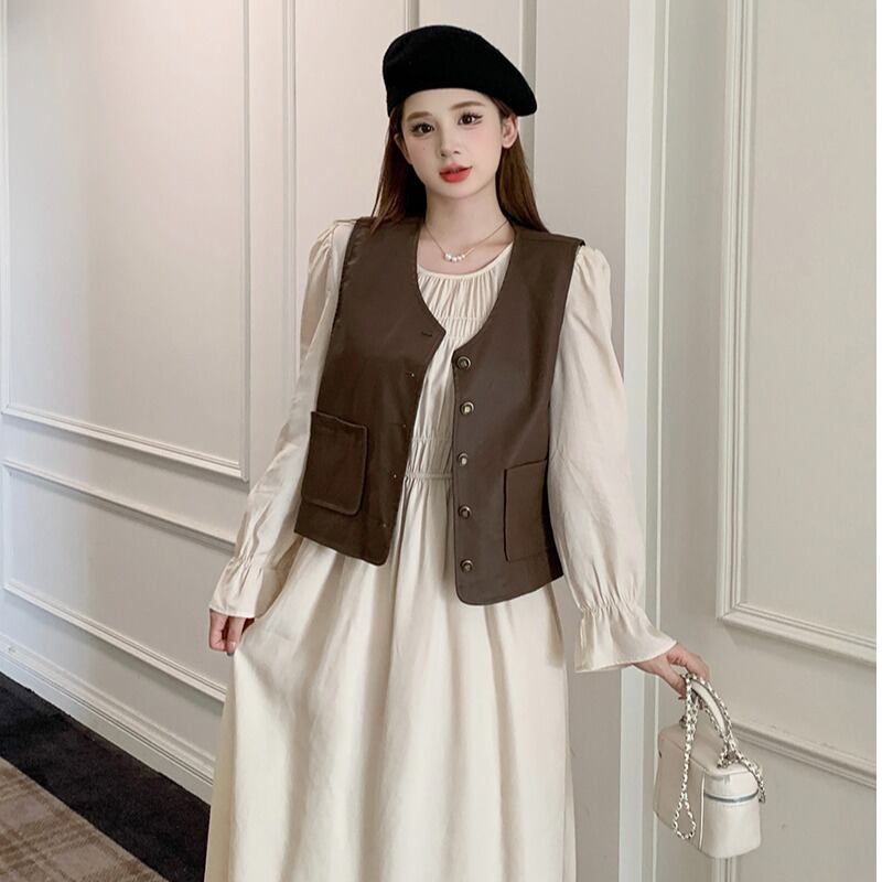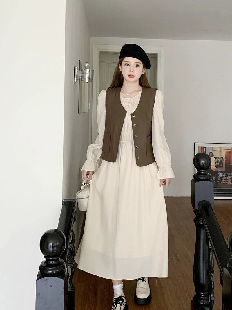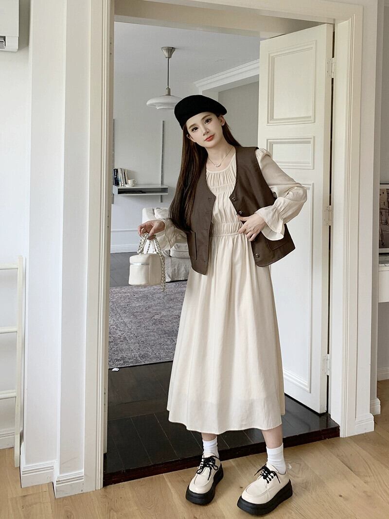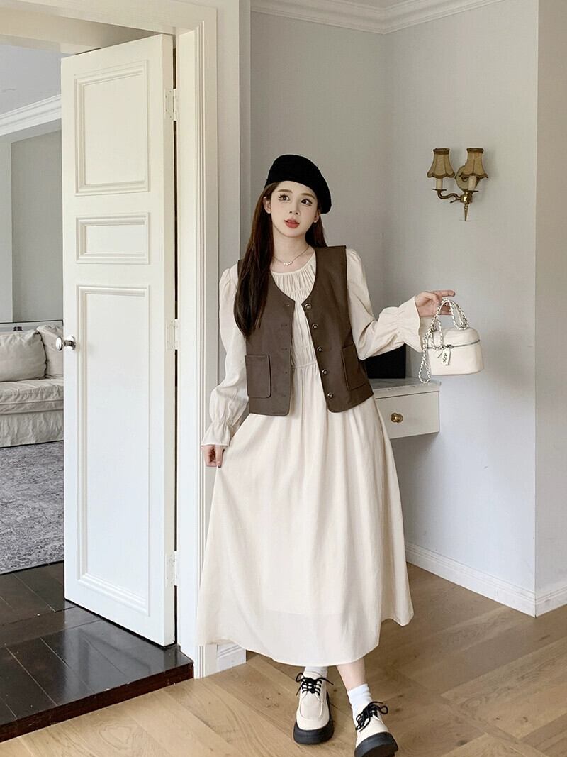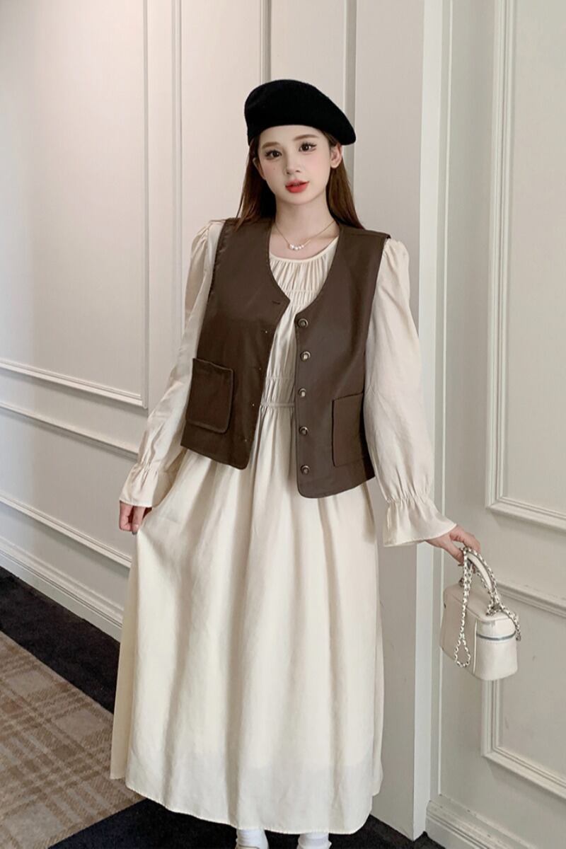 色:カーキベスト,オフホワイトのドレス