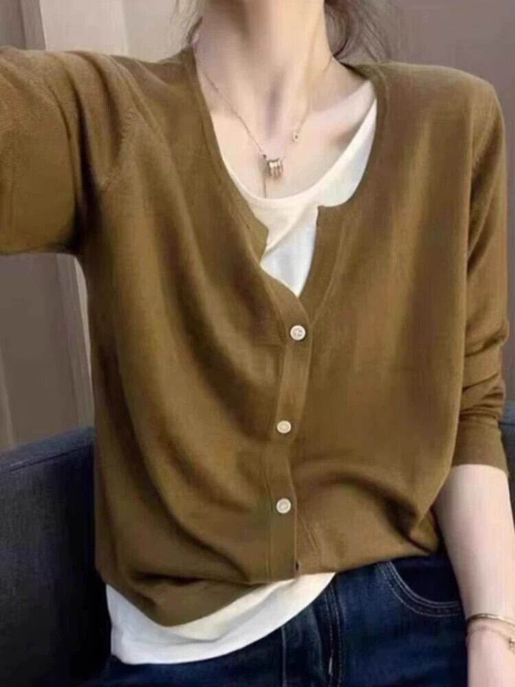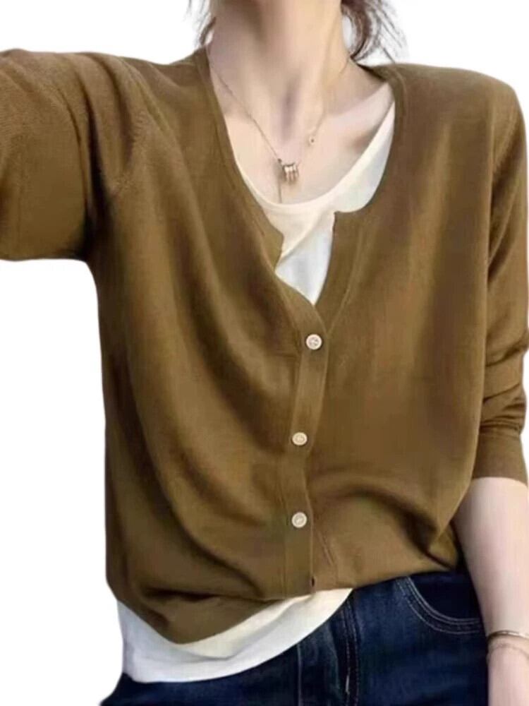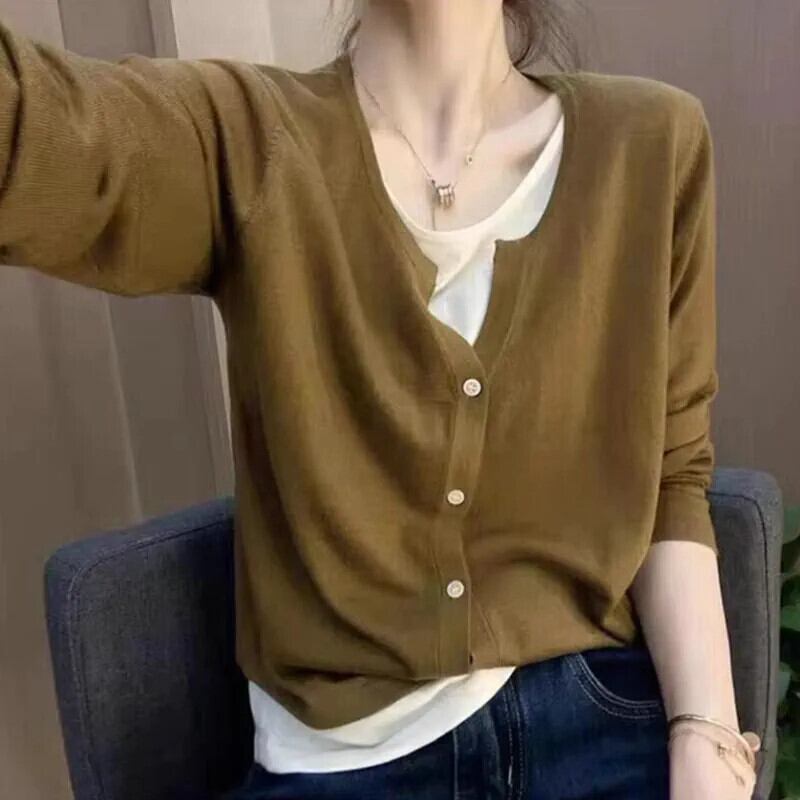 ニッチフェイクツーピースニットカーディガン女性 2023 秋の新脂肪ミリメートルプラスサイズの女性のインナーレイヤリングシャツトップ 大きめサイズ オータム 秋物 8884157358544744