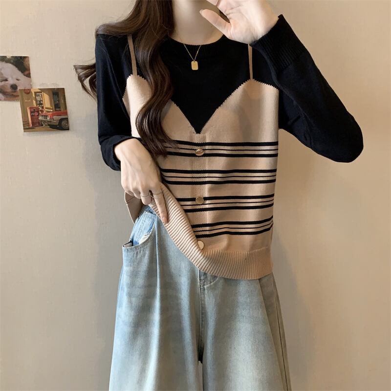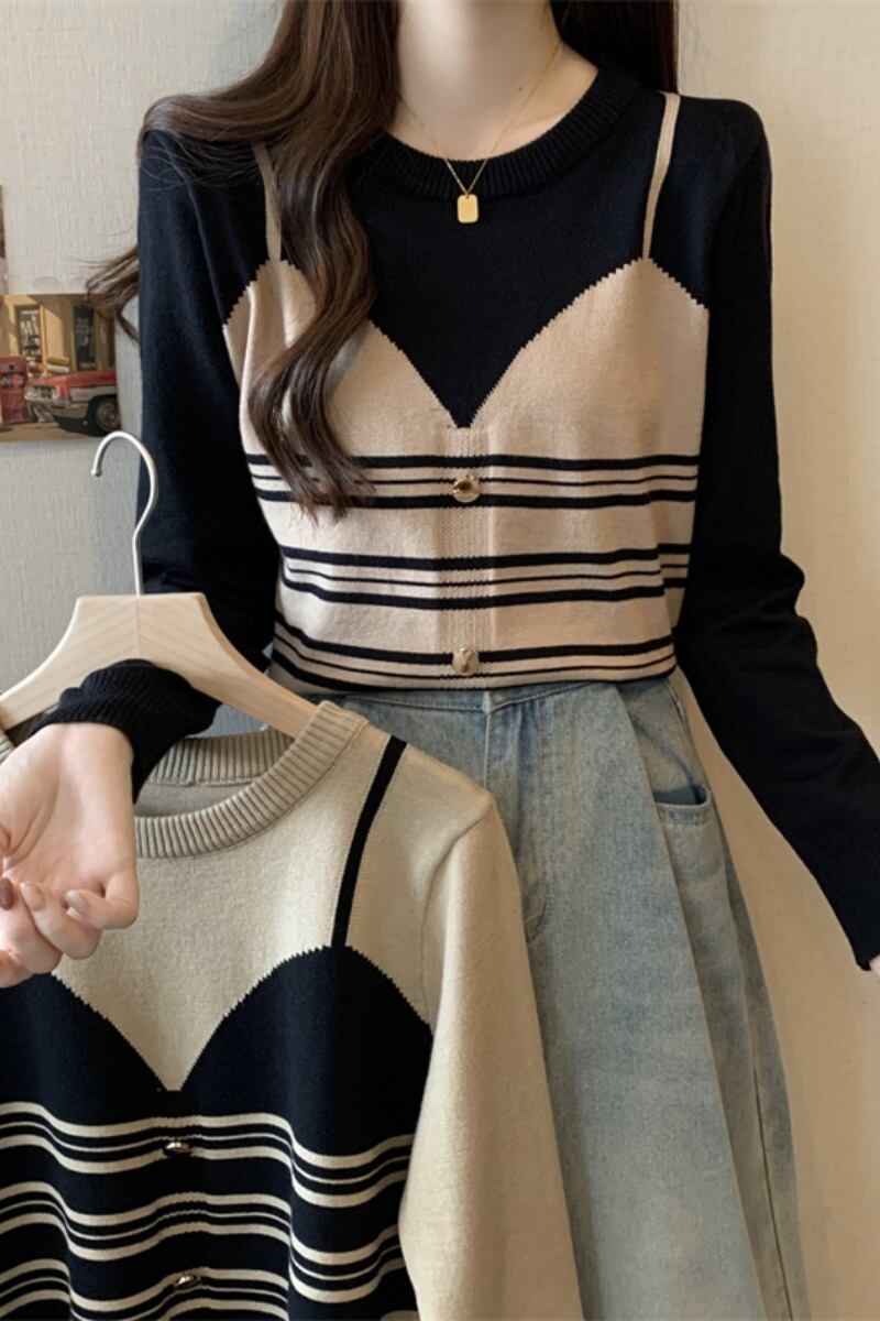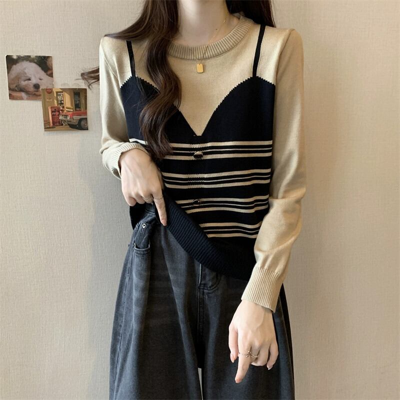 プラスサイズの女性の 2023 秋服ファットシスターフレンチニッチ西洋スタイルコントラストカラーセーター偽ツーピーストップス 大きめサイズ オータム 秋物 8884165810981098