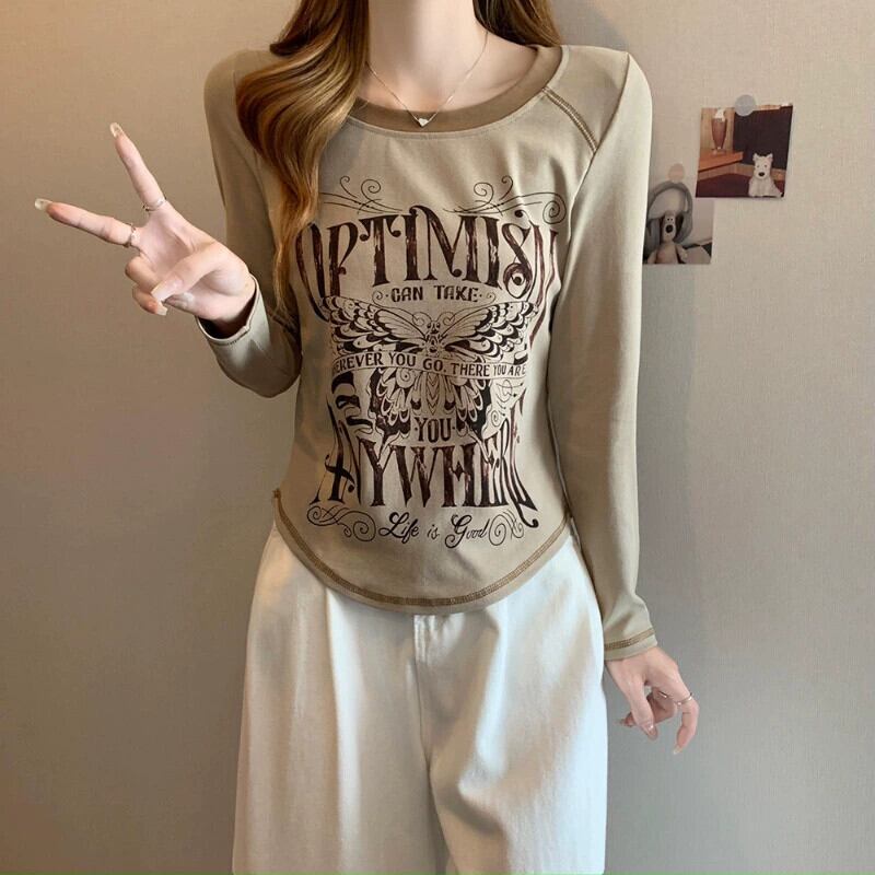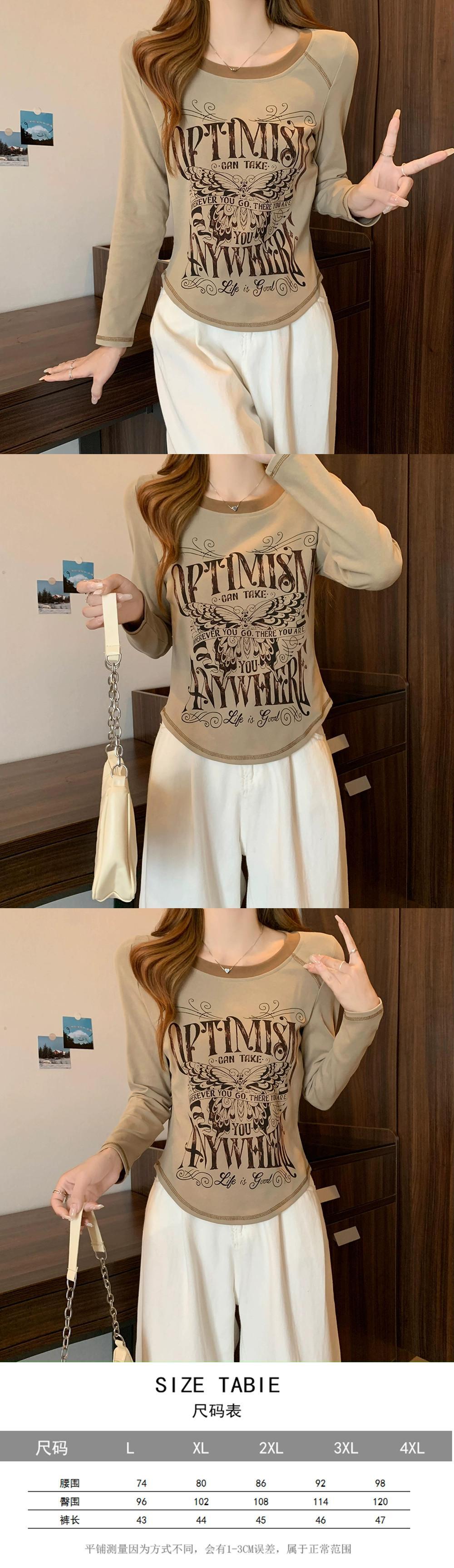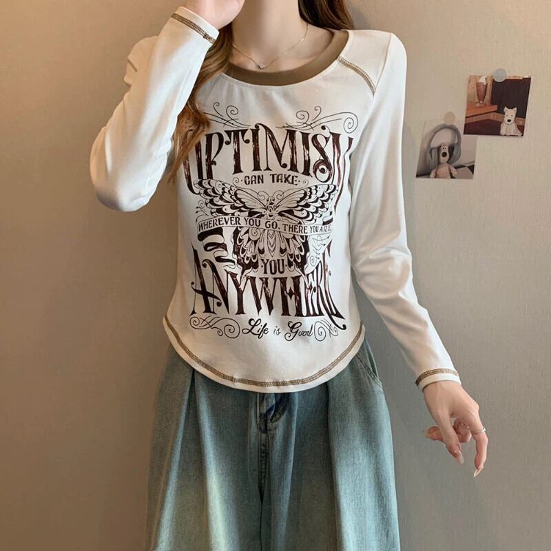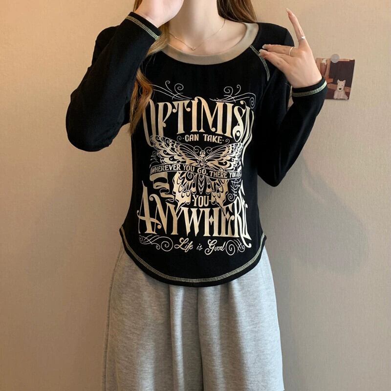 プラスサイズの女性の脂肪 mm コントラストプリント長袖アメリカンレトロ Tシャツ秋ショートボトリングシャツトップ ロング 大きめサイズ オータム 秋物 8884120594973651