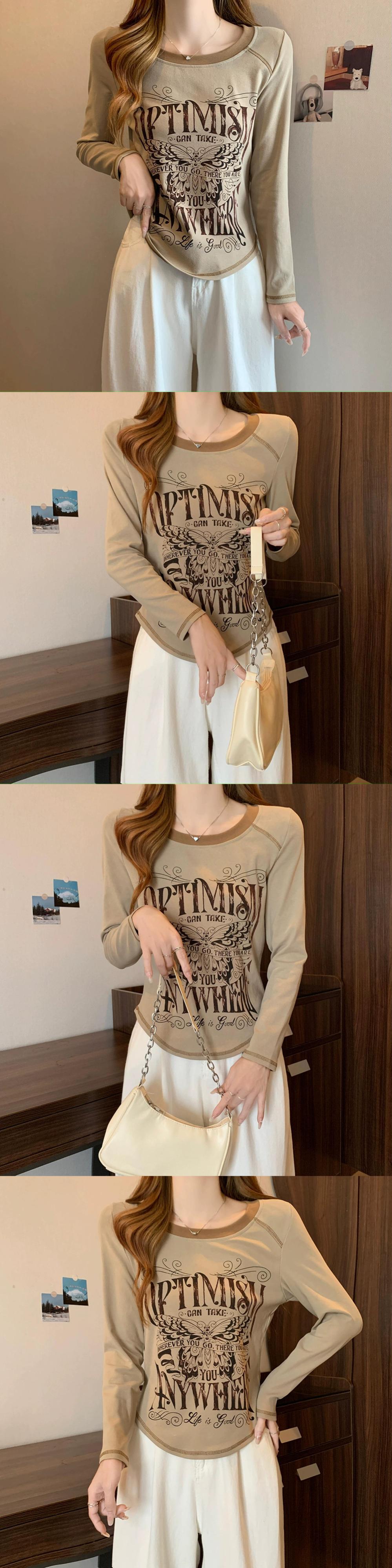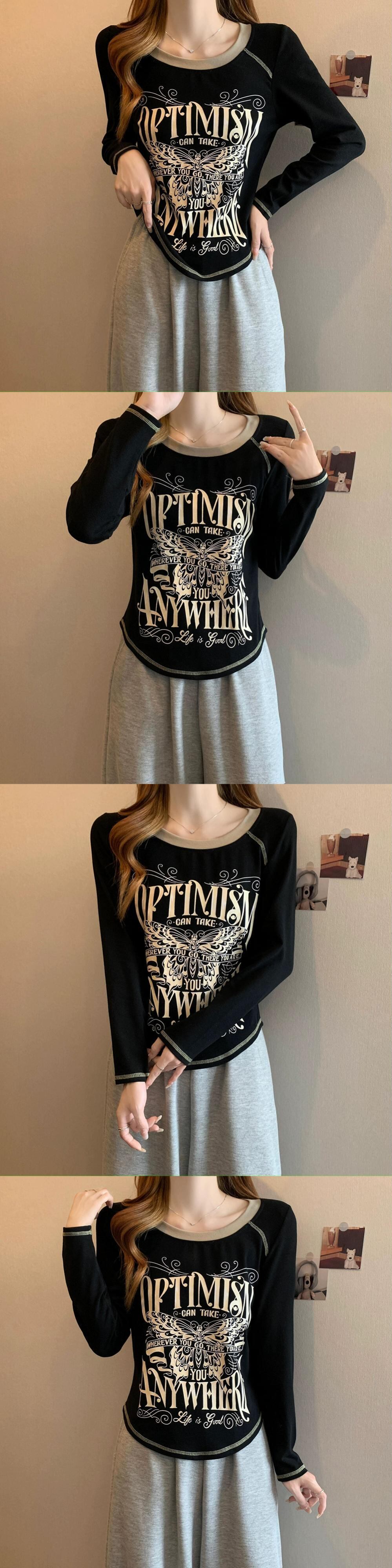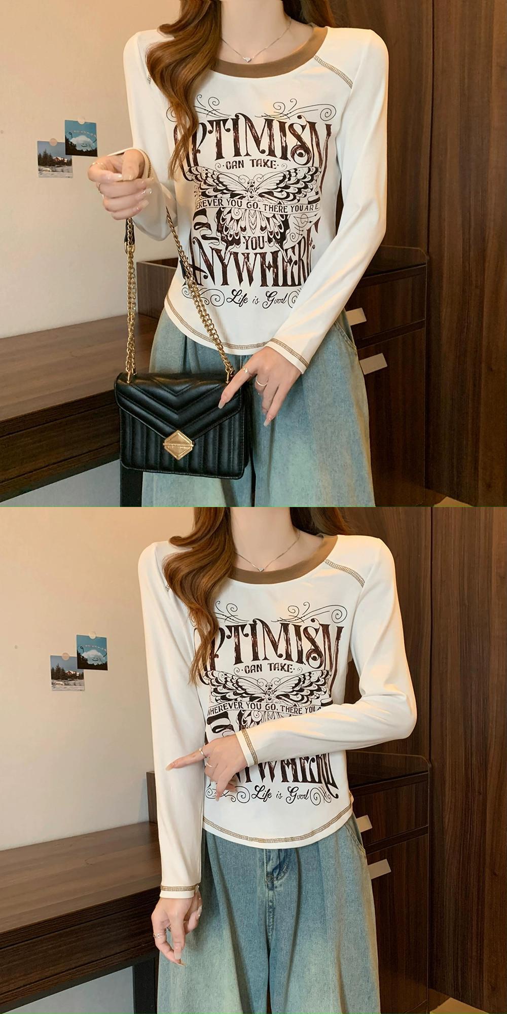 プラスサイズの女性の脂肪 mm コントラストプリント長袖アメリカンレトロ Tシャツ秋ショートボトリングシャツトップ ロング 大きめサイズ オータム 秋物 8884120594973651