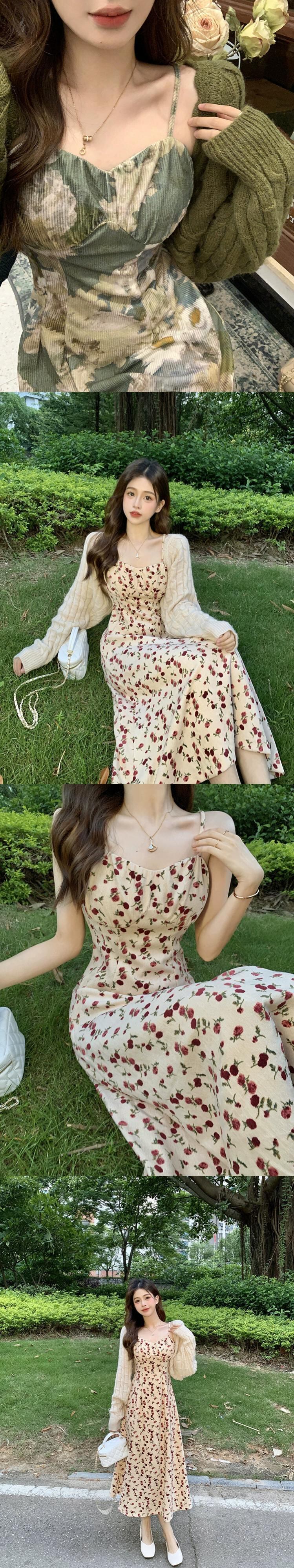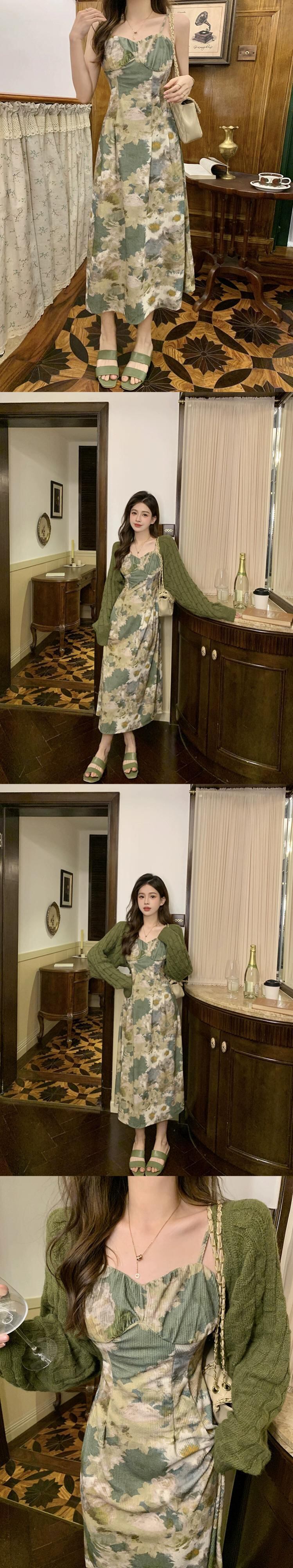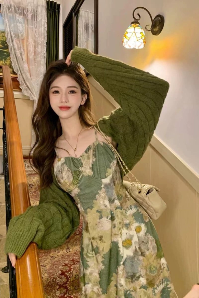 色:シングルグリーンの花柄サスペンダースカート,シングルグリーンカーディガン,シングルチェリーサスペンダースカート,シングルオートミールカーディガン