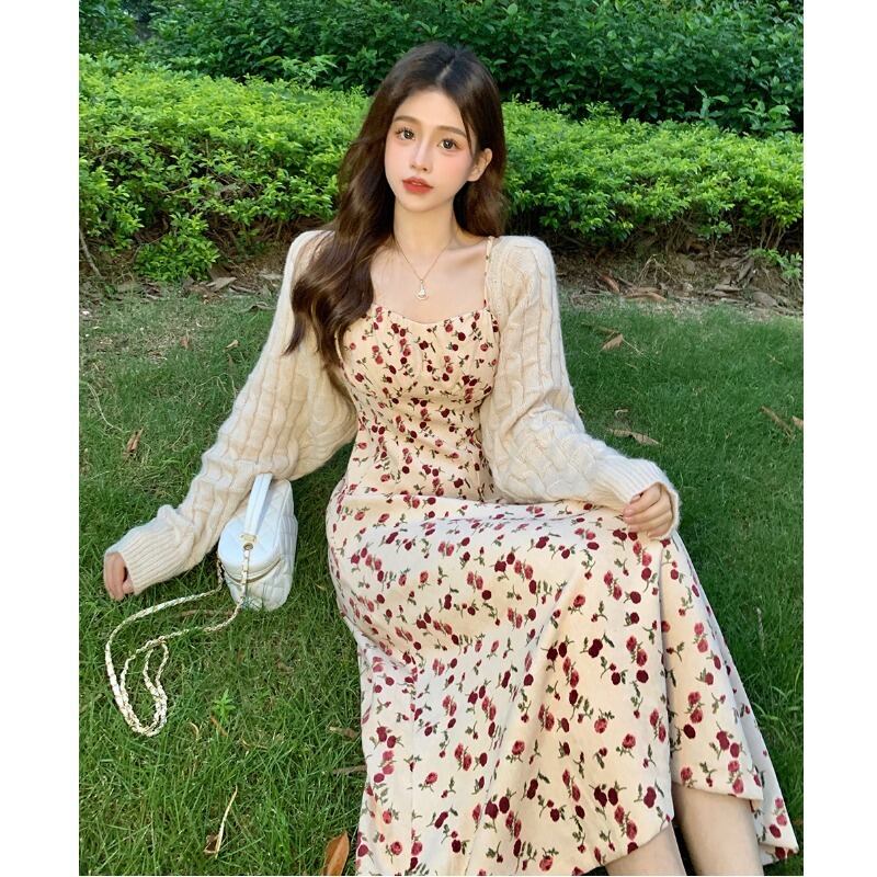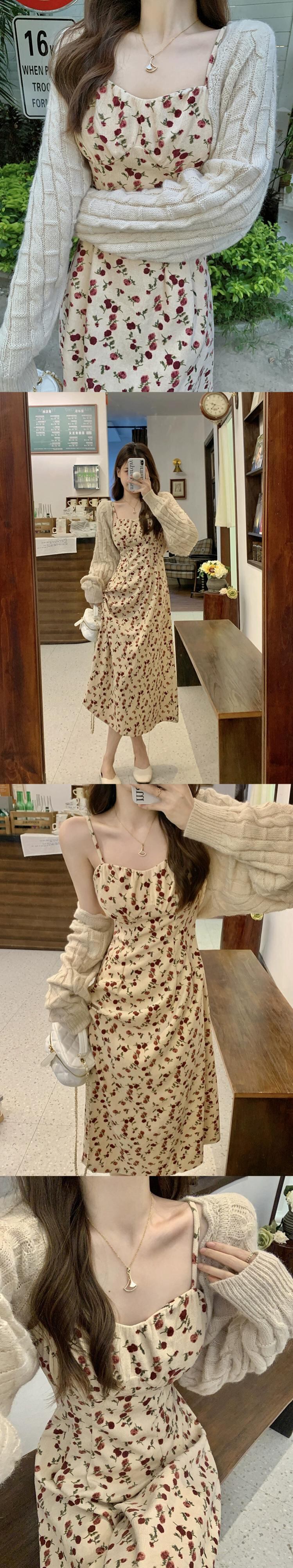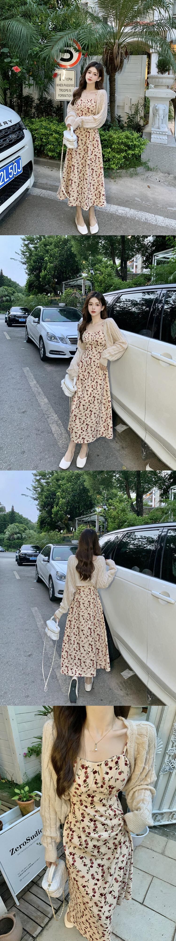 色:シングルグリーンの花柄サスペンダースカート,シングルグリーンカーディガン,シングルチェリーサスペンダースカート,シングルオートミールカーディガン