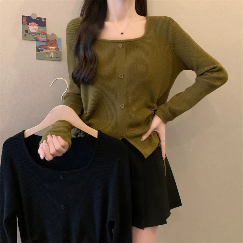 プラスサイズの婦人服 2023 ファットシスター秋の新スリム長袖スクエアネックセーターデザイン底シャツトップ ロング 大きめサイズ オータム 秋物 スクウェア 8884194828766864