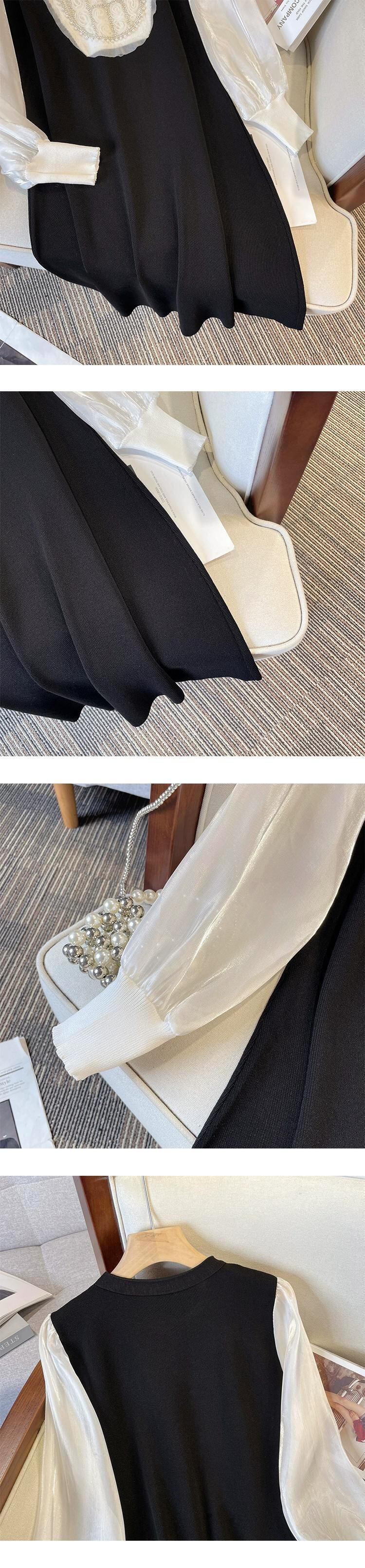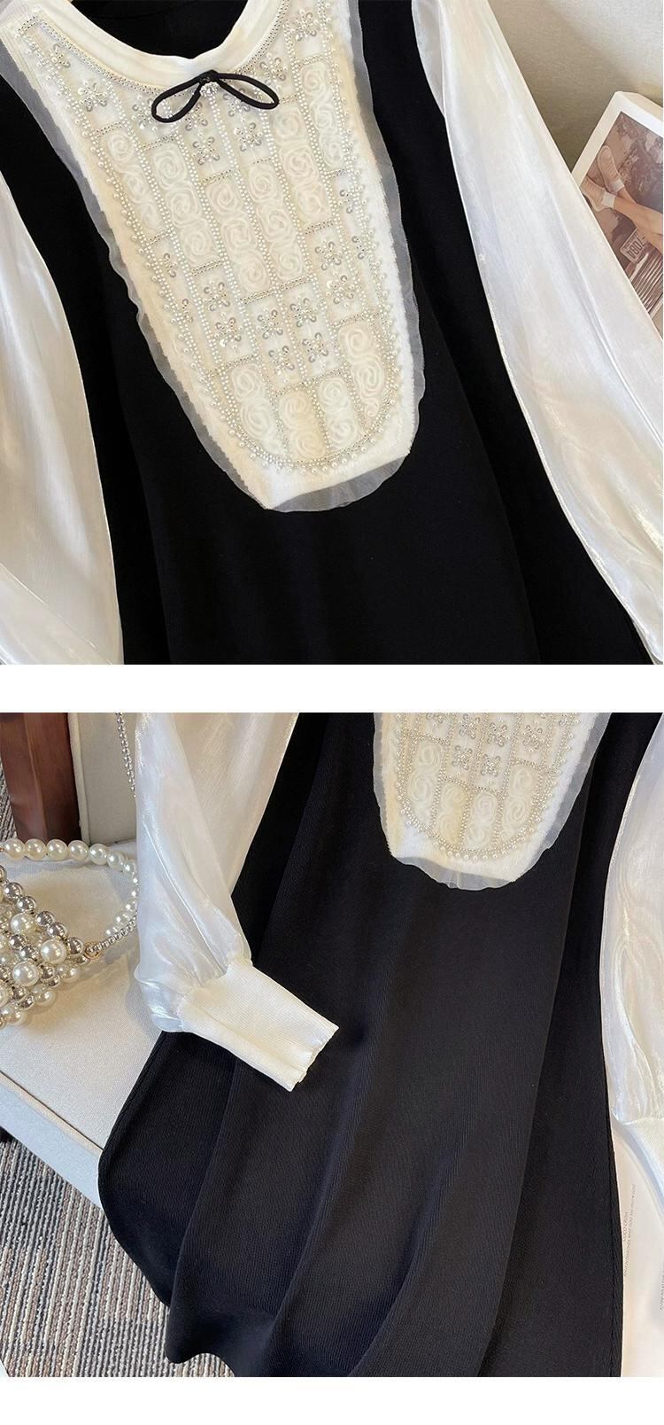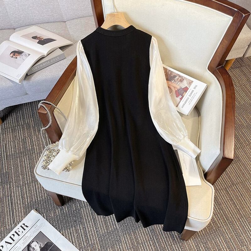 プラスサイズの女性の 2023 秋ファットシスターカラーマッチングフェイクツーピース A ラインスカートパフスリーブドレス 大きめサイズ オータム 秋物 Aライン 8884159534620927