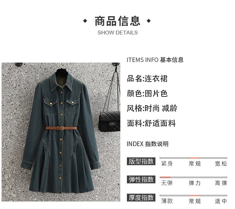プラスサイズの婦人服 2023 ファットシスター秋の新レトロフレンチウエスト痩身 A ラインデニムドレスベルト付き 大きめサイズ オータム 秋物 ハーネス Aライン 8884115269396908