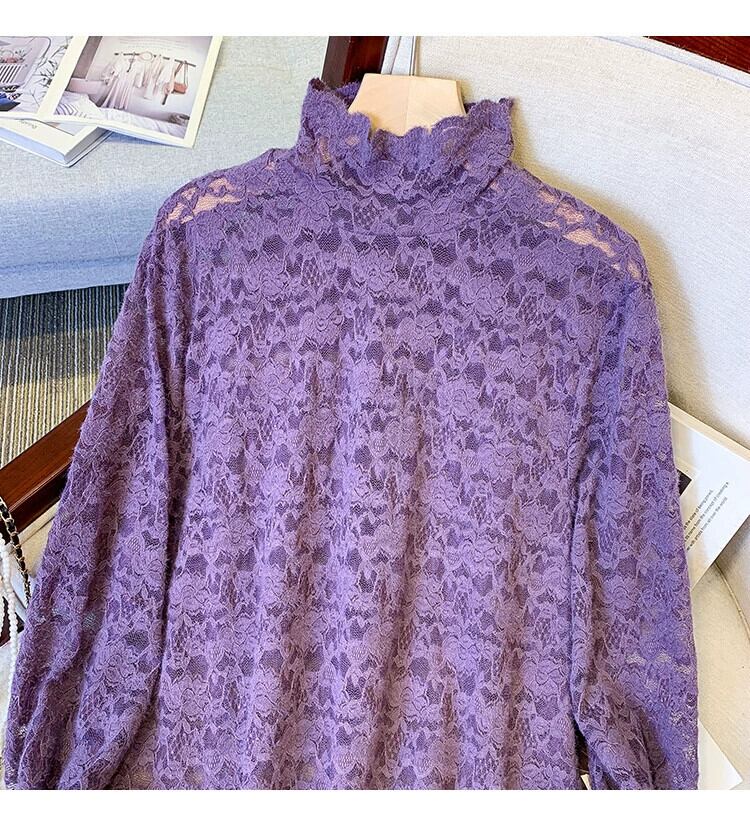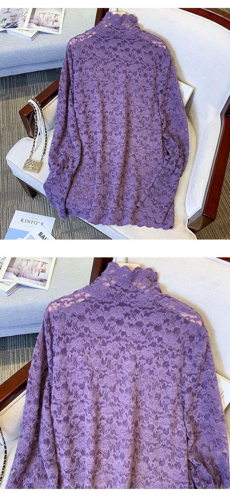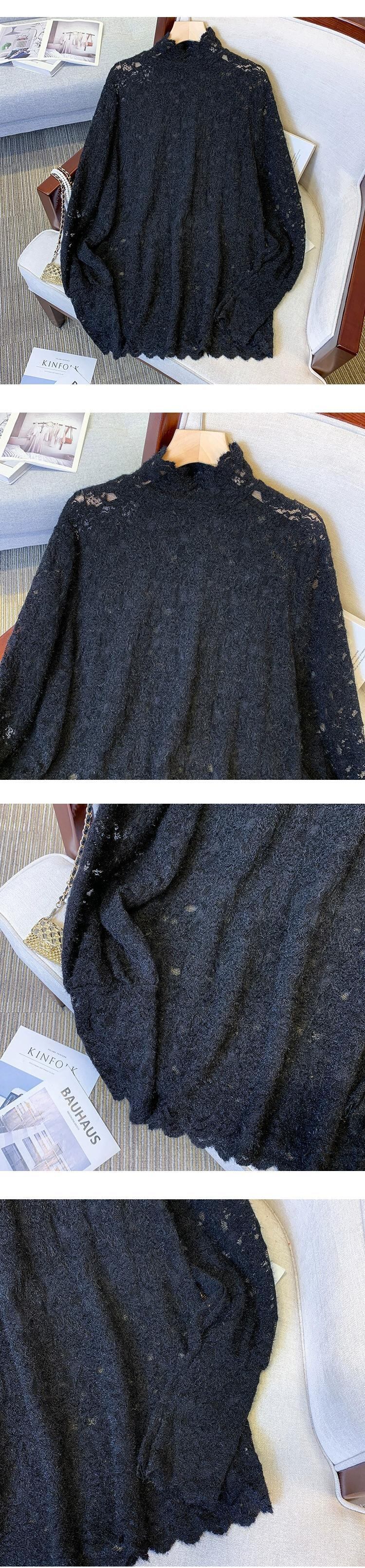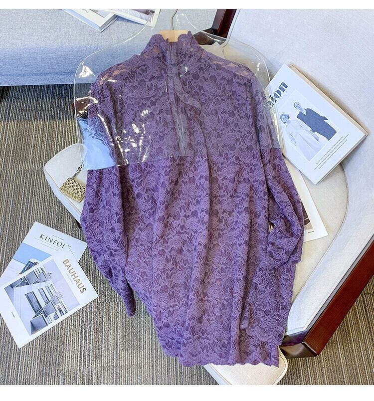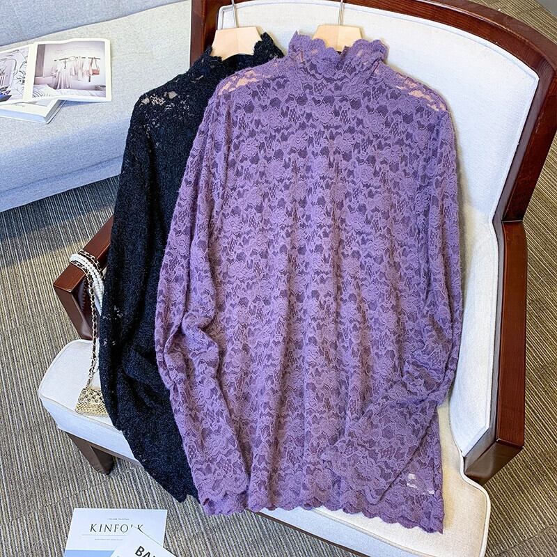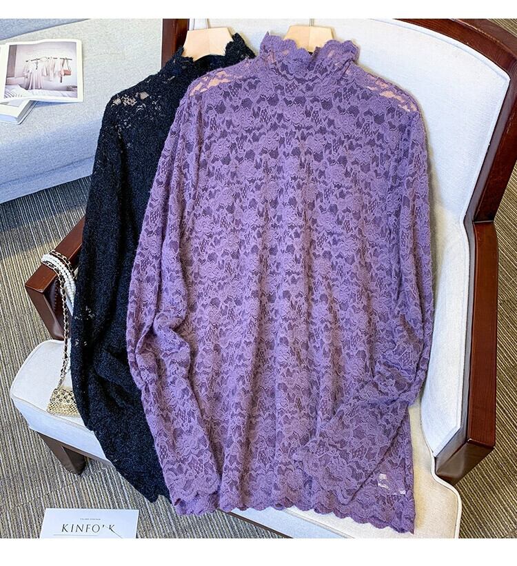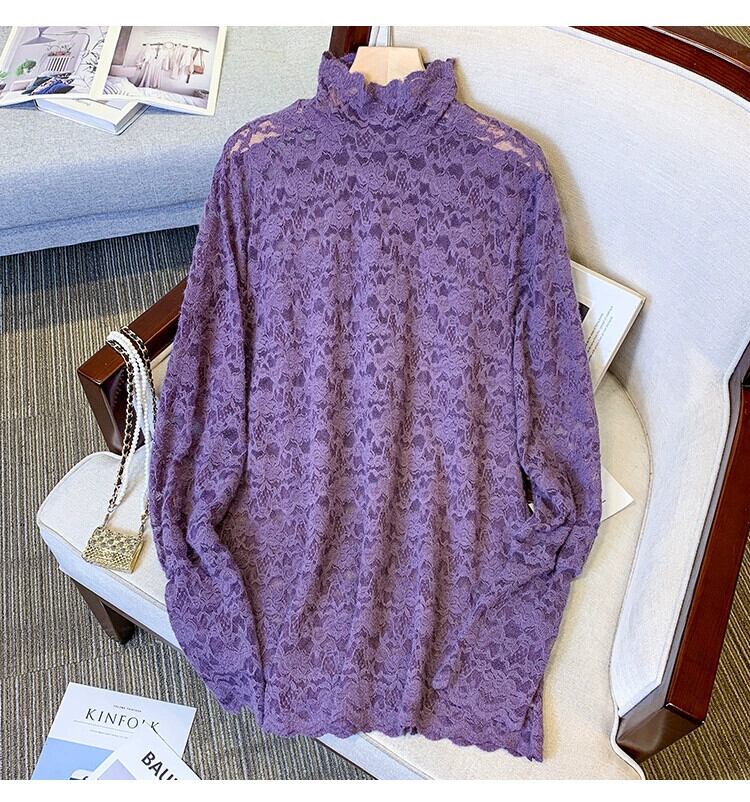 プラスサイズの婦人服 2023 ファットシスター秋の新ハイエンド eign スタイルミッドレングスハイネックボトリングレースシャツ長袖トップ ロング 大きめサイズ オータム 秋物 8884155824927573
