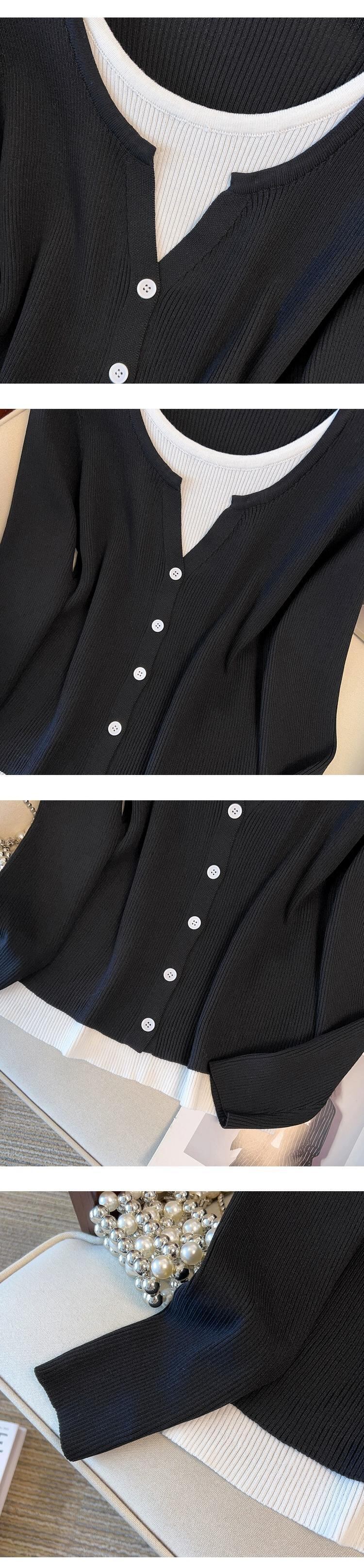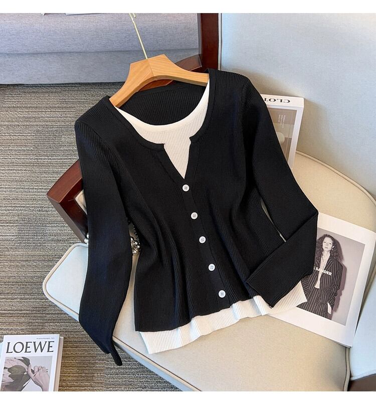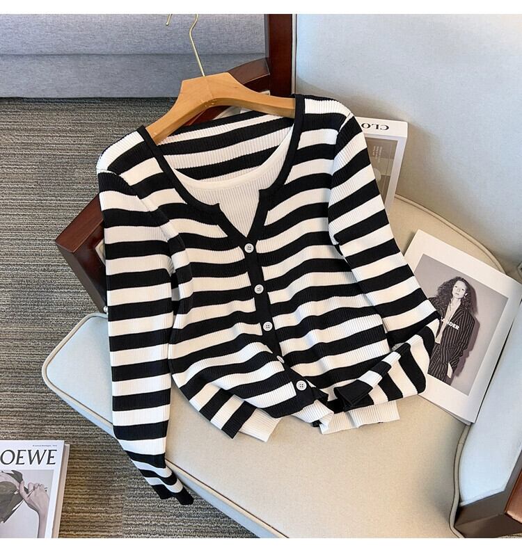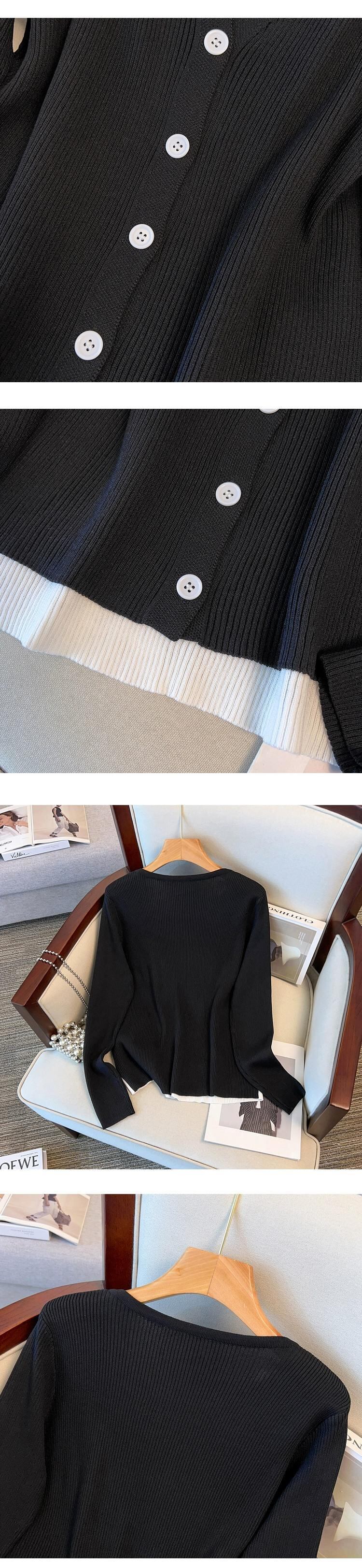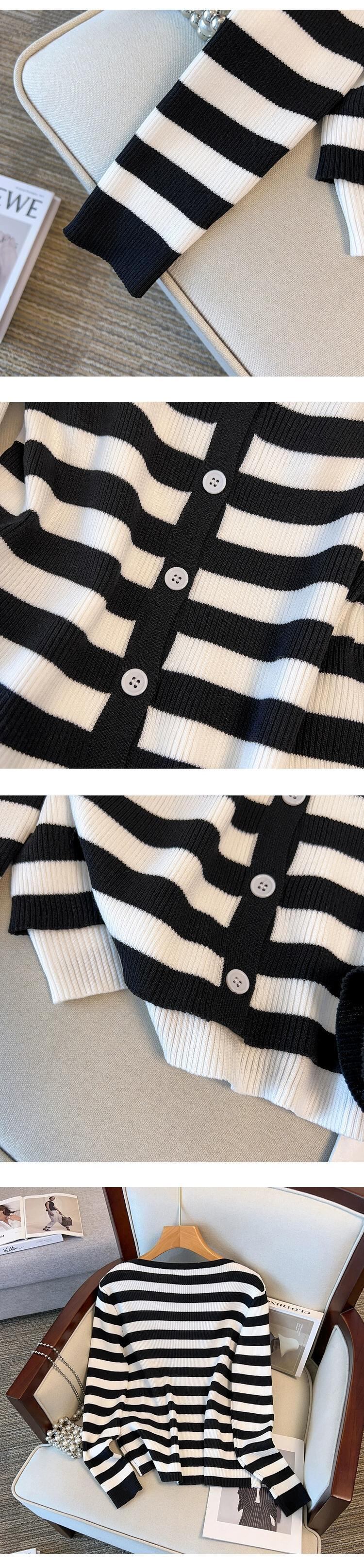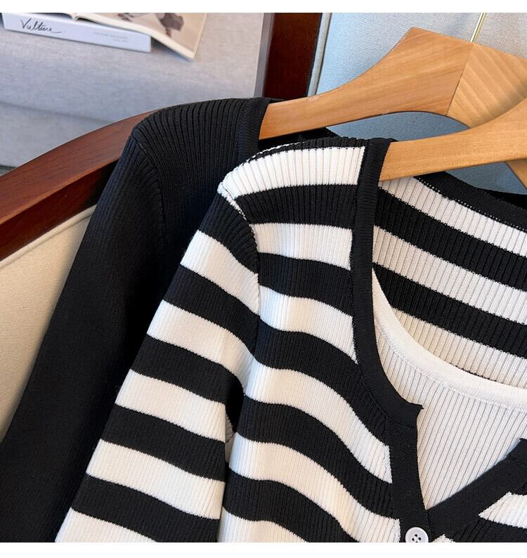 プラスサイズの女性の脂肪 mm 秋のファッションスリムプルオーバーセーターデザイン年齢を減らす偽ツーピースストライプニットトップ 大きめサイズ オータム 秋物 8884142902655251