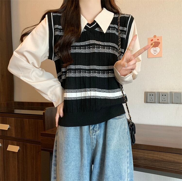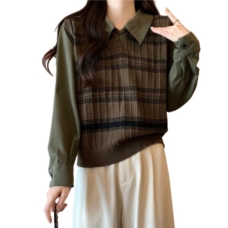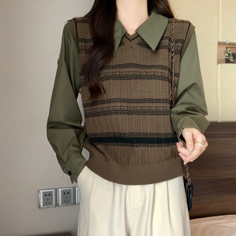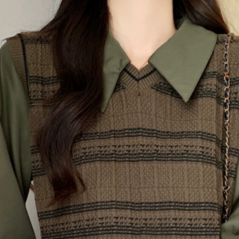 プラスサイズの女性の 2023 秋服ファットシスター偽ツーピース村シャツニットスプライシング腹カバートップ 大きめサイズ オータム 秋物 8884123263082861
