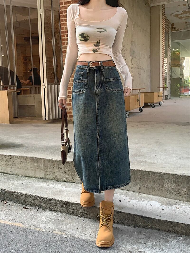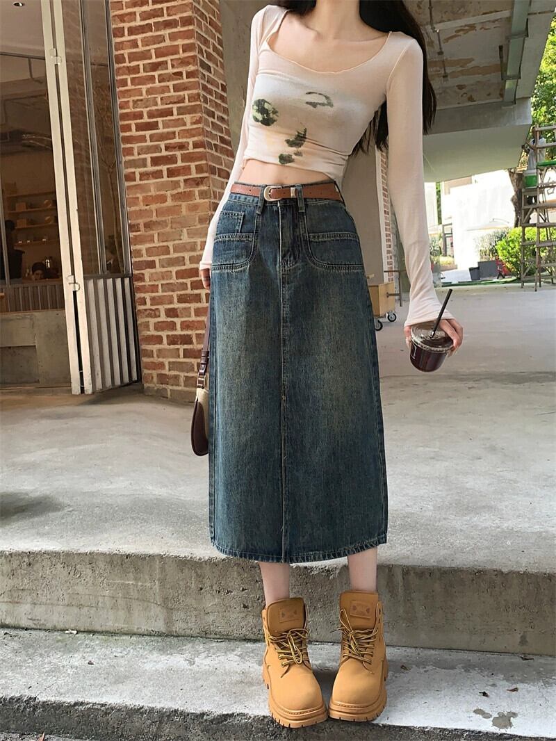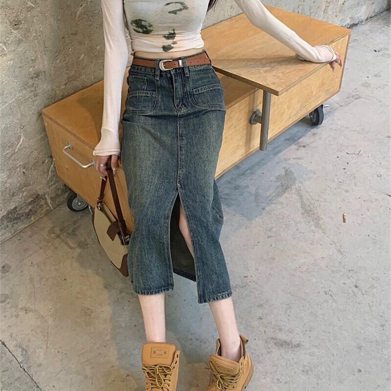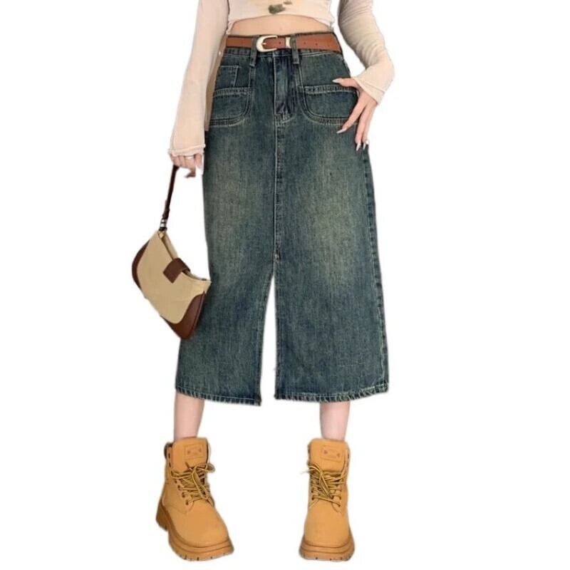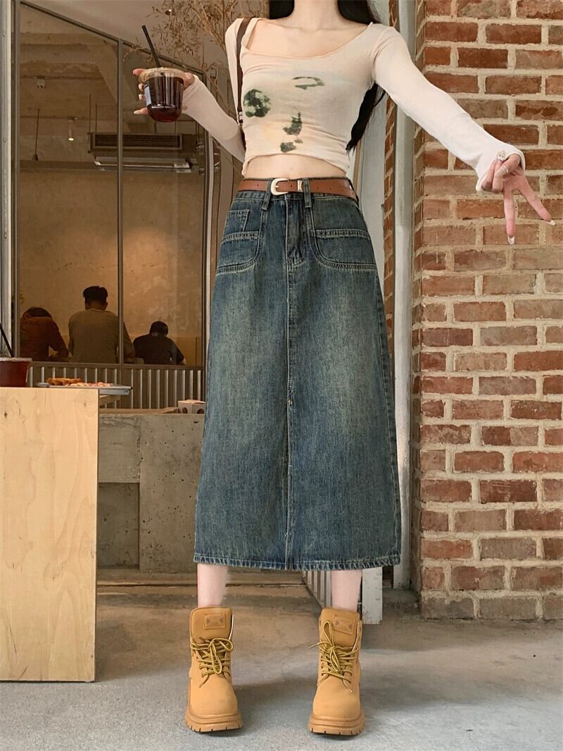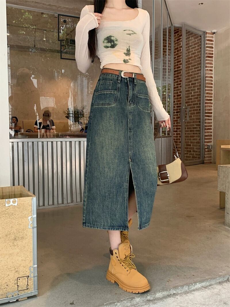 大きいサイズの香港スタイルのレトロなデニムスカート秋 2023 新しい女性のスカート脂肪 mm は腹をカバーし、スリムに見える A ラインスカート 大きめサイズ オータム 秋物 Aライン 8884187056043001