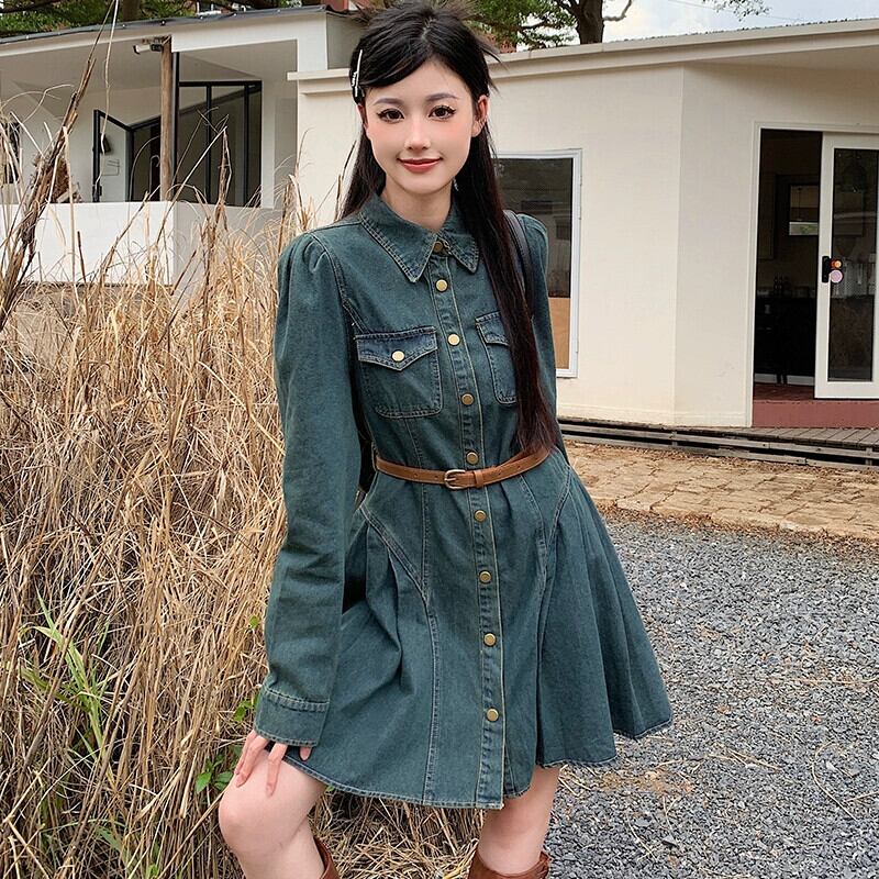 脂肪 mm プラスサイズの婦人服 2023 秋の新レトロフレンチウエスト痩身 A ラインデニムドレスベルト付き 大きめサイズ オータム 秋物 ハーネス Aライン 8884162513347231
