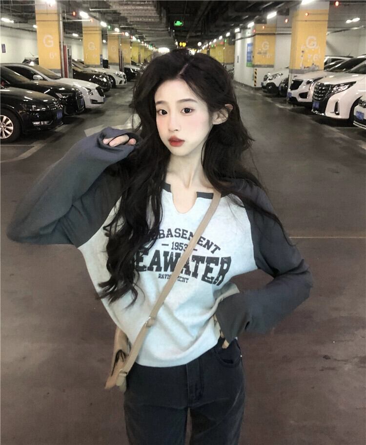 プラスサイズのレディース秋服アメリカンレトロ右肩長袖Tシャツ2023新作脂肪mm痩身トップス、お肉をカバーするスタイリッシュなスタイル ロング 大きめサイズ オータム 秋物 8884169306523914