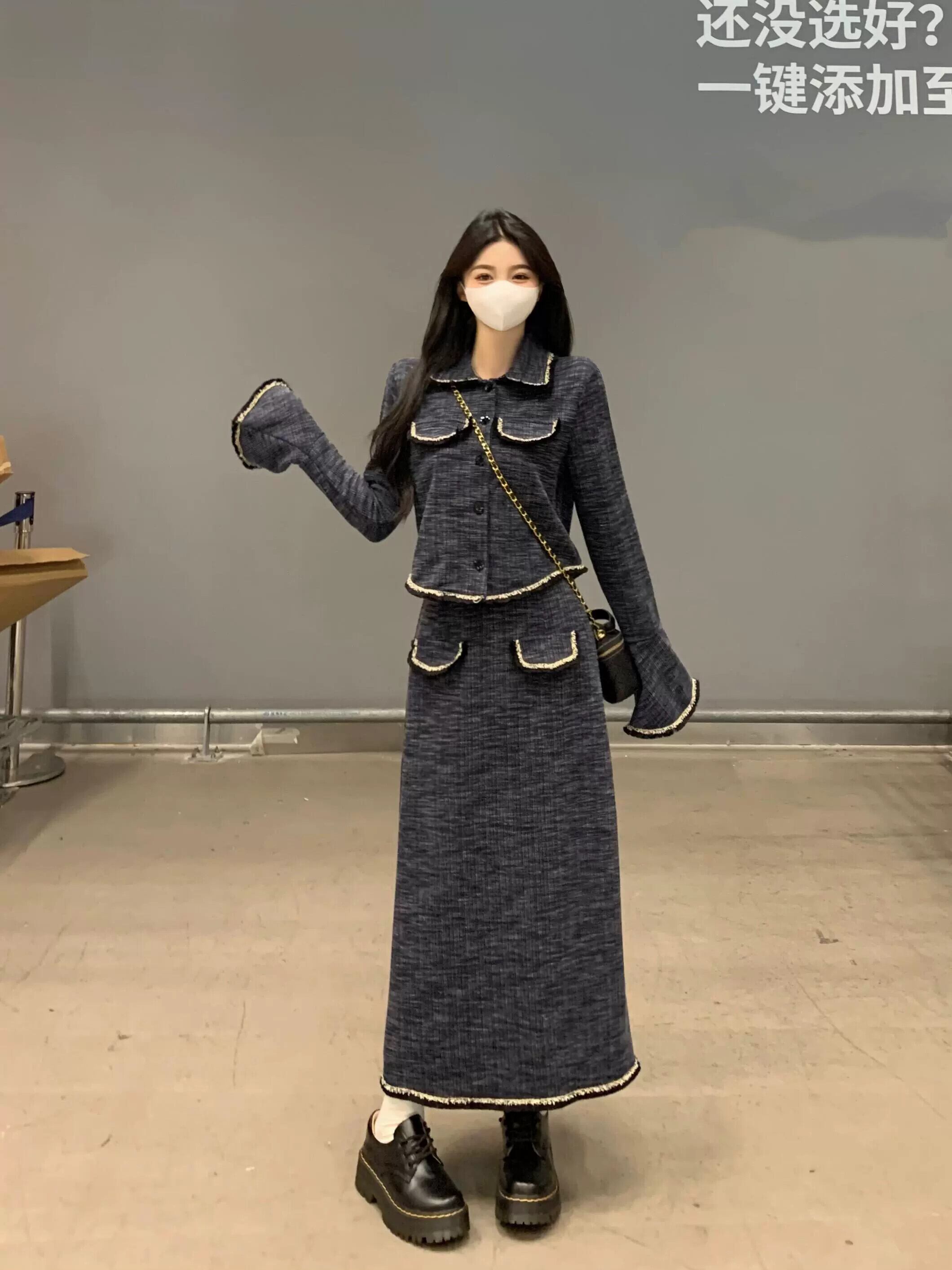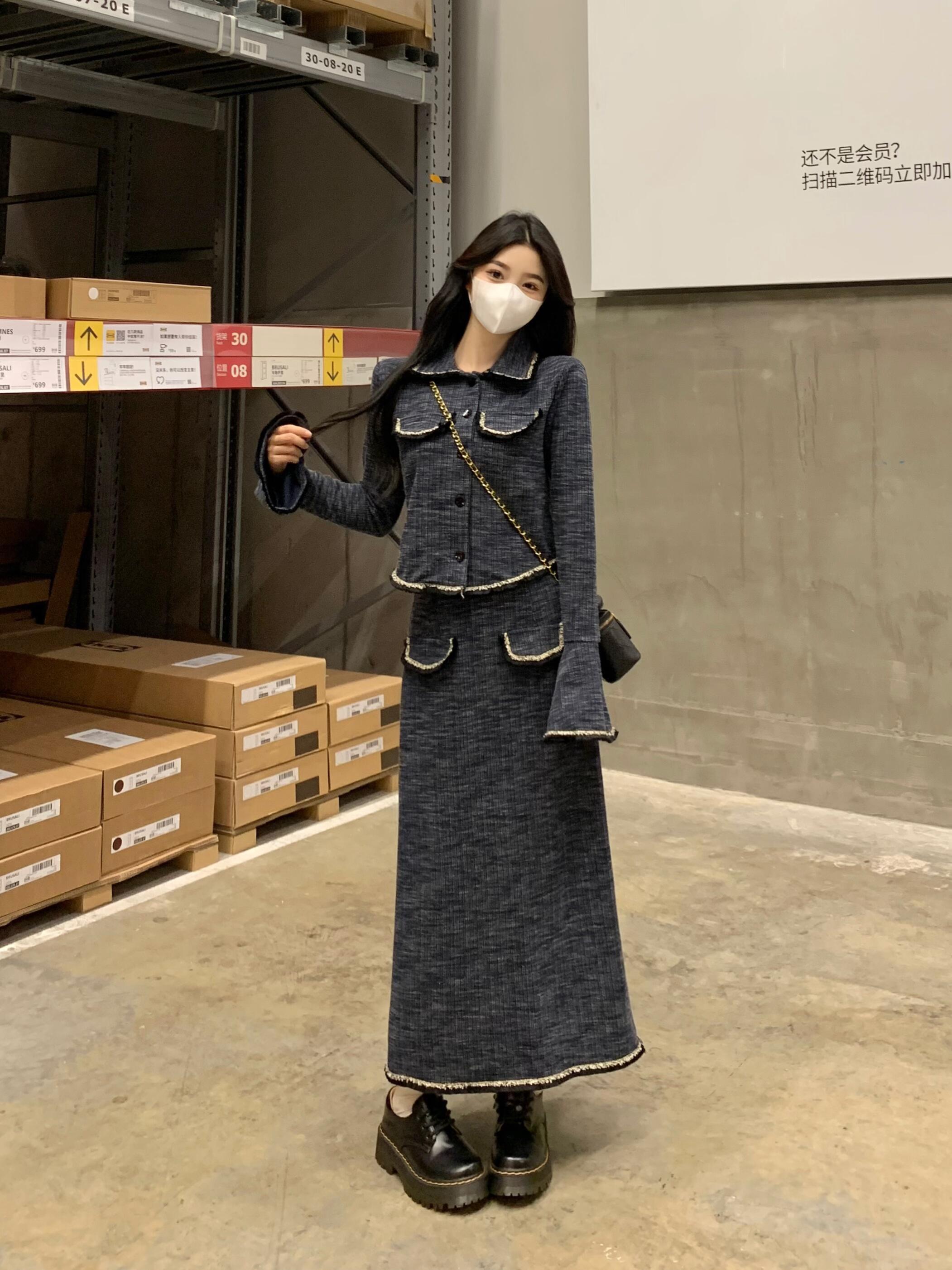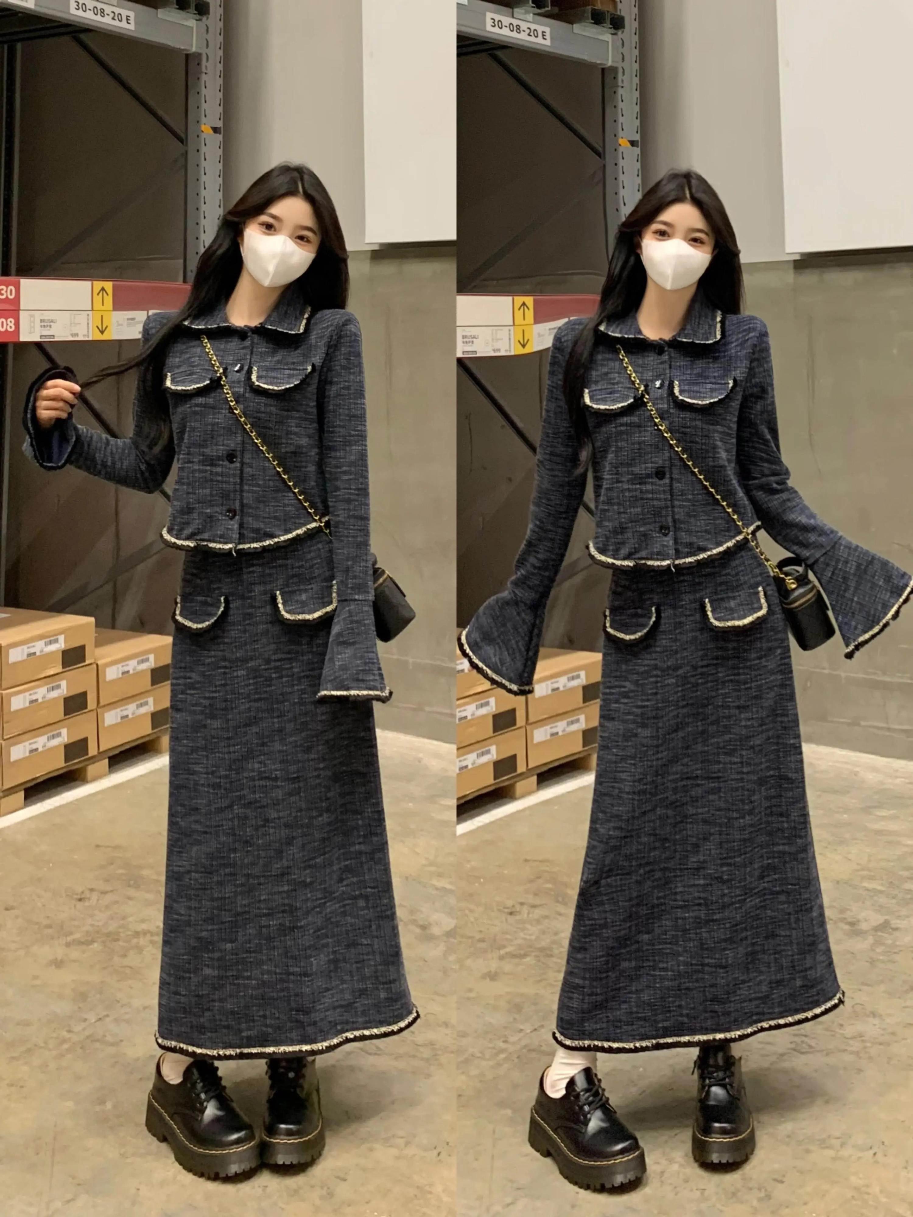 プラスサイズの女性の脂肪mm秋フレンチスタイルラペル長袖ショートコートハイウエストヒップスカート痩身2点セット ハイウェスト ロング 大きめサイズ オータム 秋物 8884121023953333
