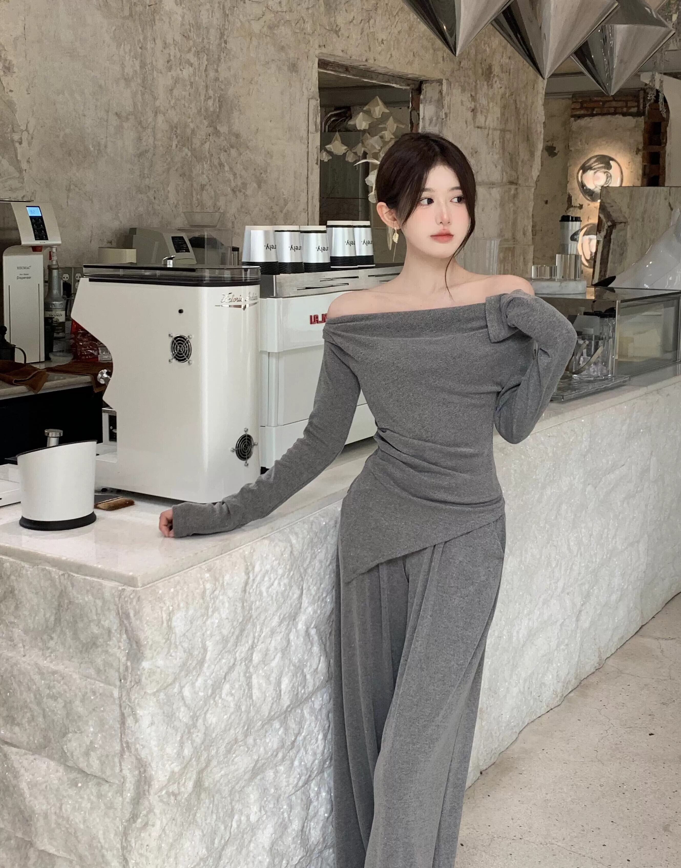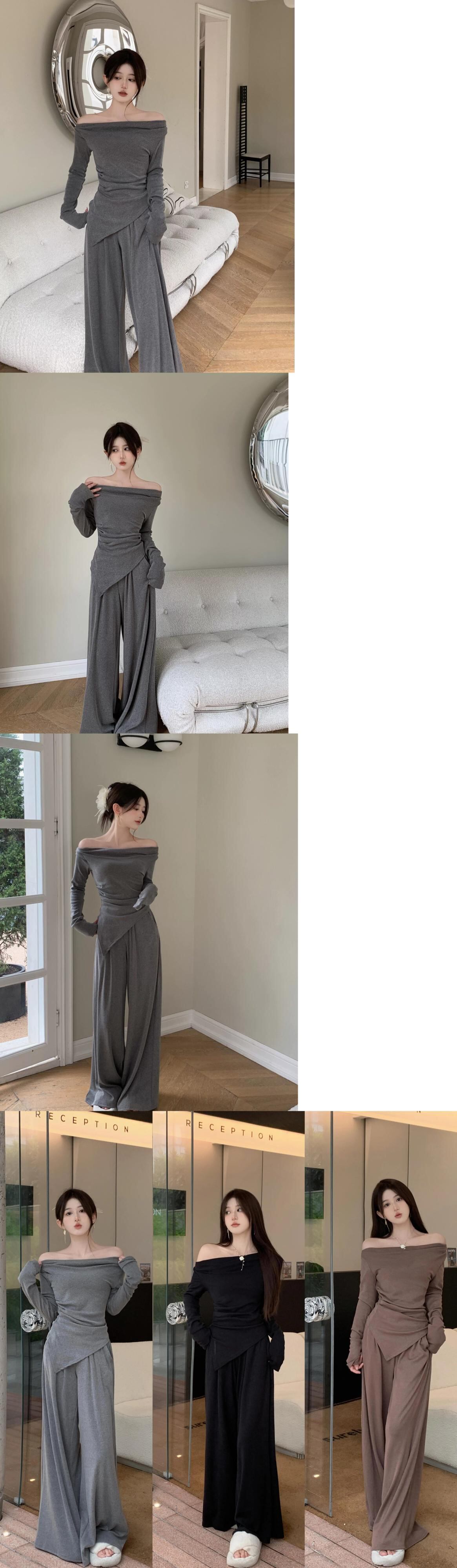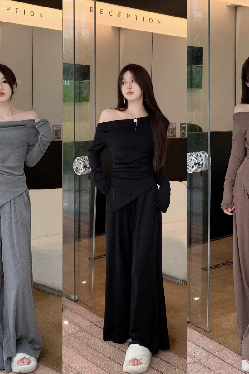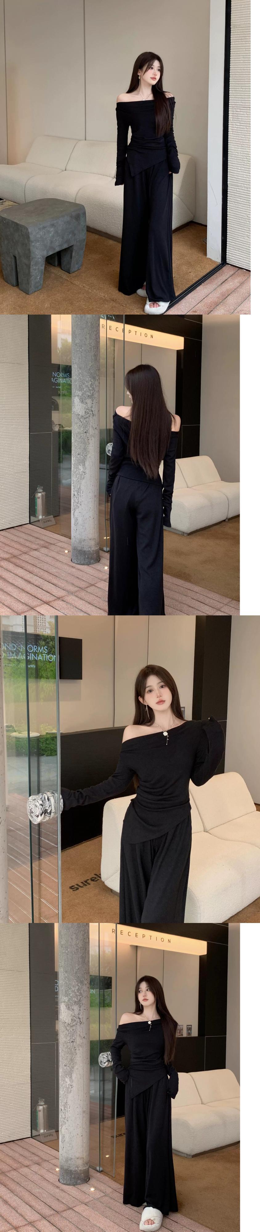 プラスサイズ レディース 太mm 秋 カジュアル イレギュラー ワンショルダー 長袖 トップス ハイウエスト 痩身 ワイドパンツ 2点セット ロング 大きめサイズ オータム 秋物 8884167606254169