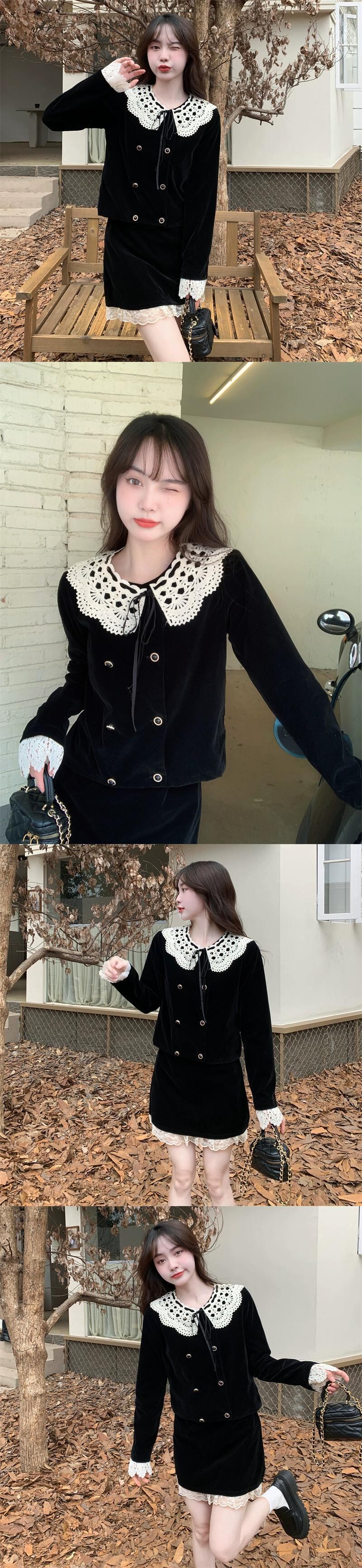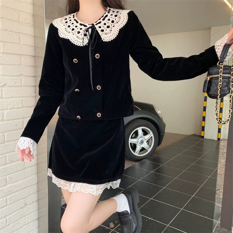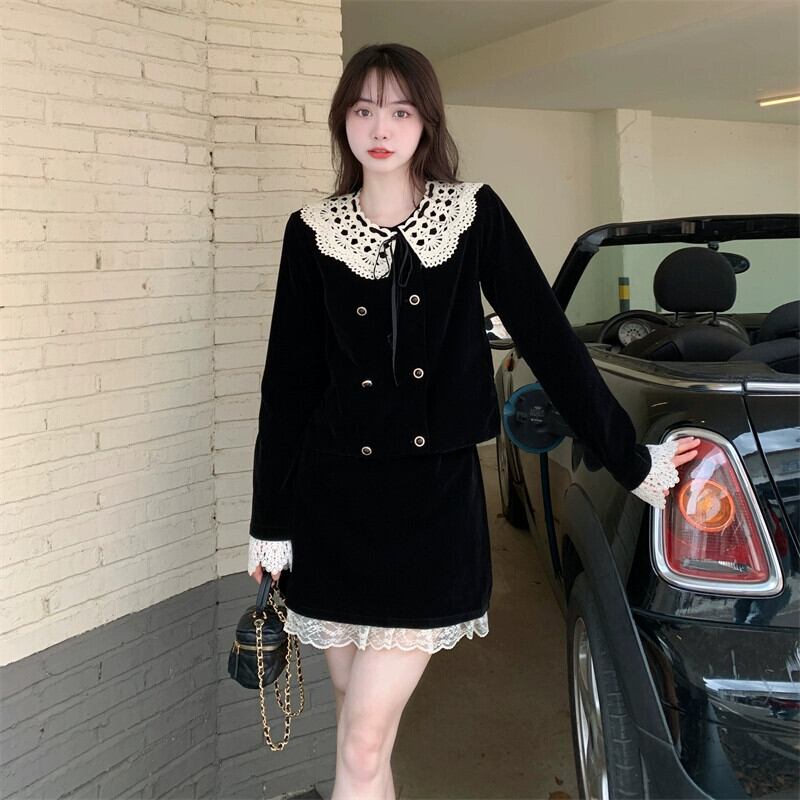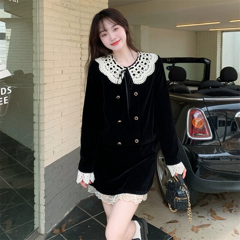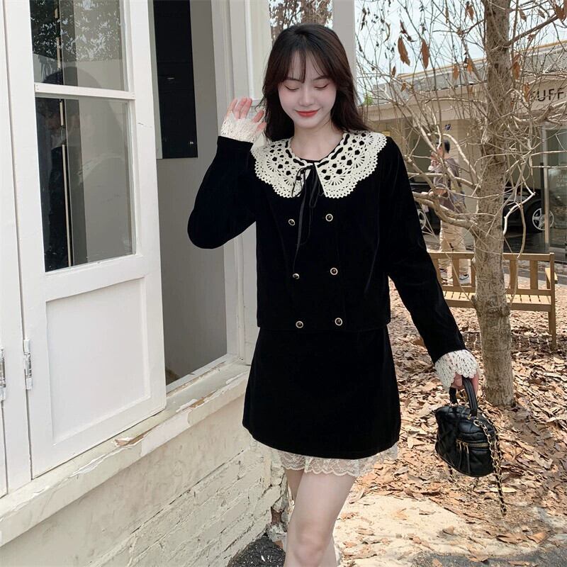 プラスサイズの女性の脂肪 mm 2023 新しい秋のファッション人形の襟黒ベルベットフレンチコートハイエンド 2 点セット ブラック 大きめサイズ オータム 秋物 8884146074462663