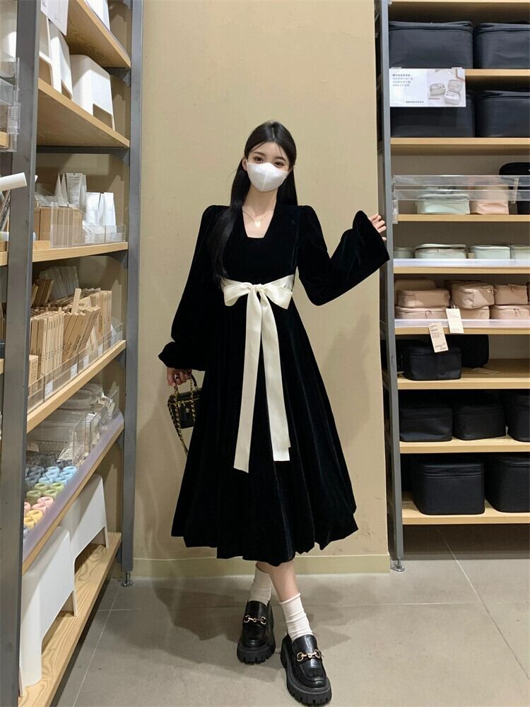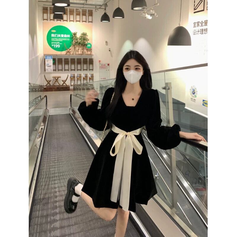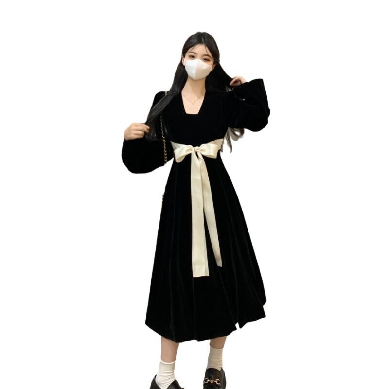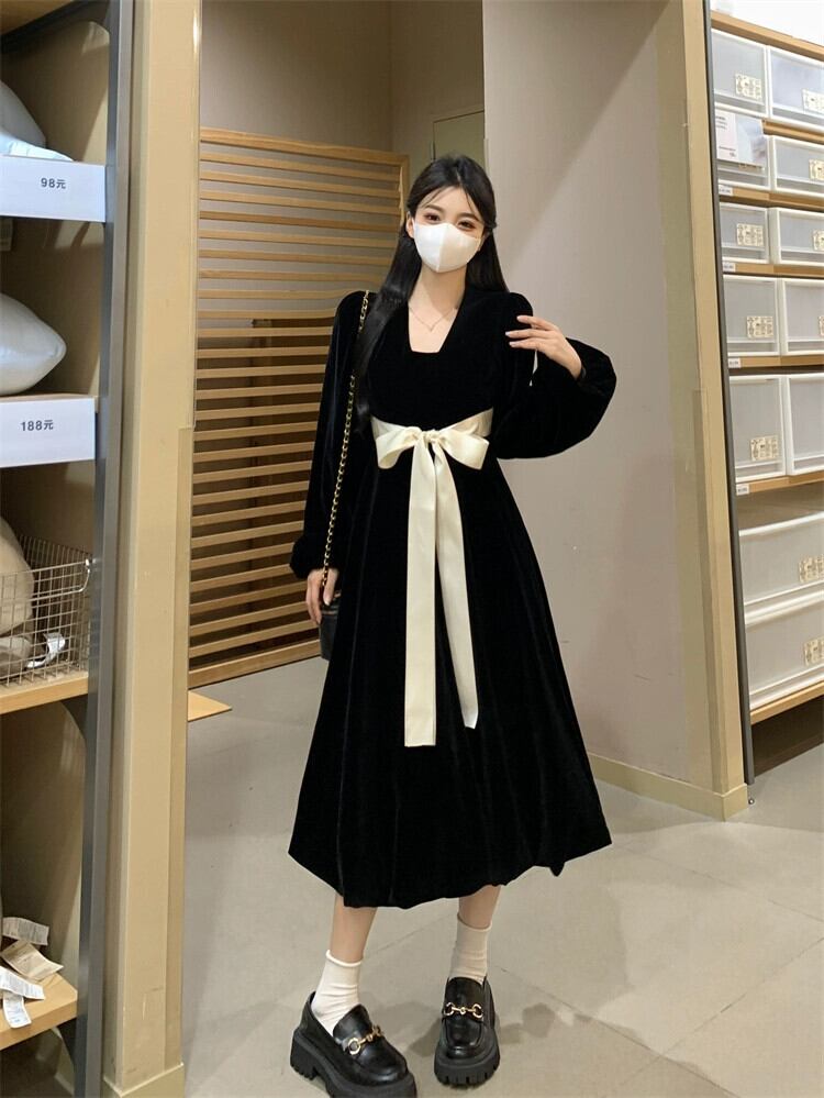 プラスサイズの婦人服ファット mm 秋の新 2023 フレンチ ヘップバーン スタイル A ライン スカートが股をカバーし、リボン スタイルのドレス 大きめサイズ オータム 秋物 Aライン 8884195269869519