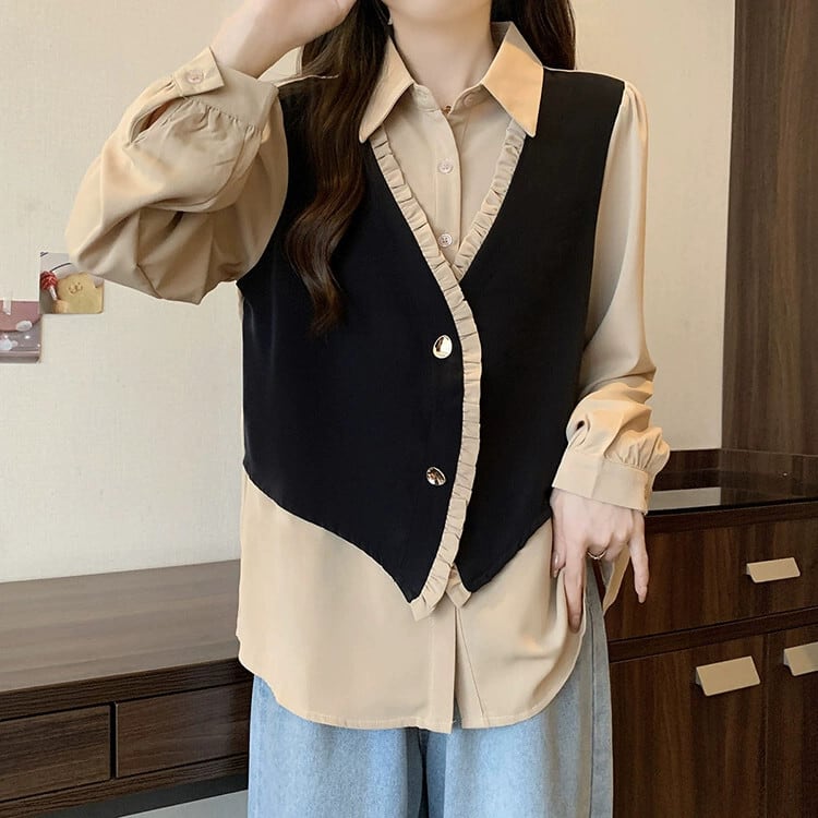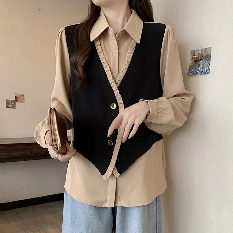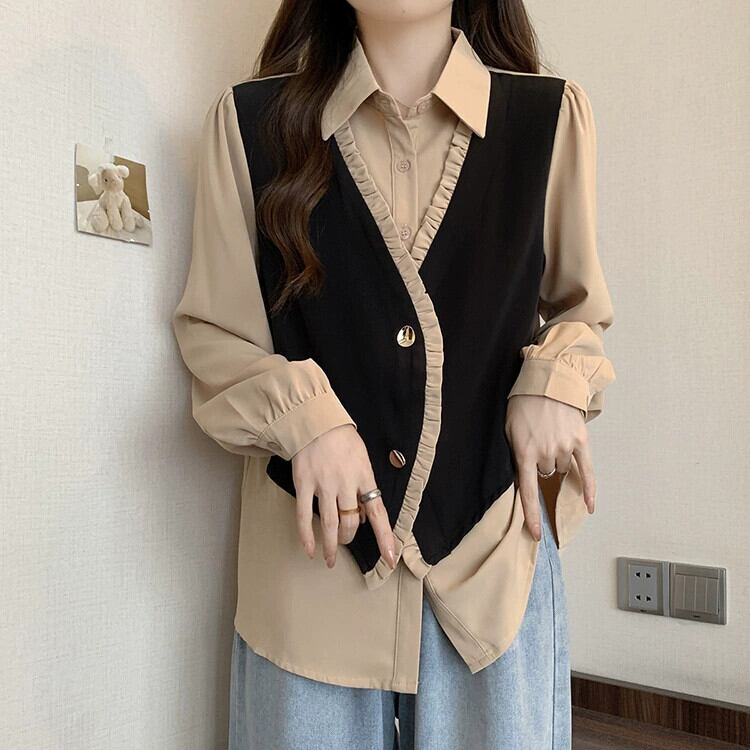プラスサイズの婦人服ファットミリメートル秋の新 2023 ファッションスプライシング偽ツーピースシャツデザインニッチシックなトップス 大きめサイズ オータム 秋物 8884190455916217