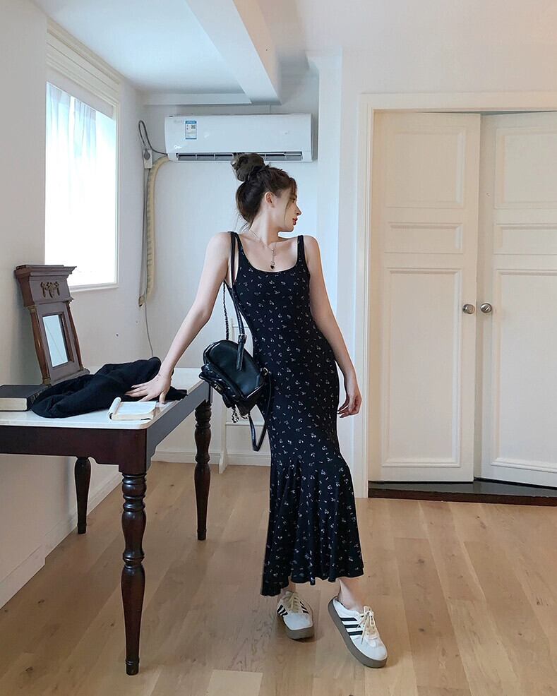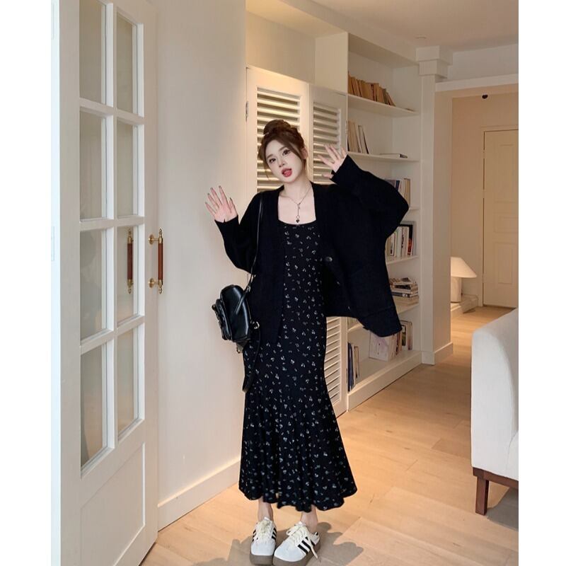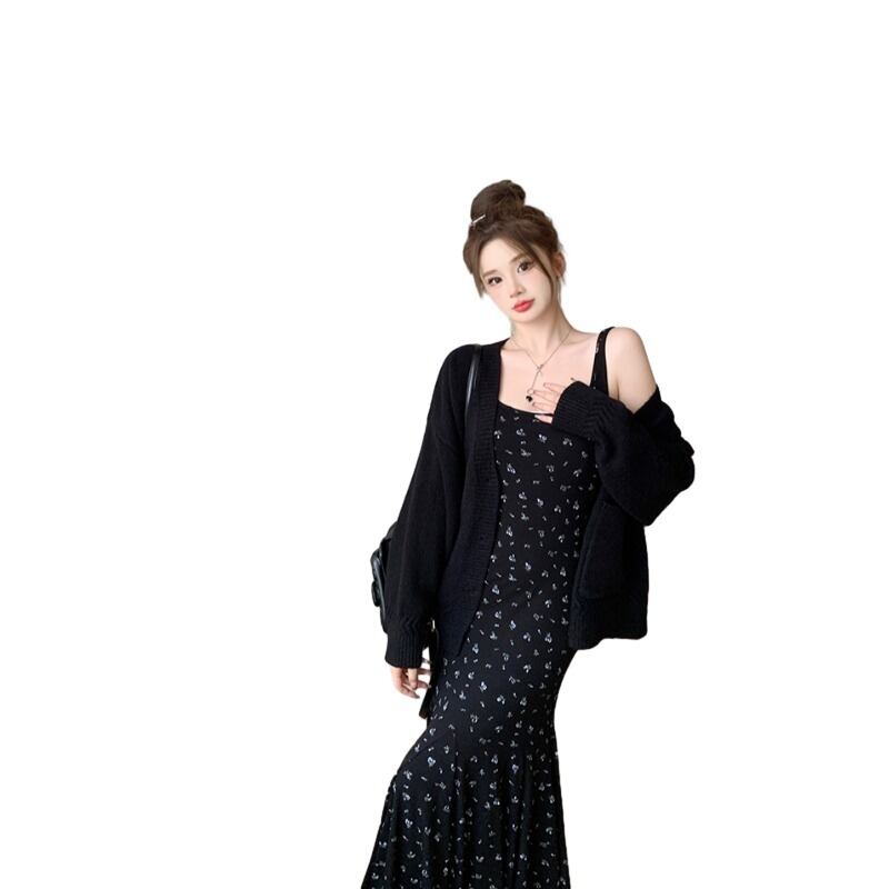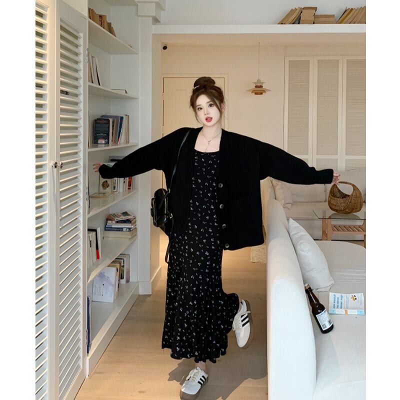 プラスサイズ脂肪ミリメートルスリム花サスペンダードレスハイエンド秋ニットカーディガンジャケットスーツツーピースセット女性 大きめサイズ オータム 秋物 花柄 8884172662502292