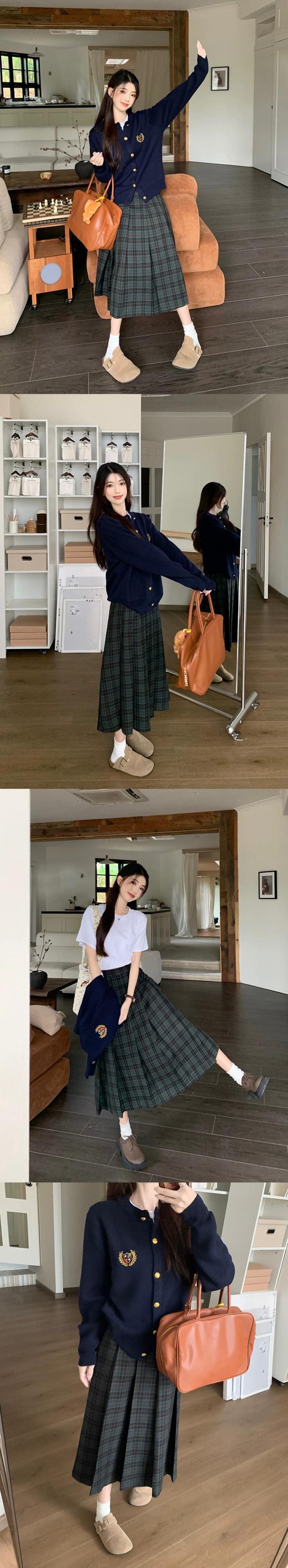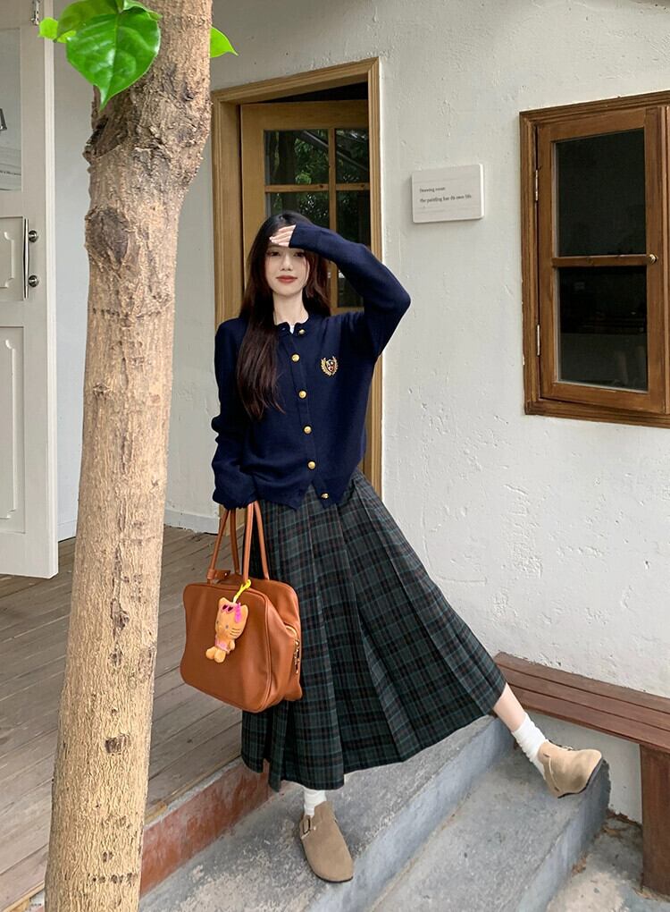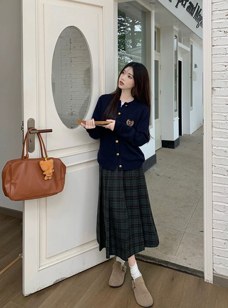 色:ネイビーブルーカーディガン,緑の格子縞のスカート,白い綿のTシャツ
