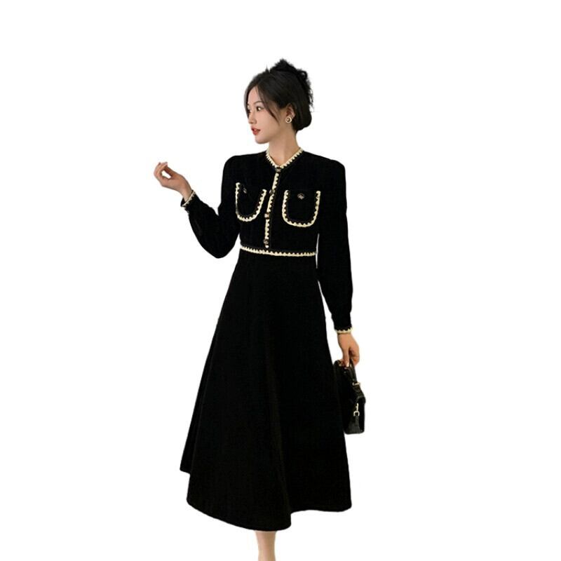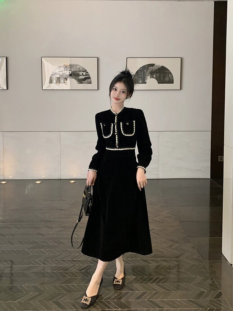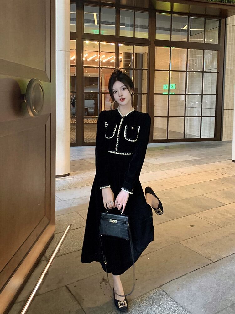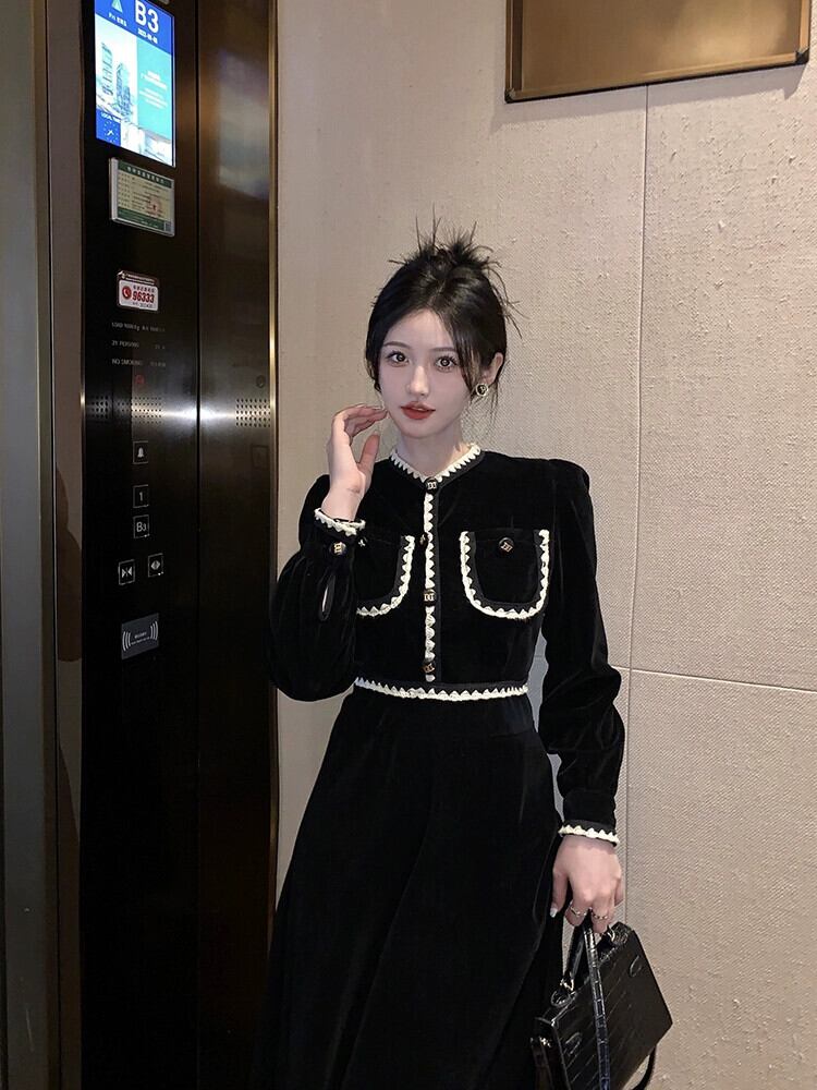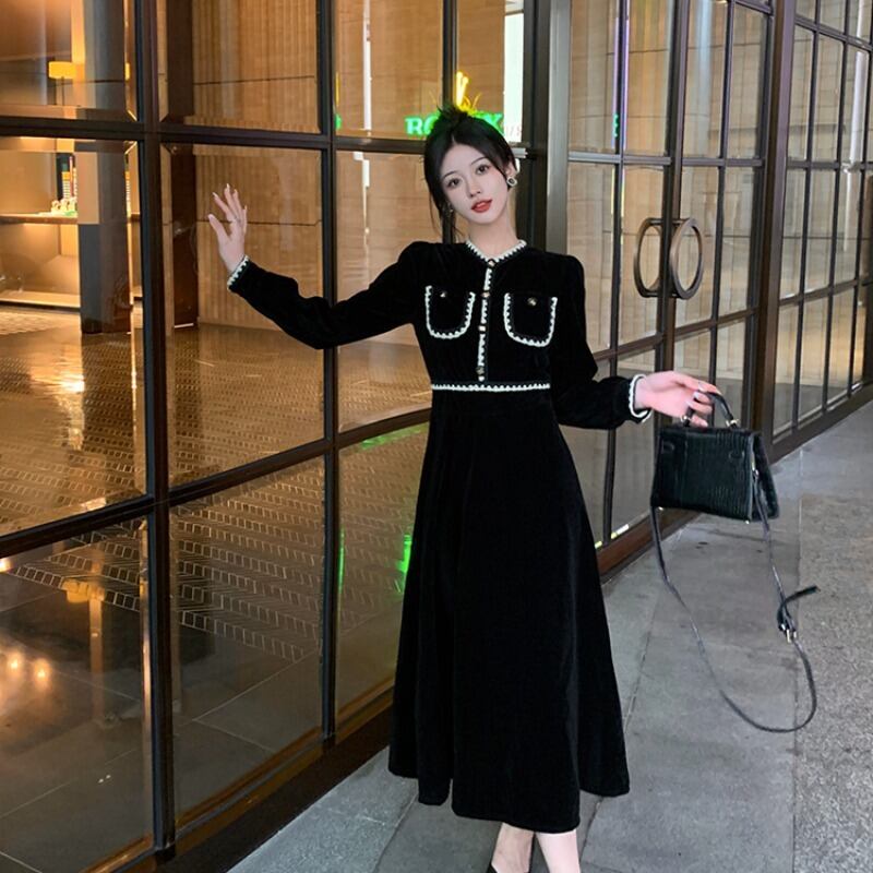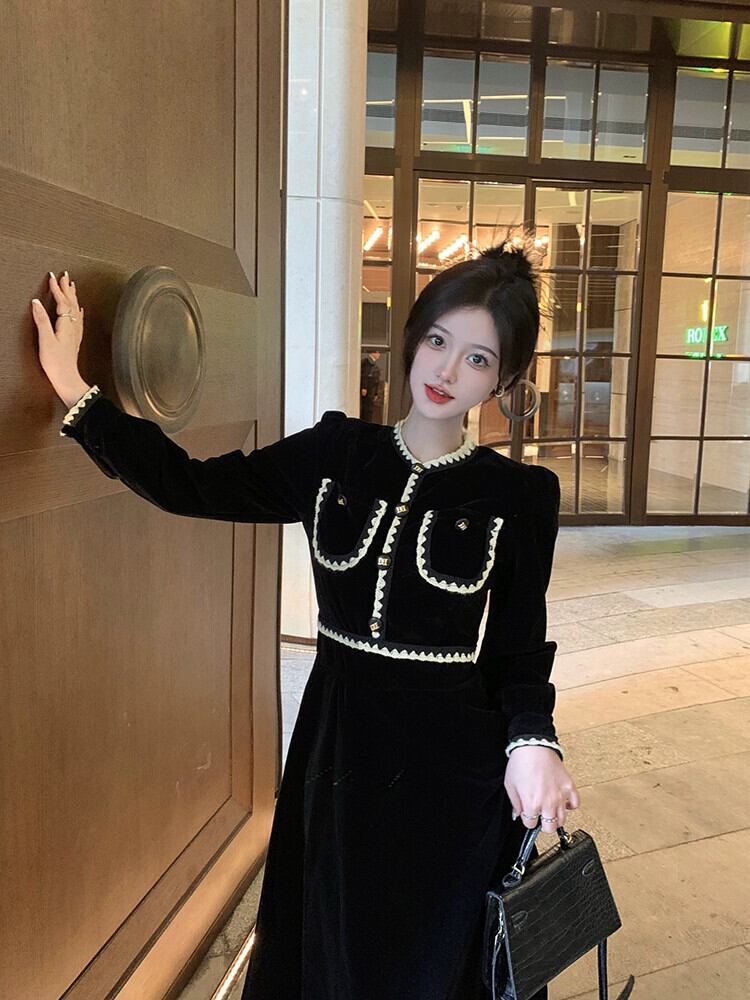 プラスサイズの婦人服ファットmm秋の新スタイル2023フレンチゴールドベルベットファッショナブルなリトルブラックスカートが股とハイエンドのドレスをカバー 大きめサイズ オータム 秋物 888412396414014