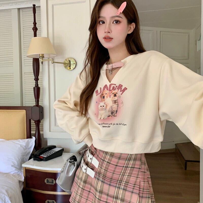 大きいサイズの漫画のプリント V ネック長袖怠惰なスタイルのスウェットシャツの女性の秋の新脂肪 mm 痩身トップ女性 ロング 大きめサイズ オータム 秋物 Vネック 888415108398452