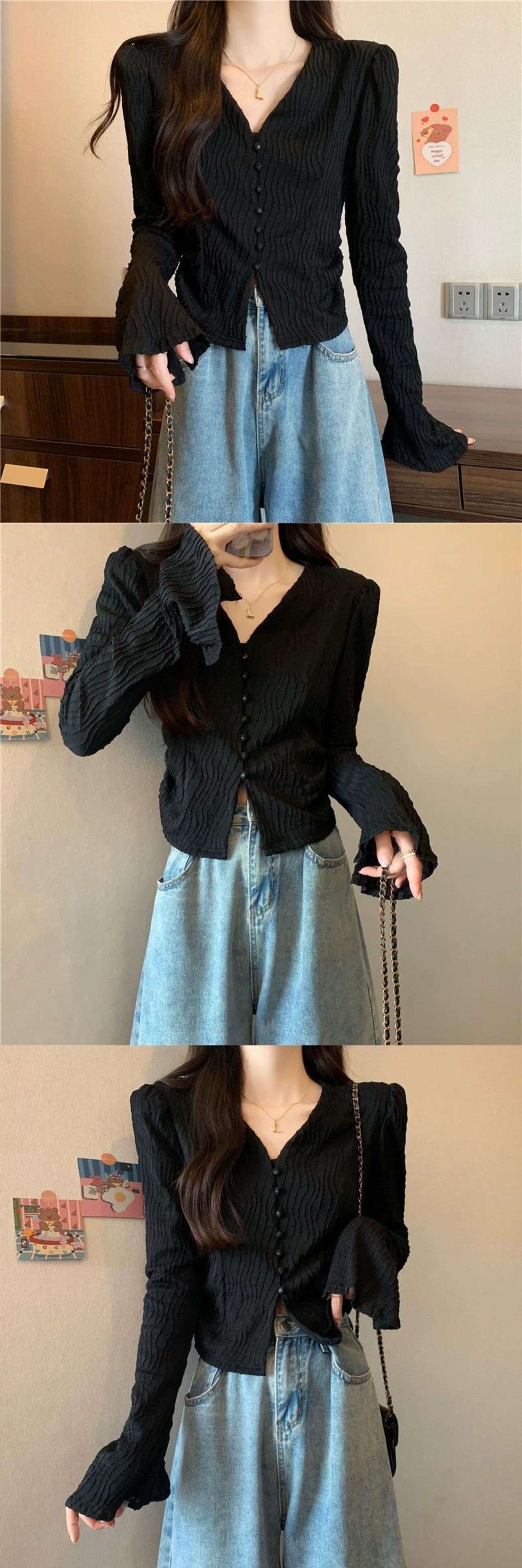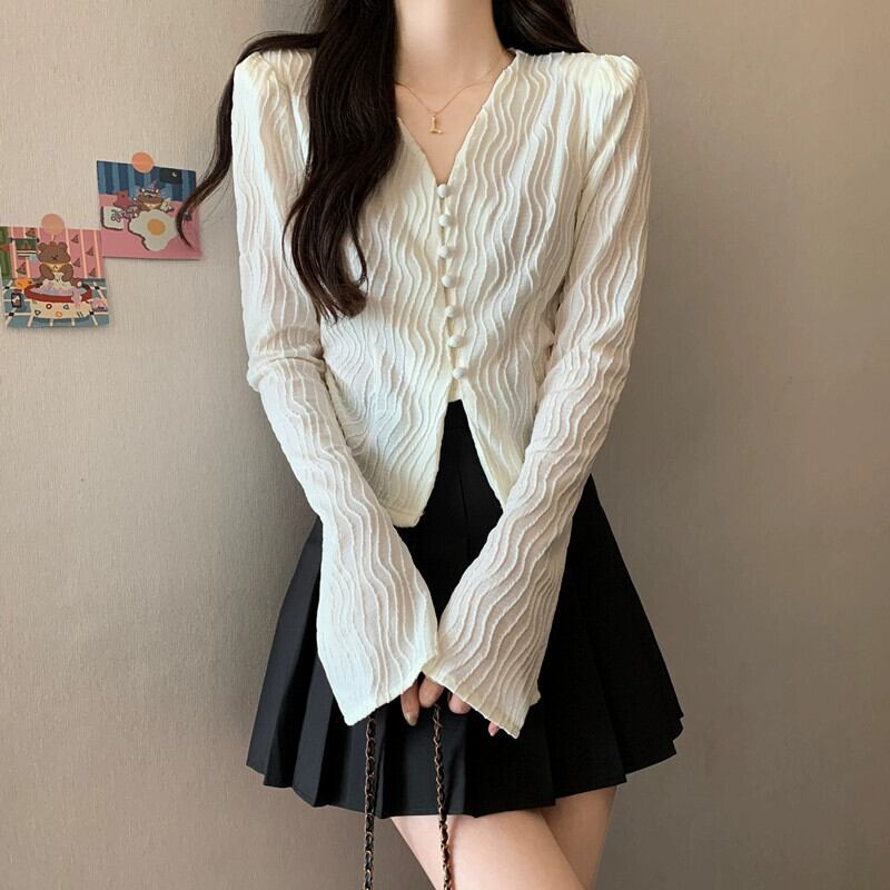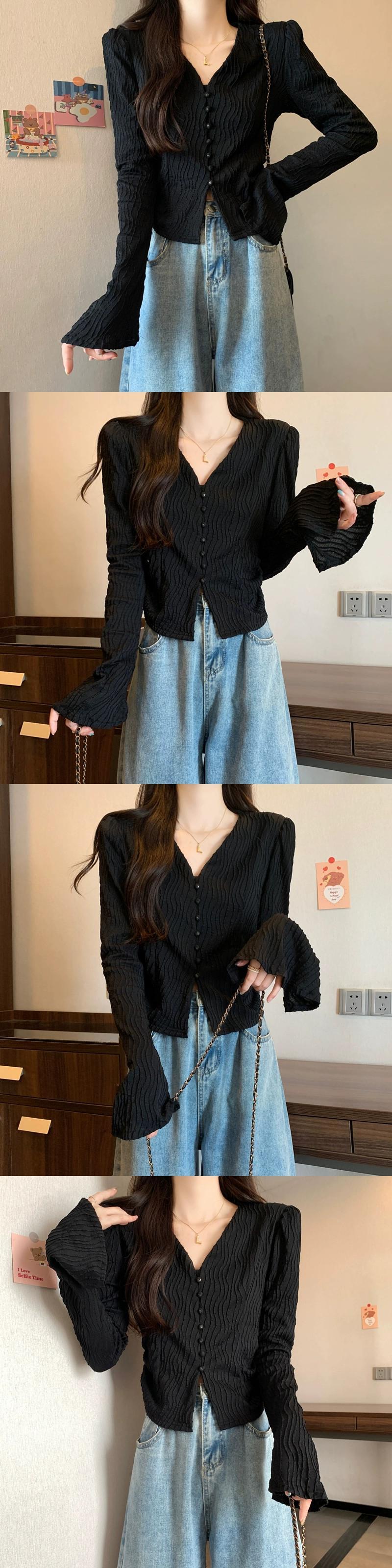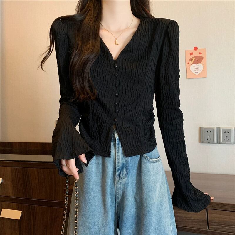 大きいサイズ太いmmフランスの気質スリム長袖秋の新しい女性の優しいスタイルVネックボタンベルスリーブトップ ロング 大きめサイズ オータム 秋物 8884113102450458