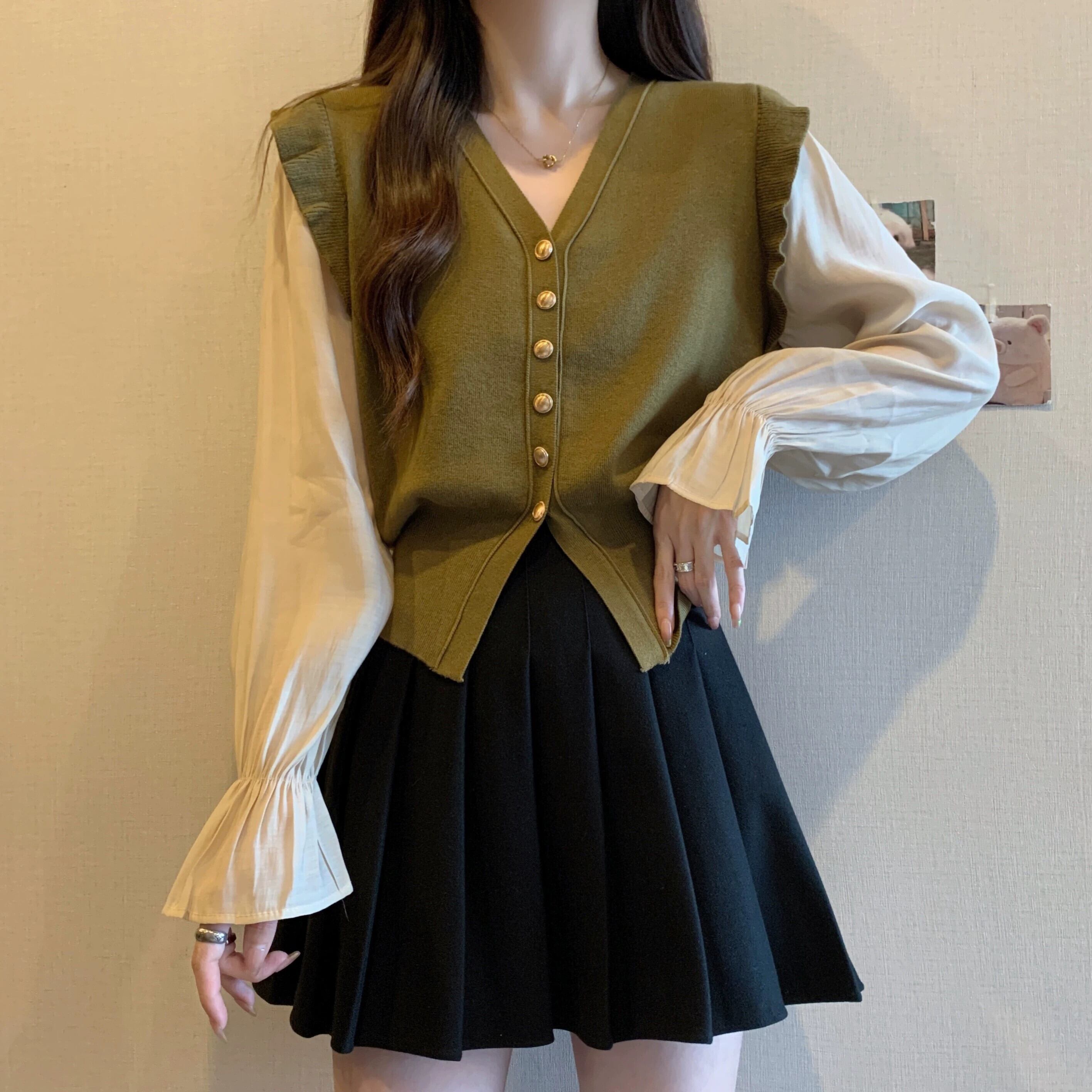 プラスサイズの婦人服ファット mm 秋の新スタイル 2023 フリル V ネックカーディガンセータースプライシング年齢軽減肉カバートップ 大きめサイズ オータム 秋物 Vネック 8884150831941744