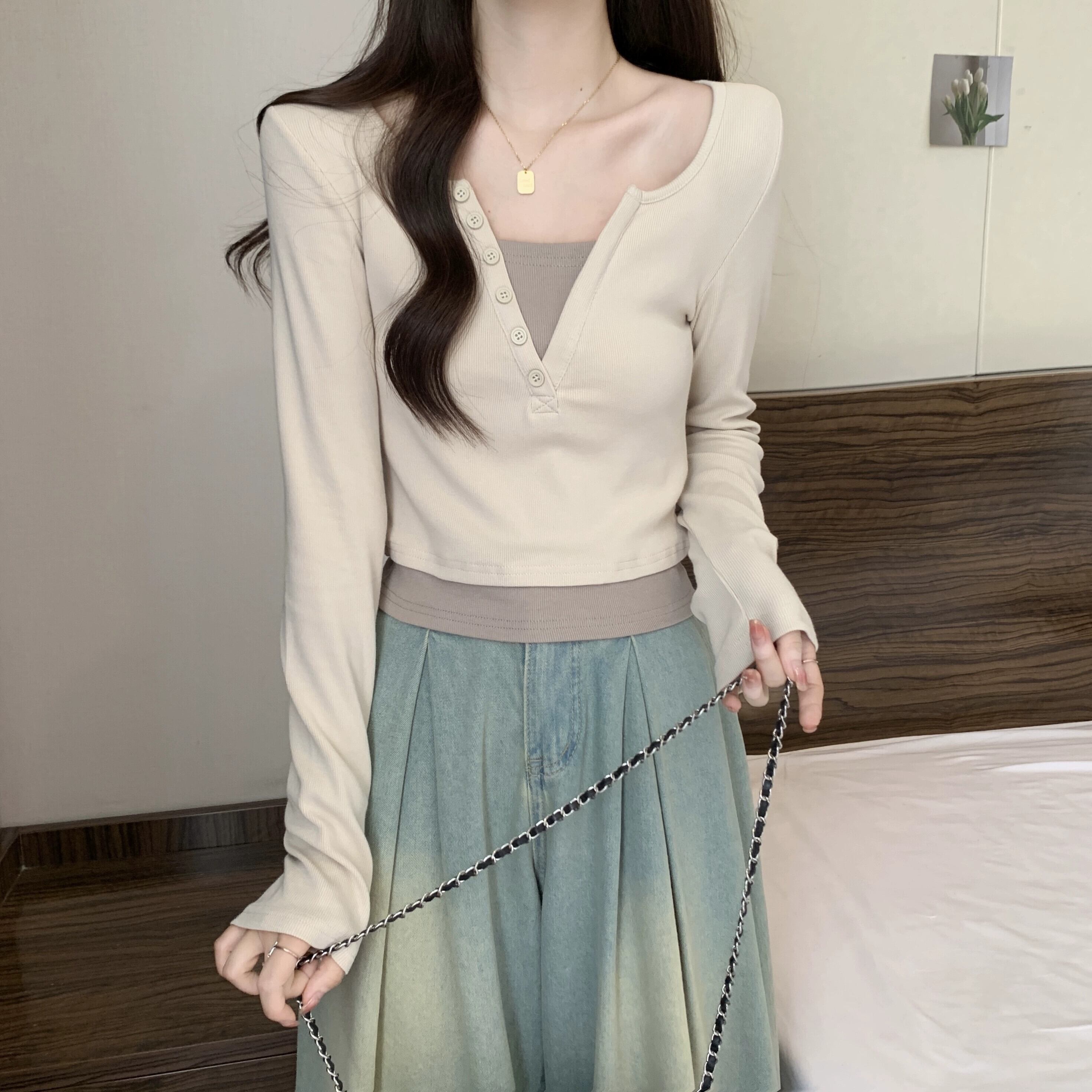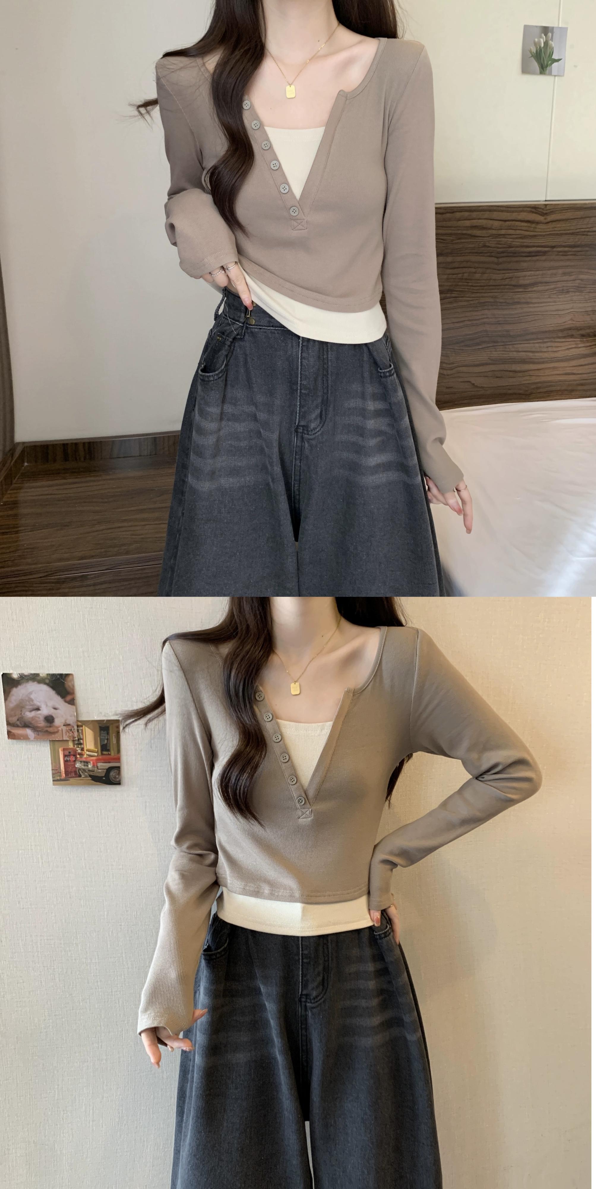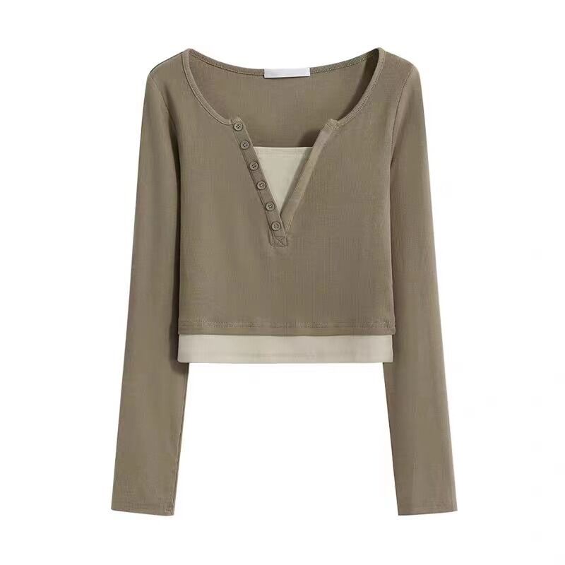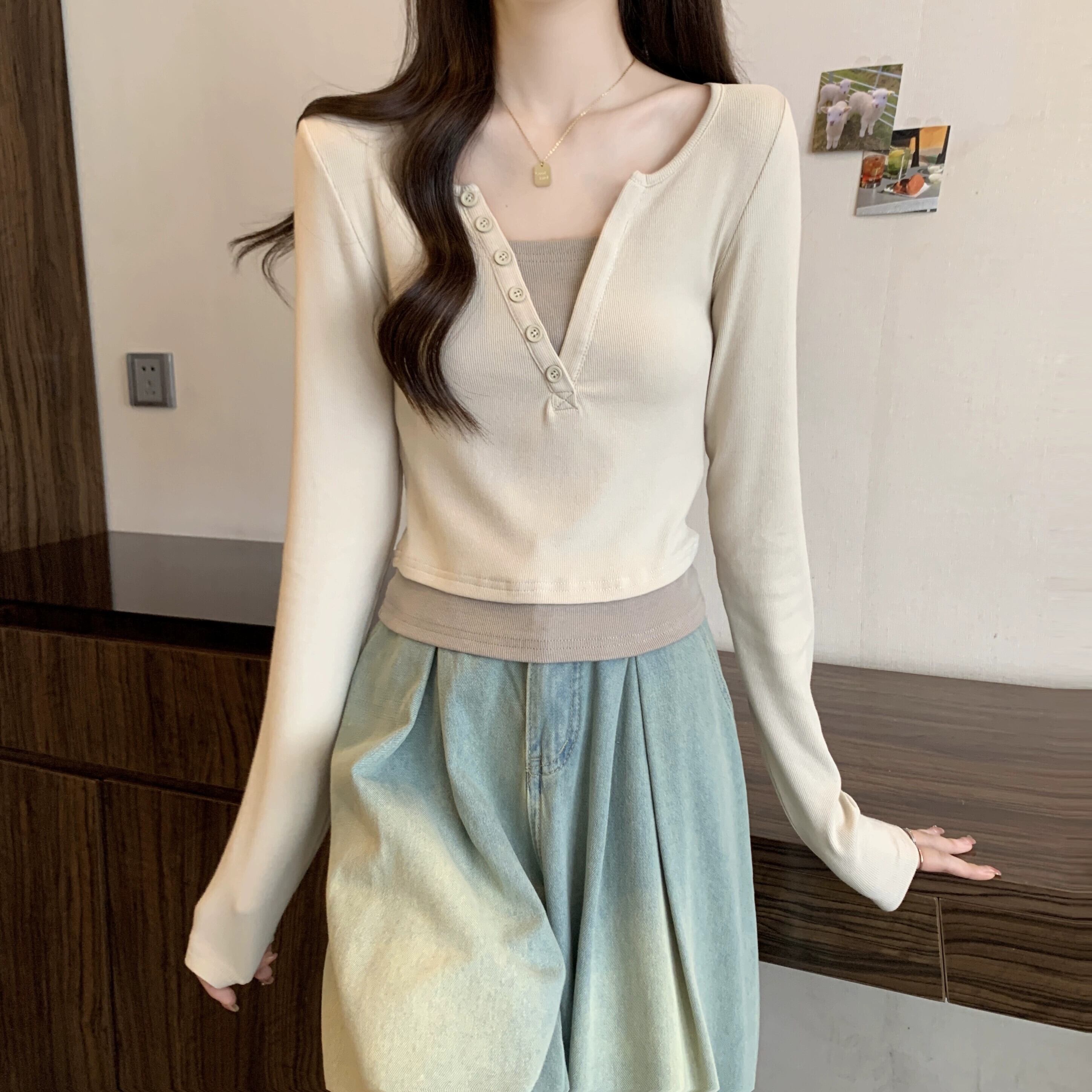 大きいサイズ右肩 V ネック長袖 Tシャツ女性の秋のボトリングシャツファット mm スリムショートフェイクツーピーストップ西洋スタイルの小さいシャツ ロング 大きめサイズ オータム 秋物 Vネック 8884194660236405
