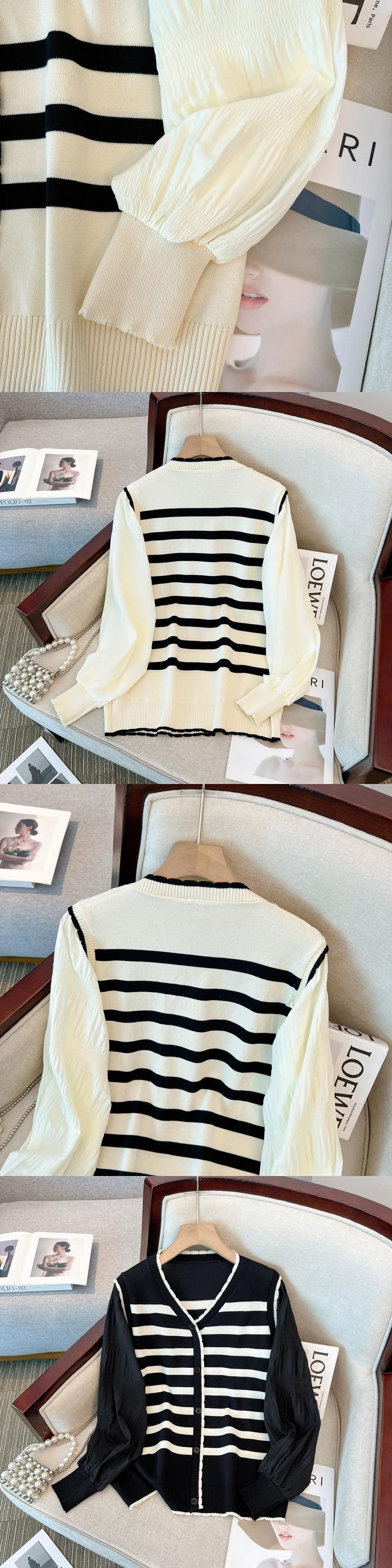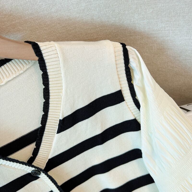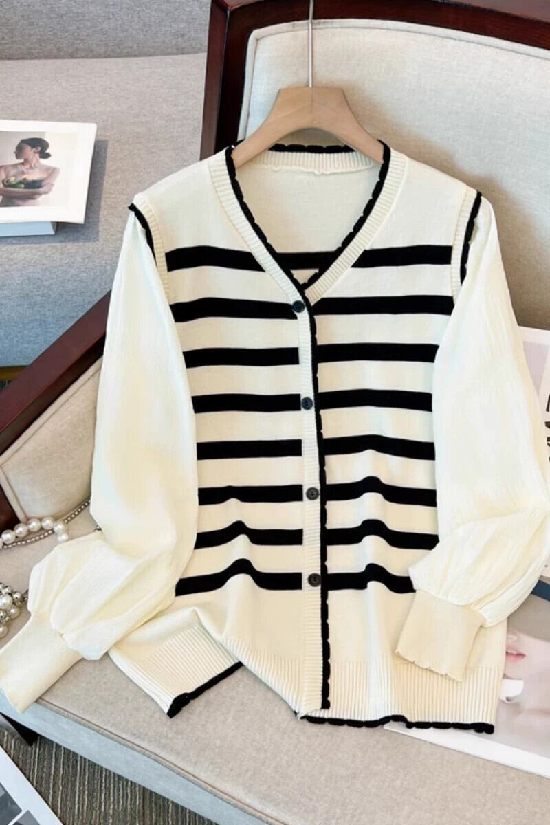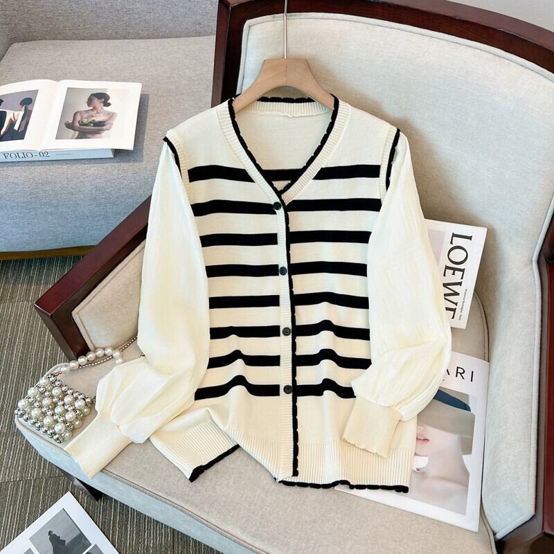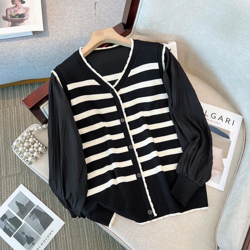 プラスサイズの女性の新しいセーターカーディガン V ネックランタンスリーブトップわずかに太い mm ルーズスプライシングフェイクツーピースストライプ 大きめサイズ Vネック 8884144639272800