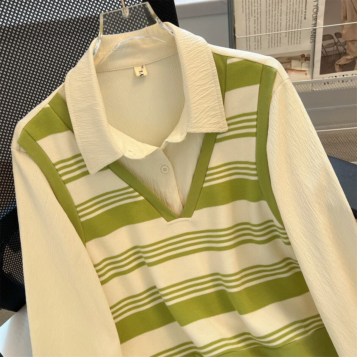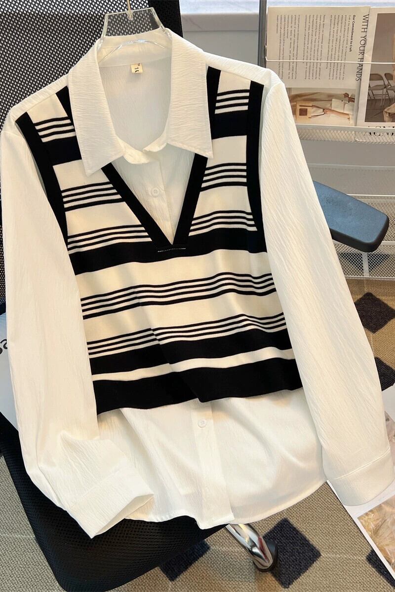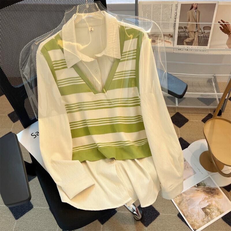 シャツ女性プラスサイズ 2023 新しい秋脂肪 mm フェイクツーピースストライプ長袖ニットパッチワークトップは、肉をカバーし、スリムに見えます ロング 大きめサイズ オータム 秋物 8884145215196406