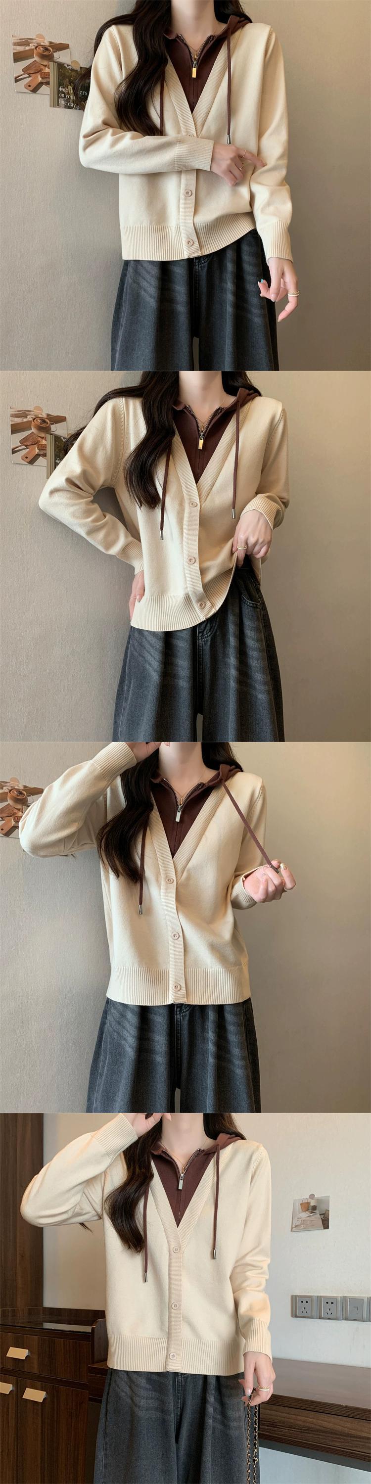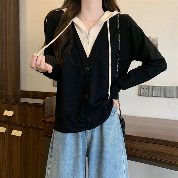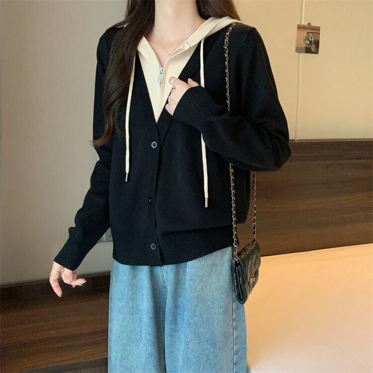 プラスサイズの女性のファット mm 秋冬の新スタイル 2023 対照的な色のフード付きセーターフェイクツーピースカーディガン多用途トップ 大きめサイズ オータム 秋物 ウィンター 冬物 8884164419723398