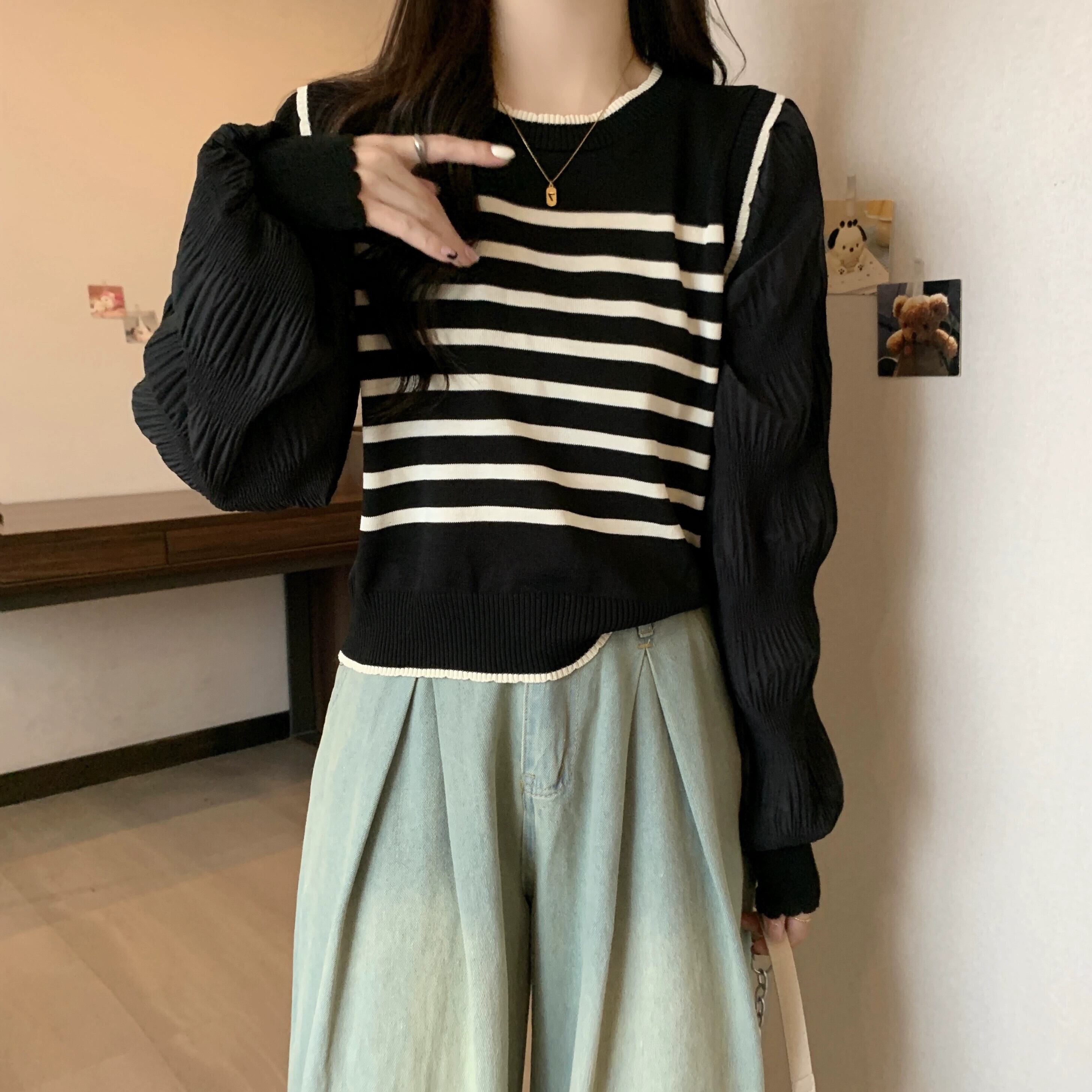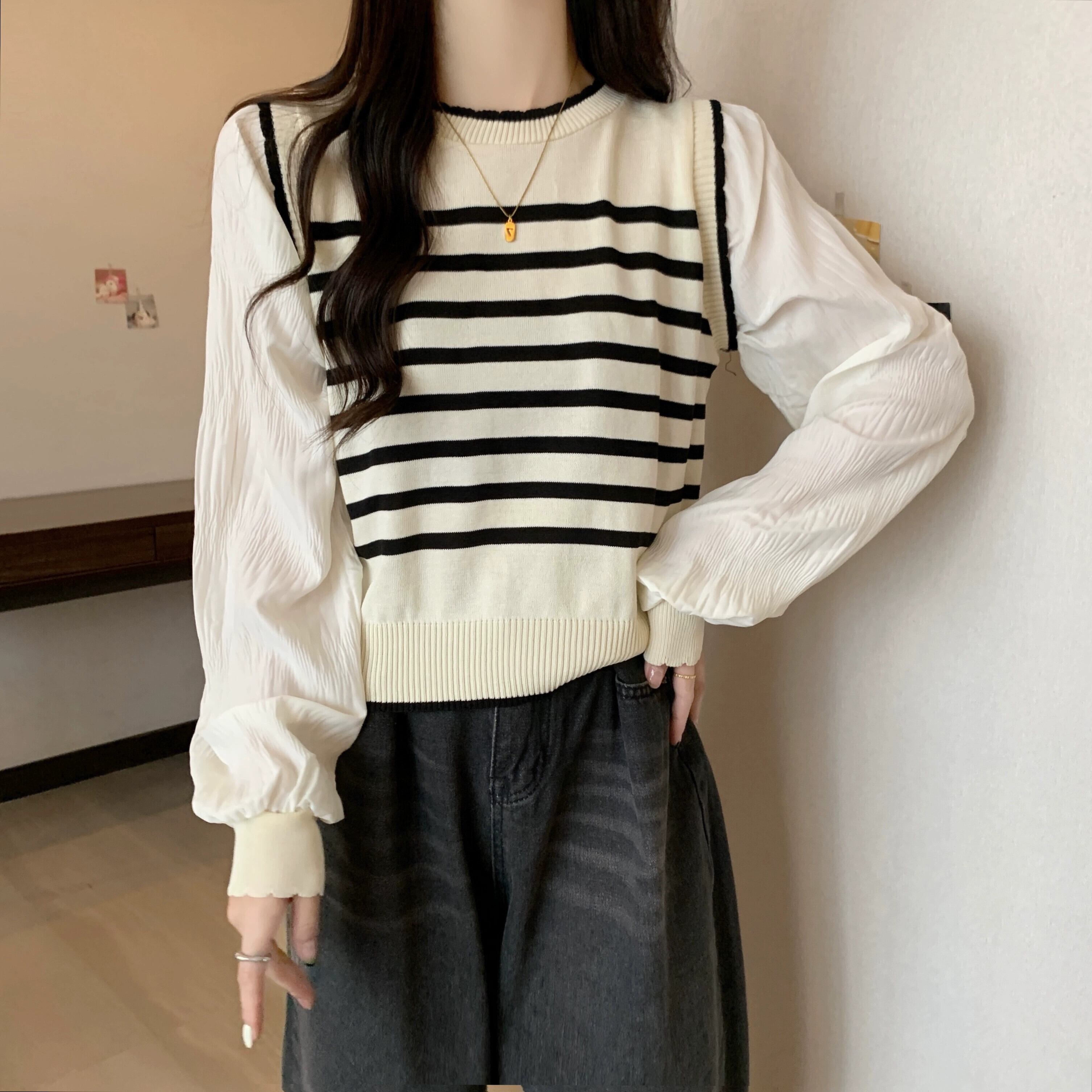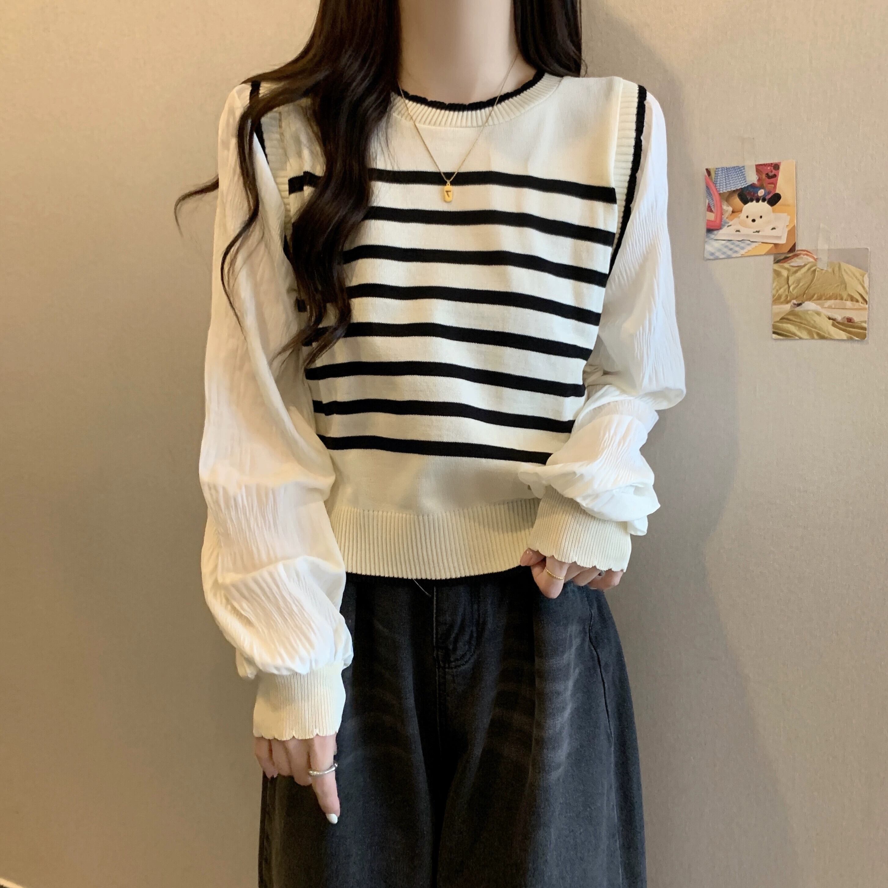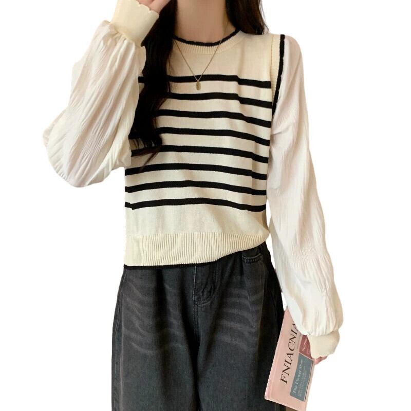 プラスサイズの婦人服ファットミリメートル 2023 新しい秋スタイル痩身ルーズフェイクツーピーストップシフォンスプライシングストライプセーター 大きめサイズ 8884186087888855