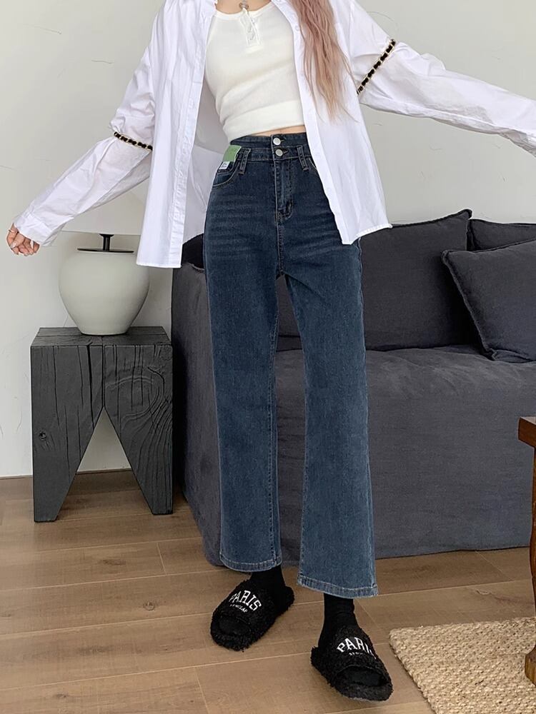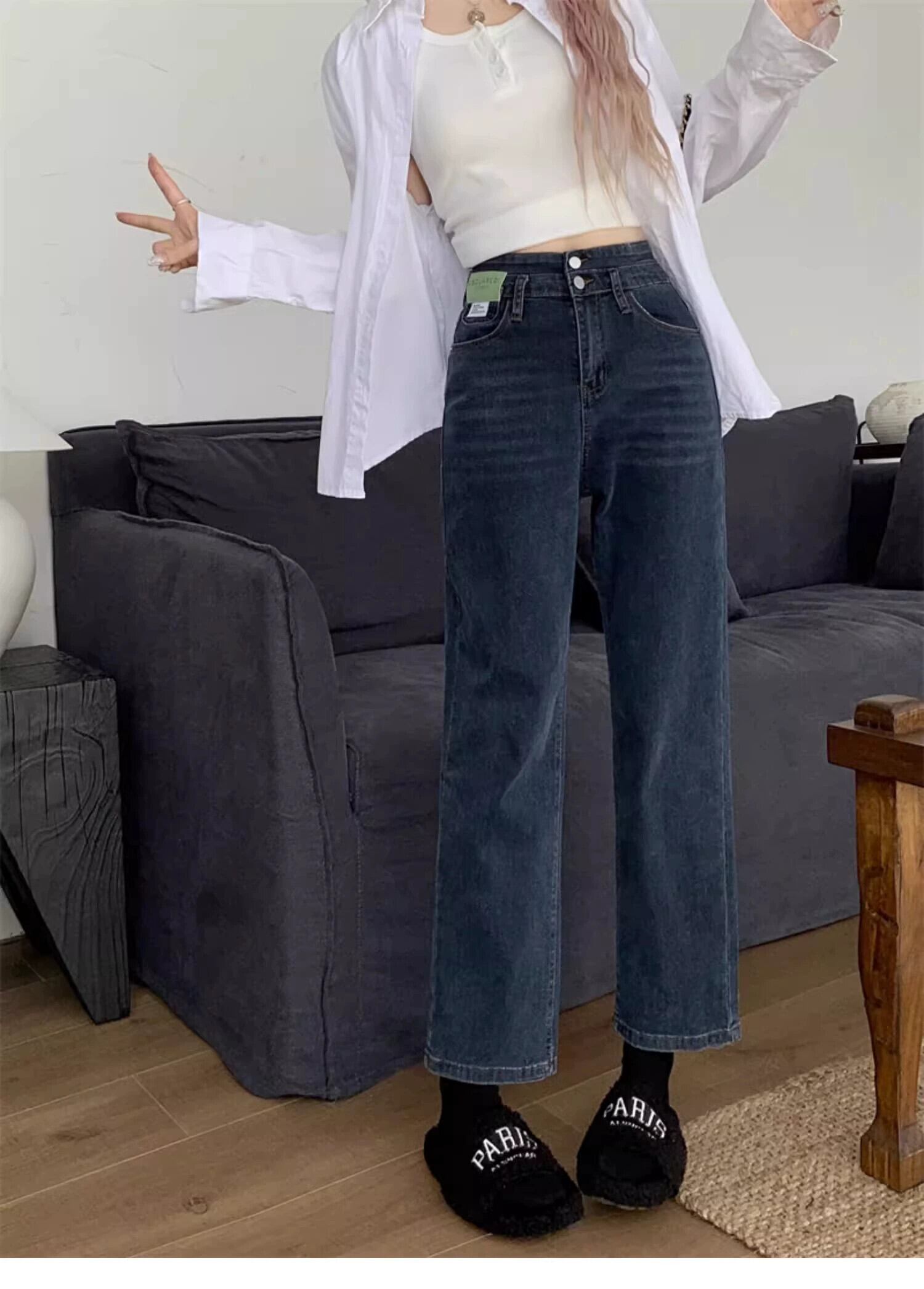 プラスサイズの婦人服 2023 ファットシスター秋の新ダークジーンズストレートハイウエストスリムストレッチ 9 点シガレットパンツ ハイウェスト 大きめサイズ オータム 秋物 8884149029954634