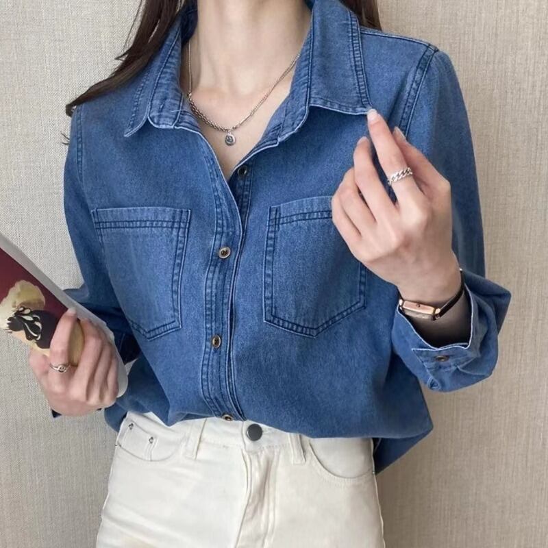 プラスサイズの女性のレトロデニムシャツ香港スタイルのデザイントップス脂肪ミリメートル新しい秋の長袖スタイルシャツ ロング 大きめサイズ オータム 秋物 8884112303461619
