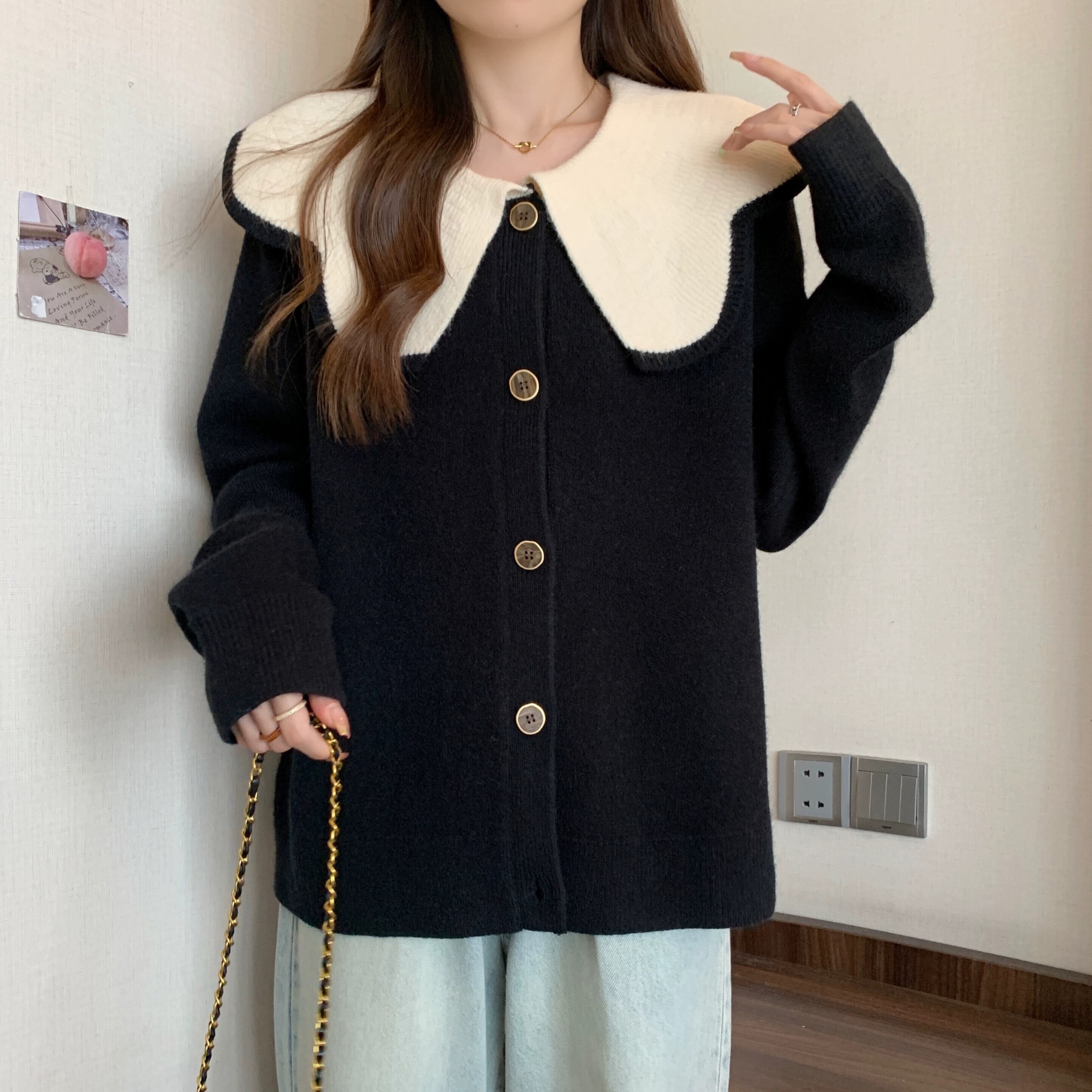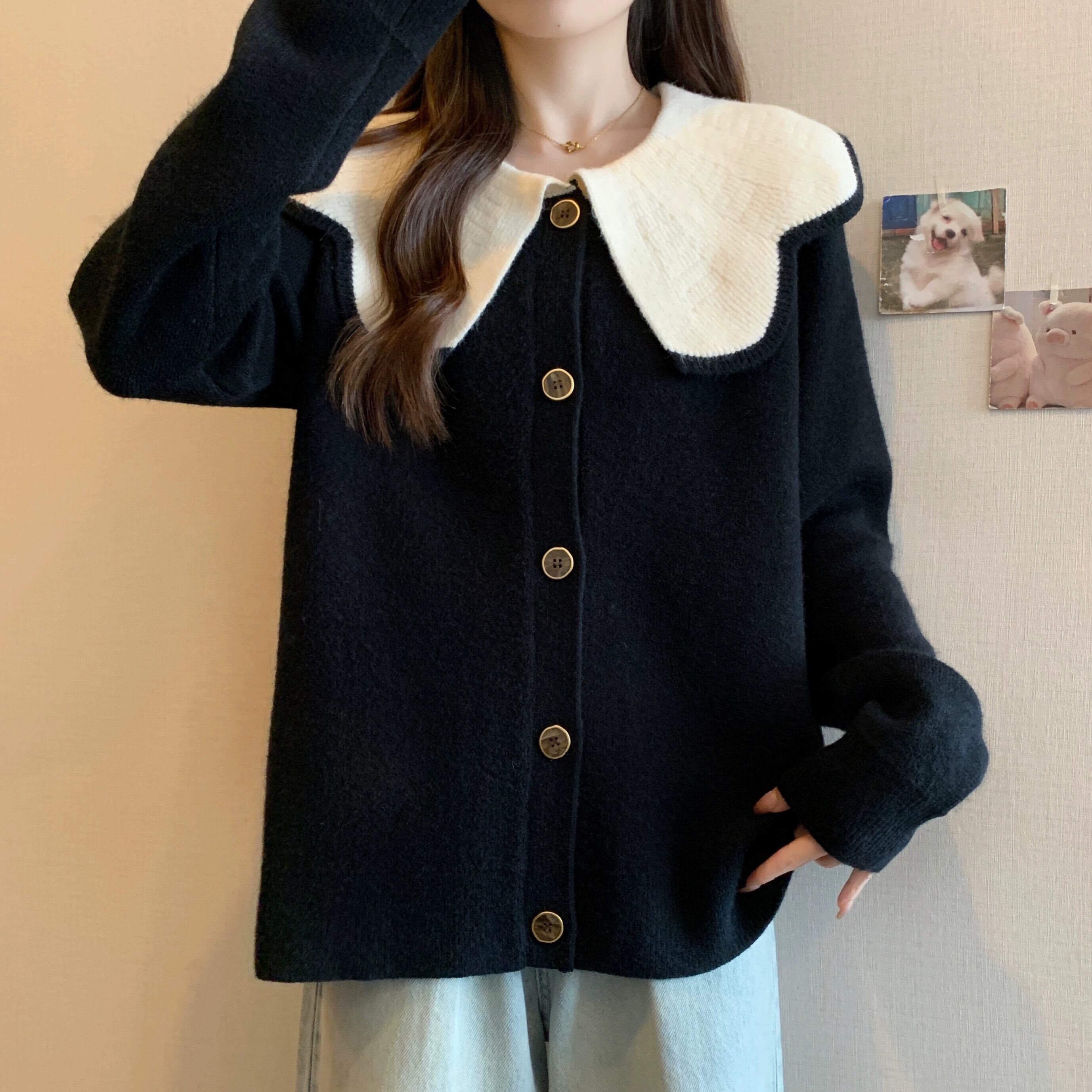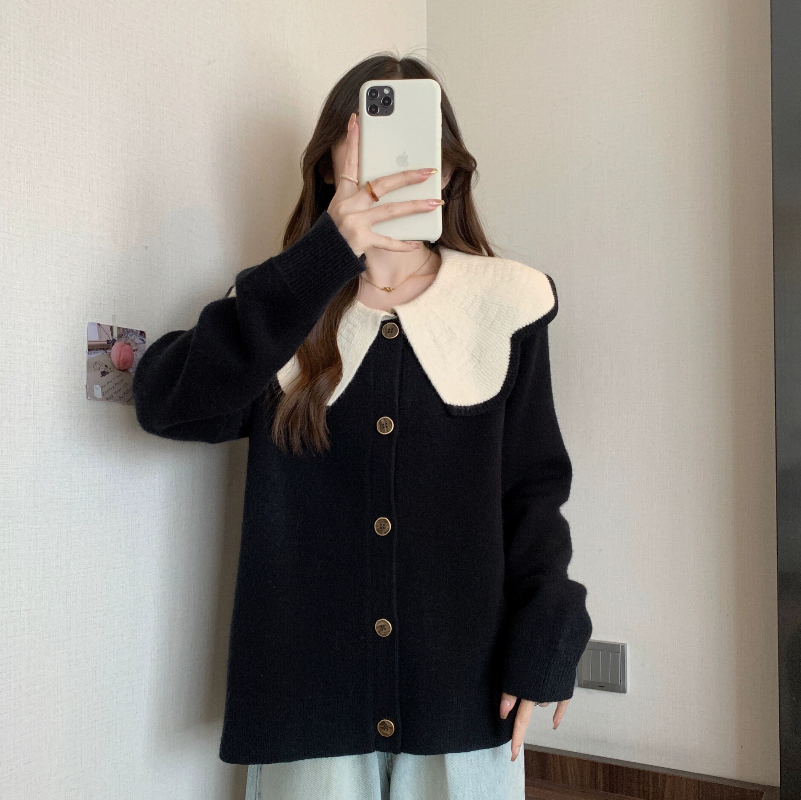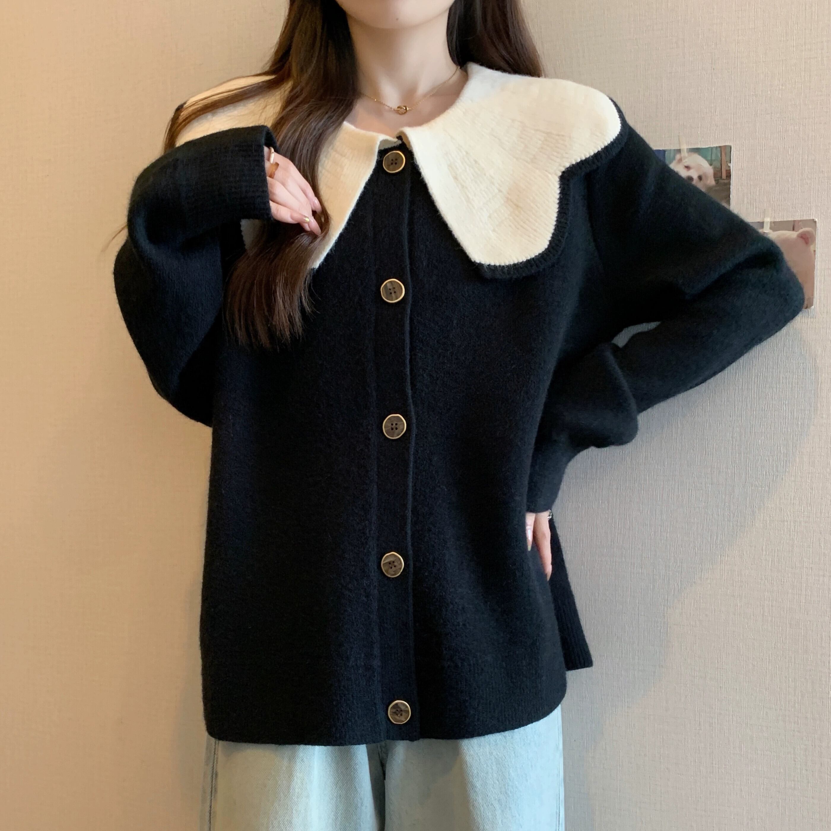 プラスサイズの女性のファット MM カーディガン セーター女性の新しい 2023 対照的な色の人形の襟シングルブレストのセーターゆったりとスリム 大きめサイズ 888417105920608
