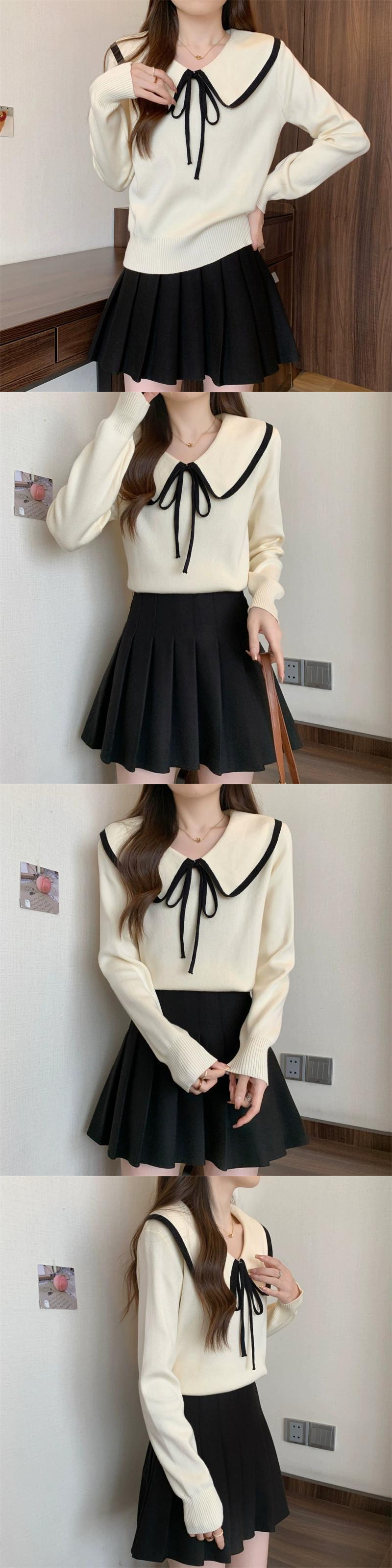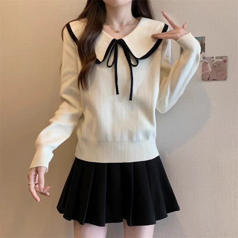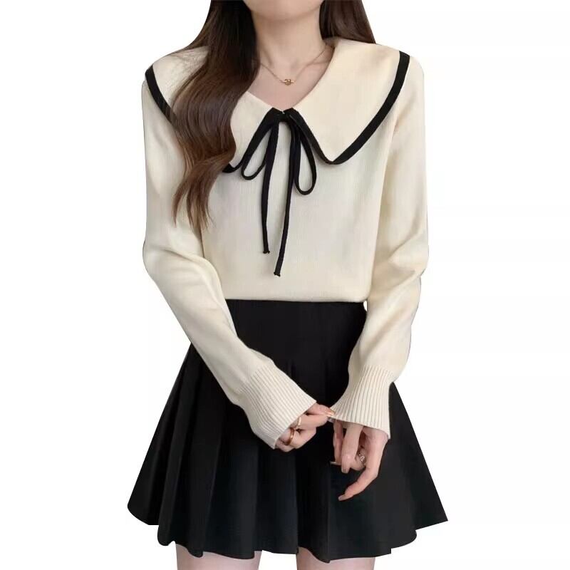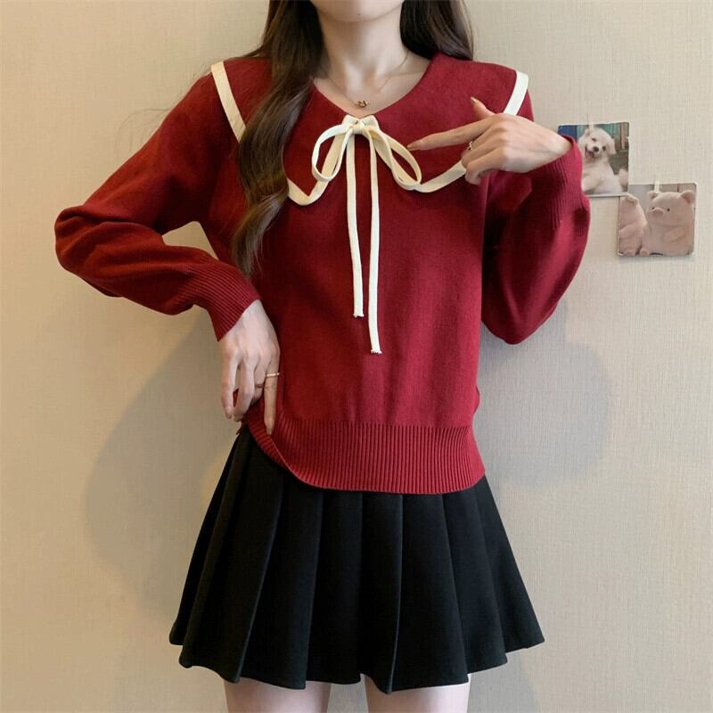 プラスサイズの女性のショートセーター女性の秋冬 2023 新しいデザイン人形の襟の弓ルーズセータートレンディな リボン 大きめサイズ オータム 秋物 ウィンター 冬物 8884120028410129