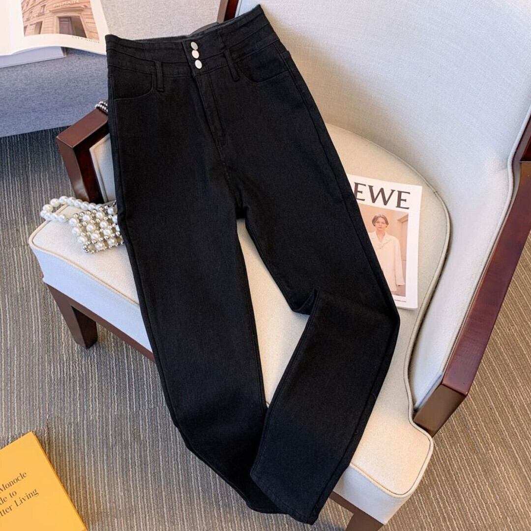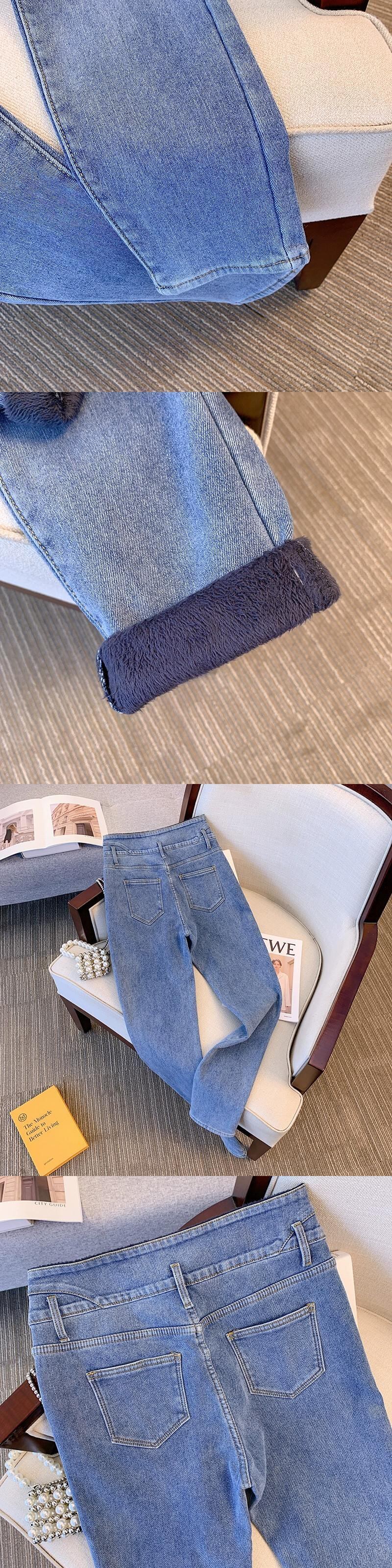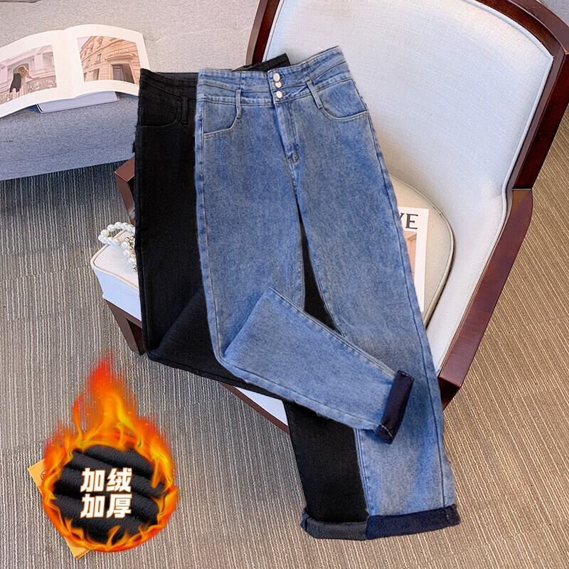 プラスサイズの女性の 2023 冬の新ジーンズファット MM ソリッドカラーハイウエスト痩身プラスベルベット肥厚小脚パンツトレンディ ハイウェスト 大きめサイズ ウィンター 冬物 8884149046259714