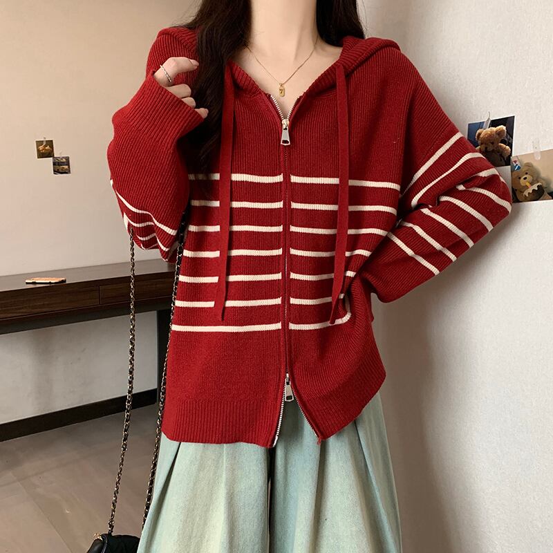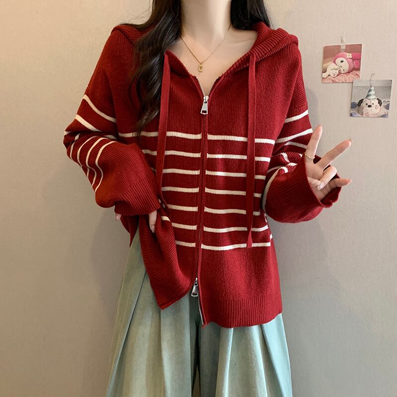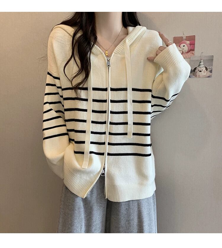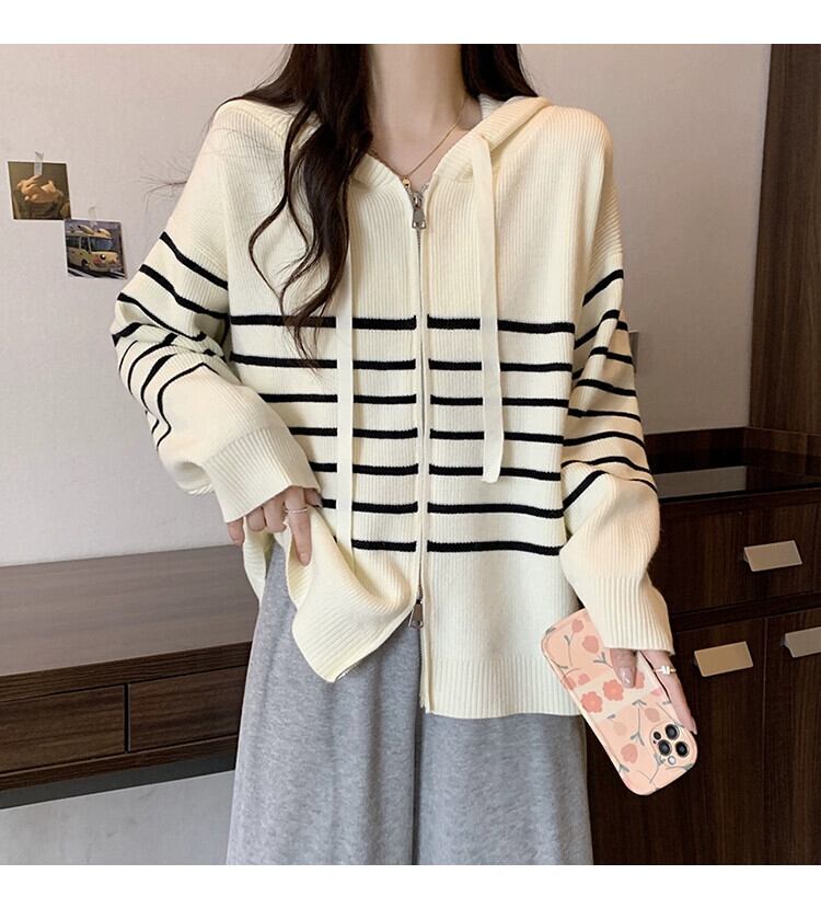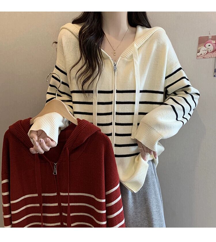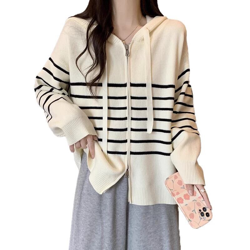 2023 秋と冬の新しいプラスサイズの女性のファット mm カーディガンフード付きストライプニットトップファッショナブルな多用途長袖セーター ロング 大きめサイズ オータム 秋物 ウィンター 冬物 8884142604361452
