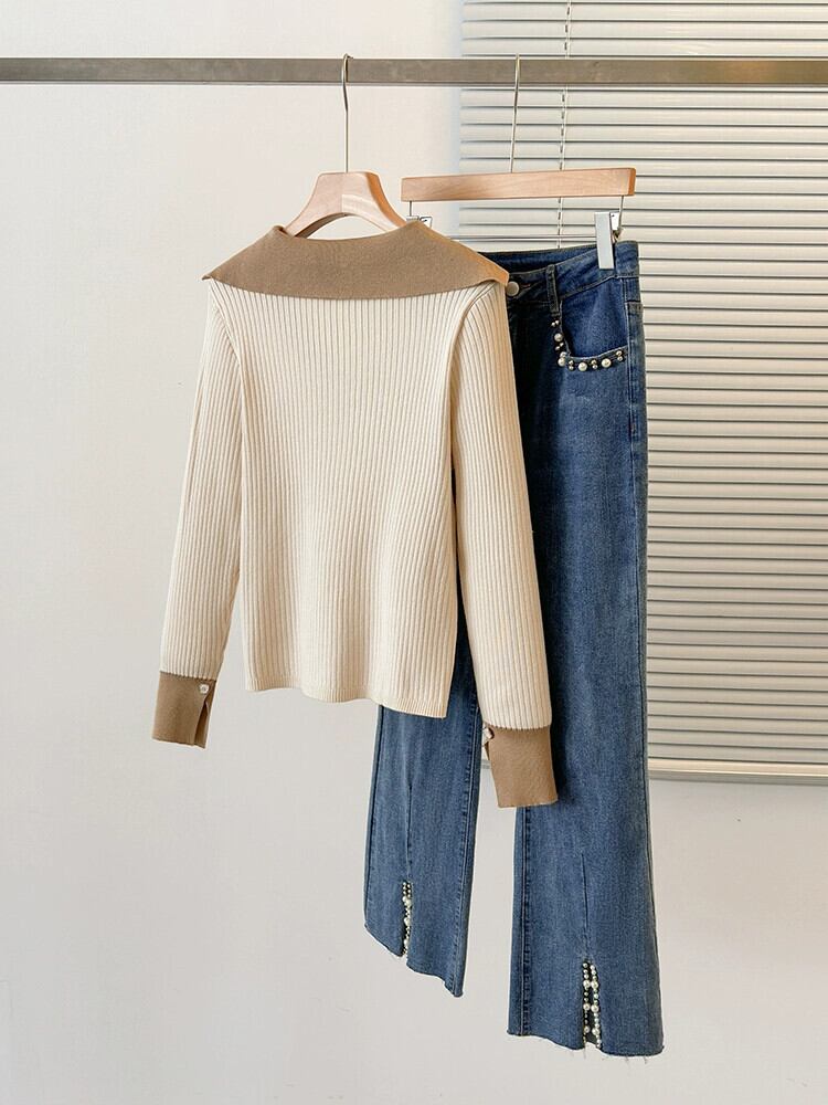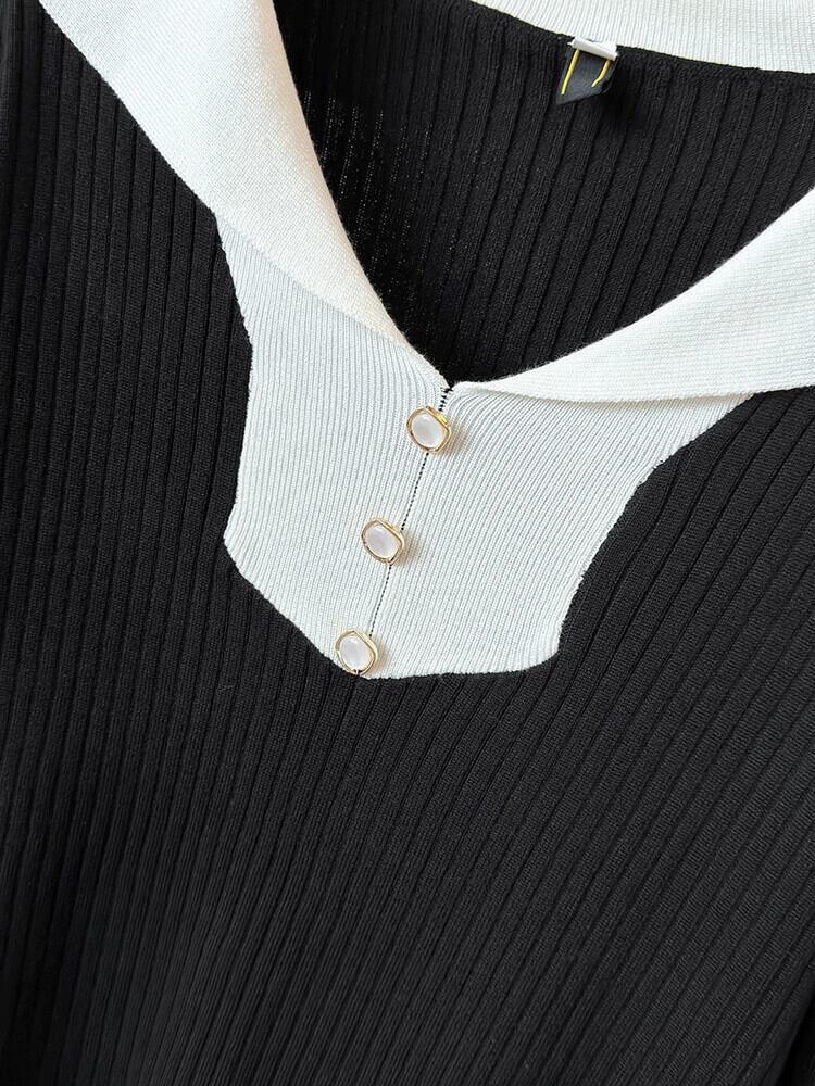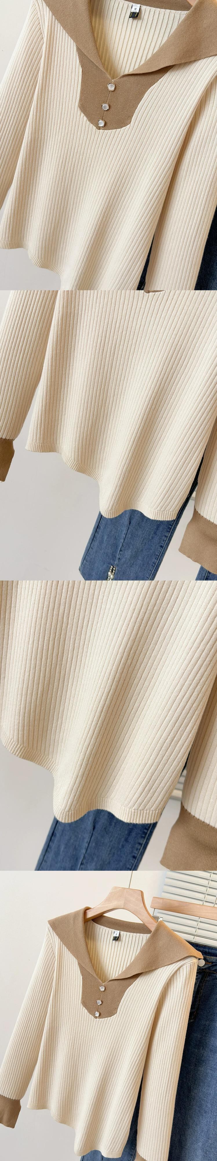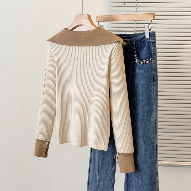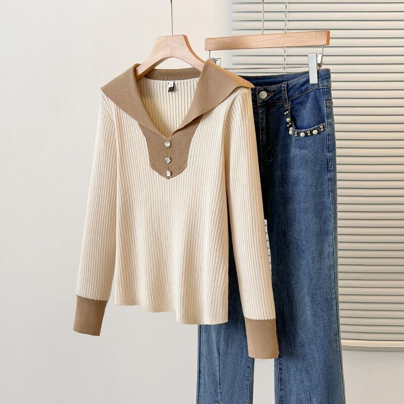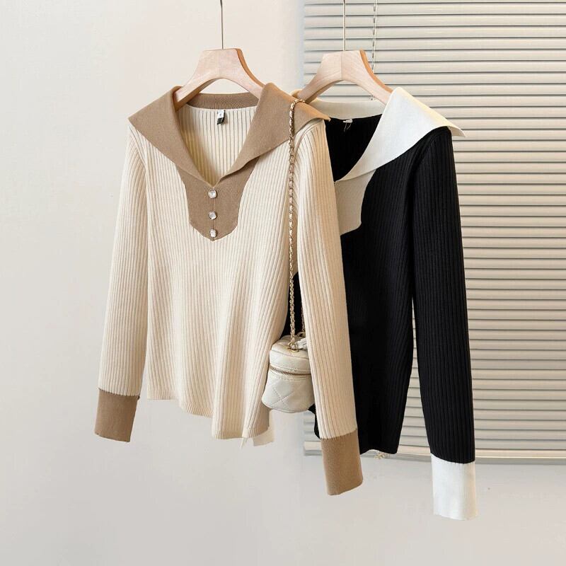 女性の大きいサイズのセーター 2023 新しい秋のスタイル脂肪多用途肌をカバーし、痩身ハーフオープンカラー長袖コントラストセーター ロング 大きめサイズ オータム 秋物 8884152437317674