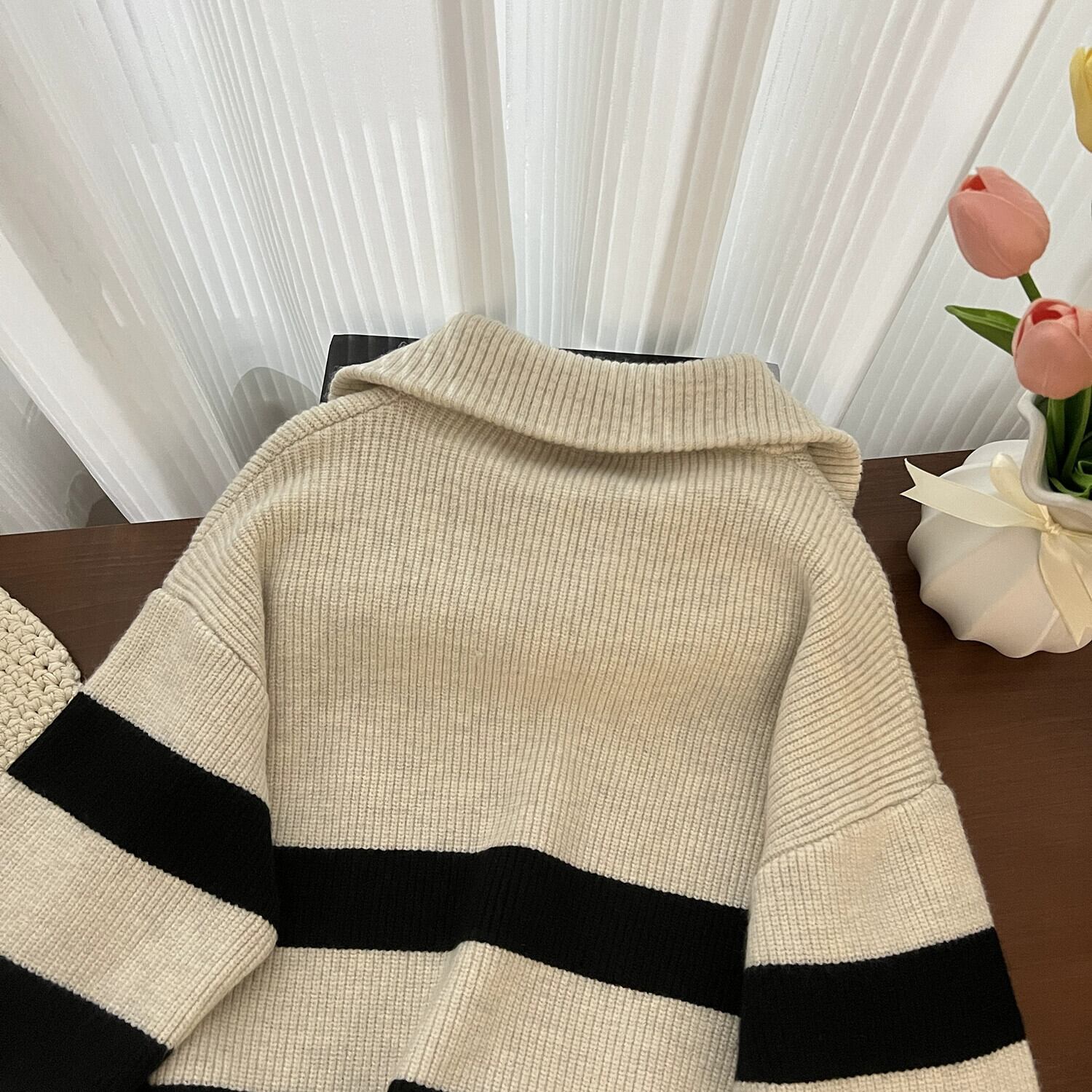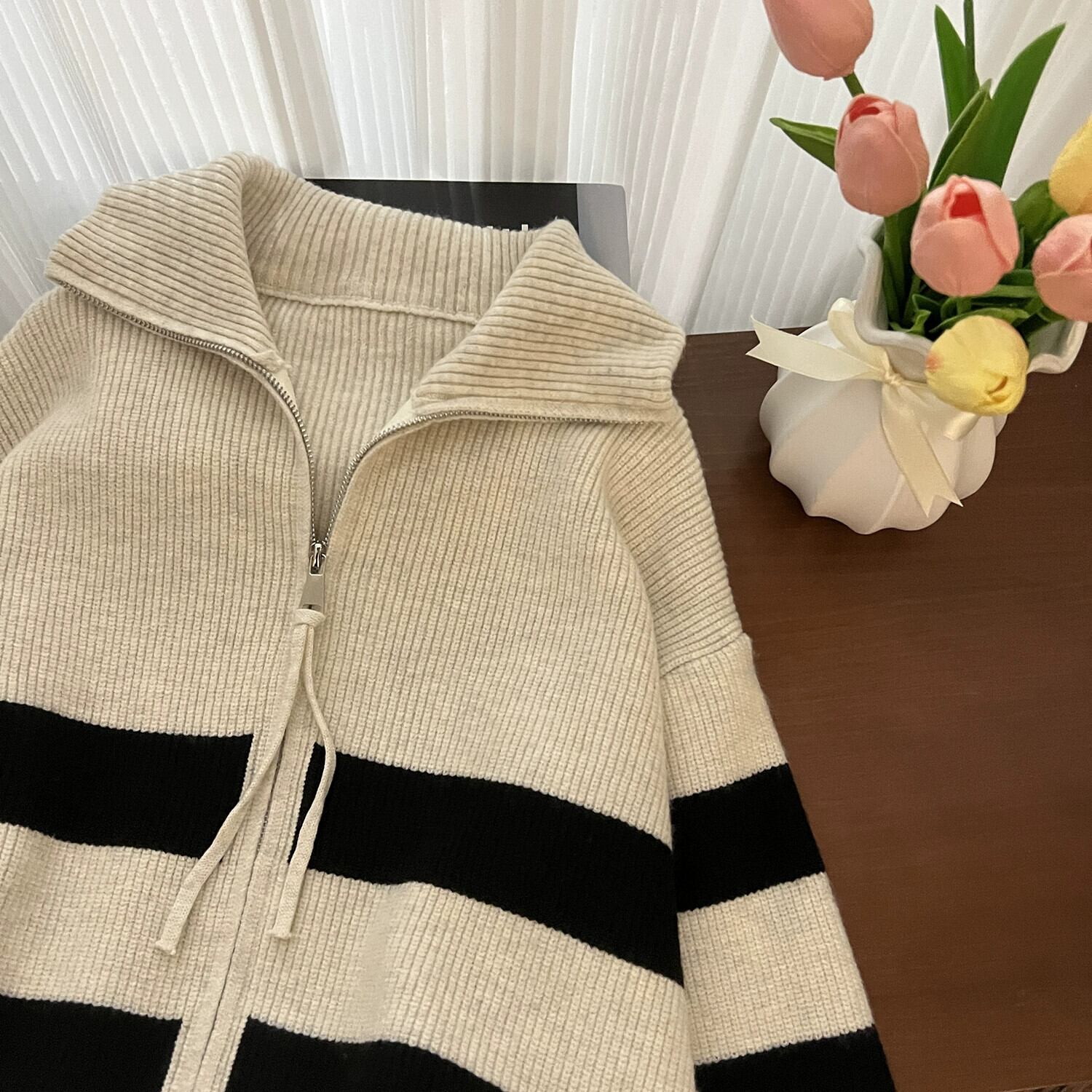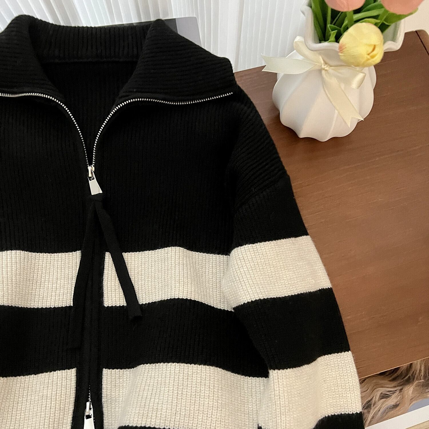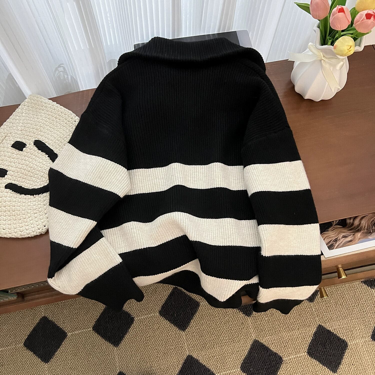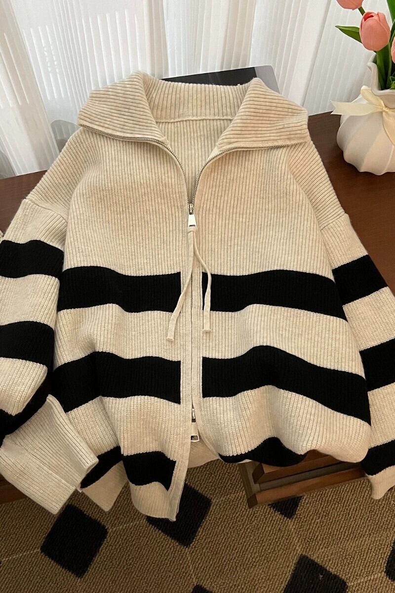 大きいサイズ秋スタイルストライプセーターコート脂肪ミリメートル女性の怠惰なスタイル痩身肥厚ニットジッパーカーディガントップ 大きめサイズ オータム 秋物 888415479151236