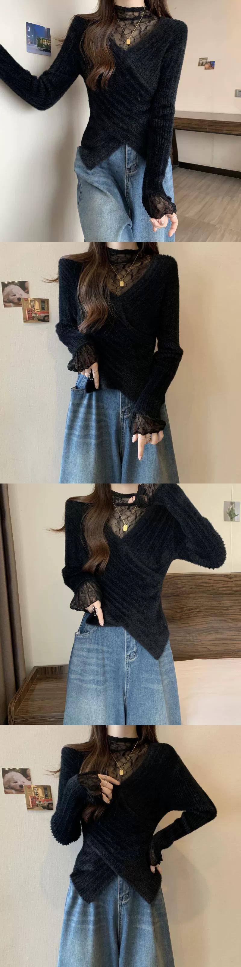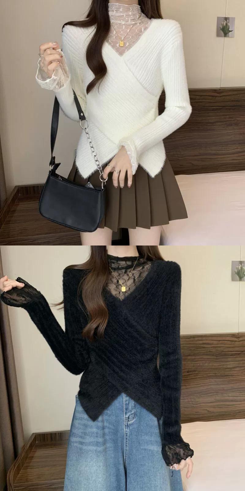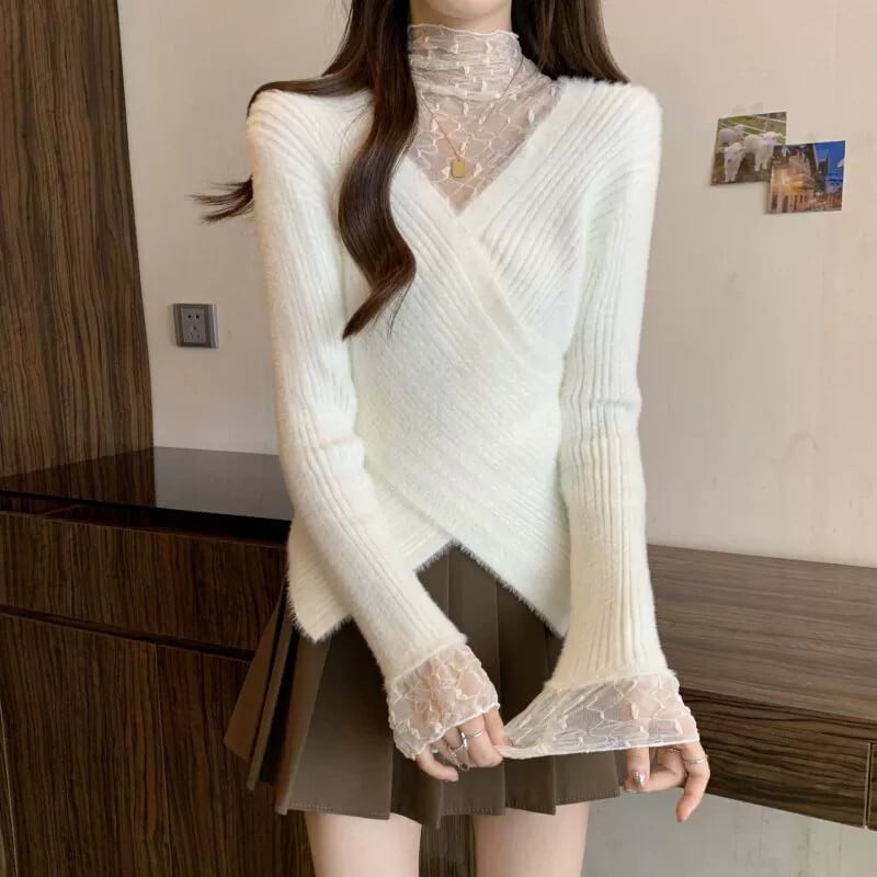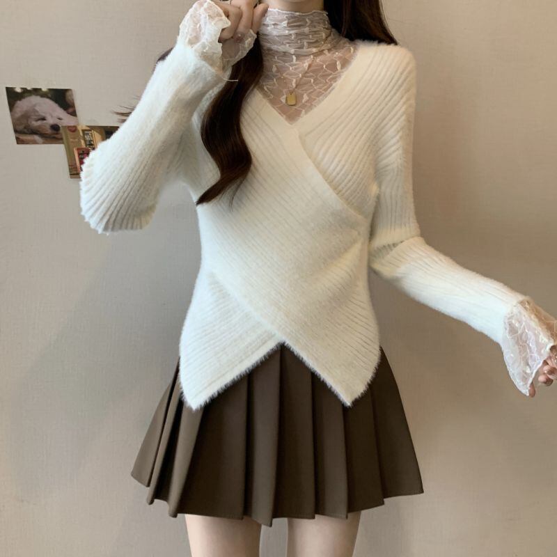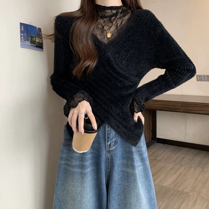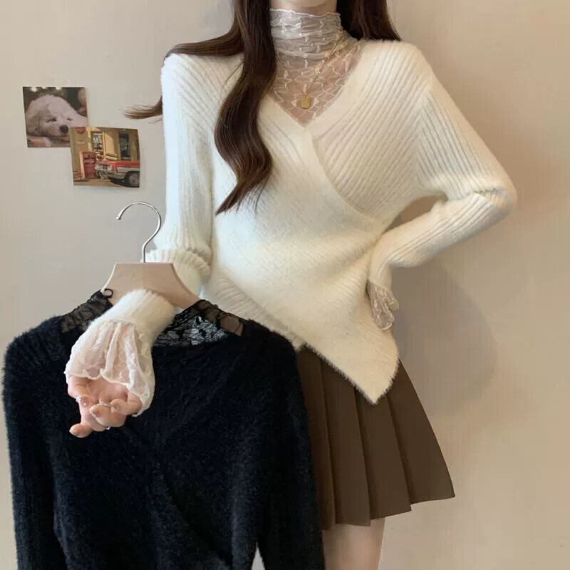 大きいサイズの女性のセーターの女性の秋冬 2023 新しいファット MM デザインフェイクツーピースレースステッチ非対称裾 大きめサイズ オータム 秋物 ウィンター 冬物 8884148047631262